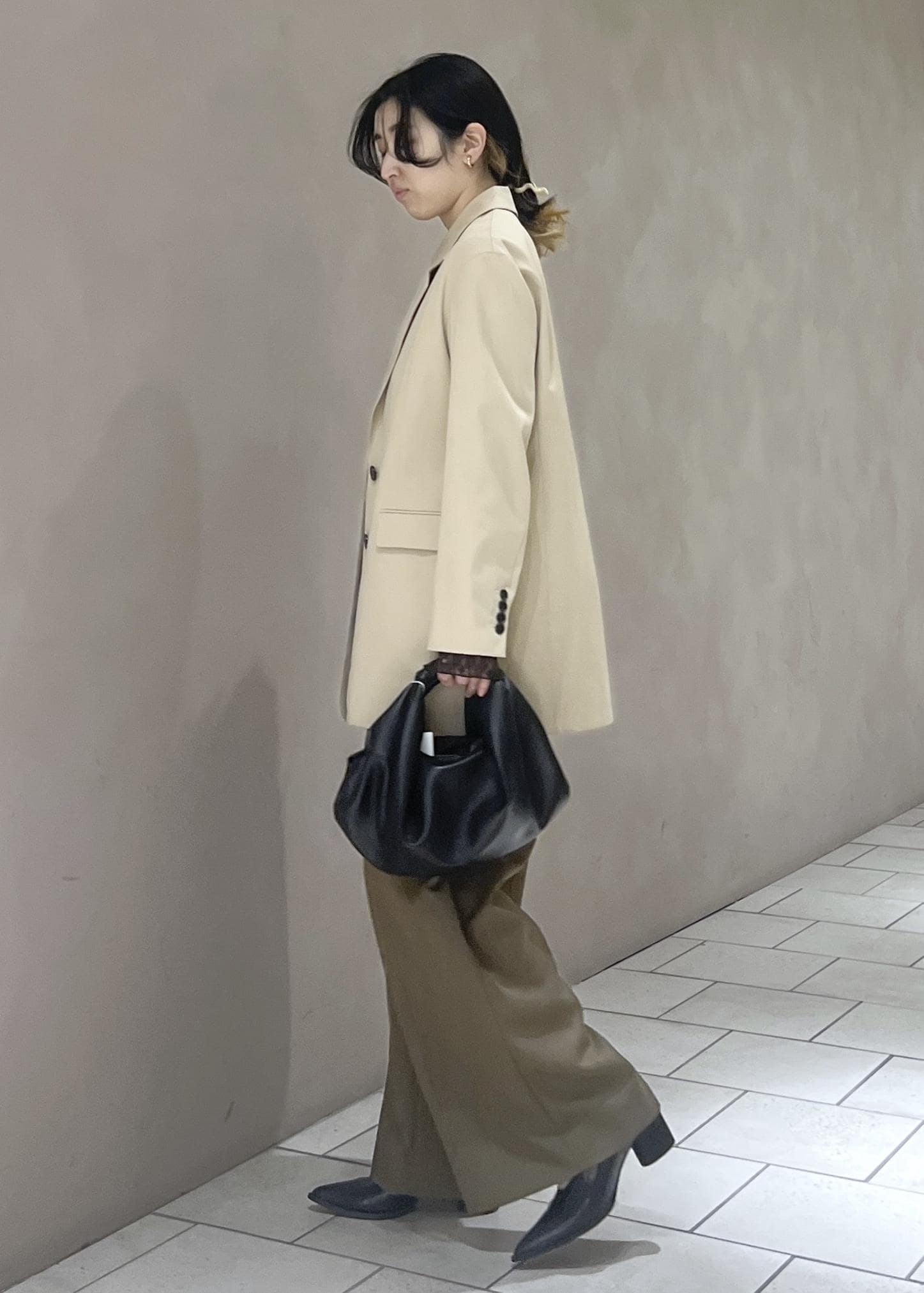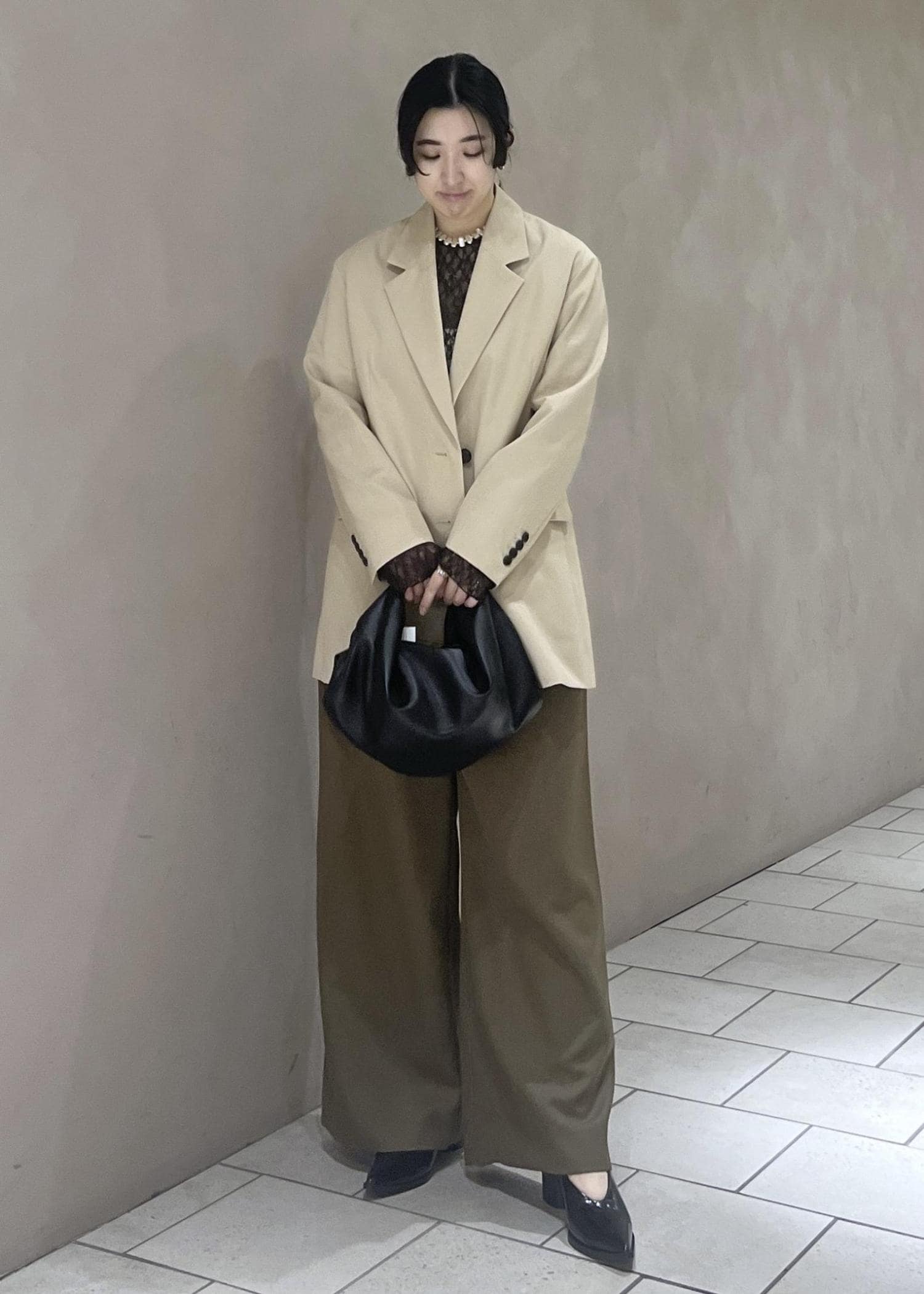 上品な素材感がシルエットの抜け感を補ってくれるので