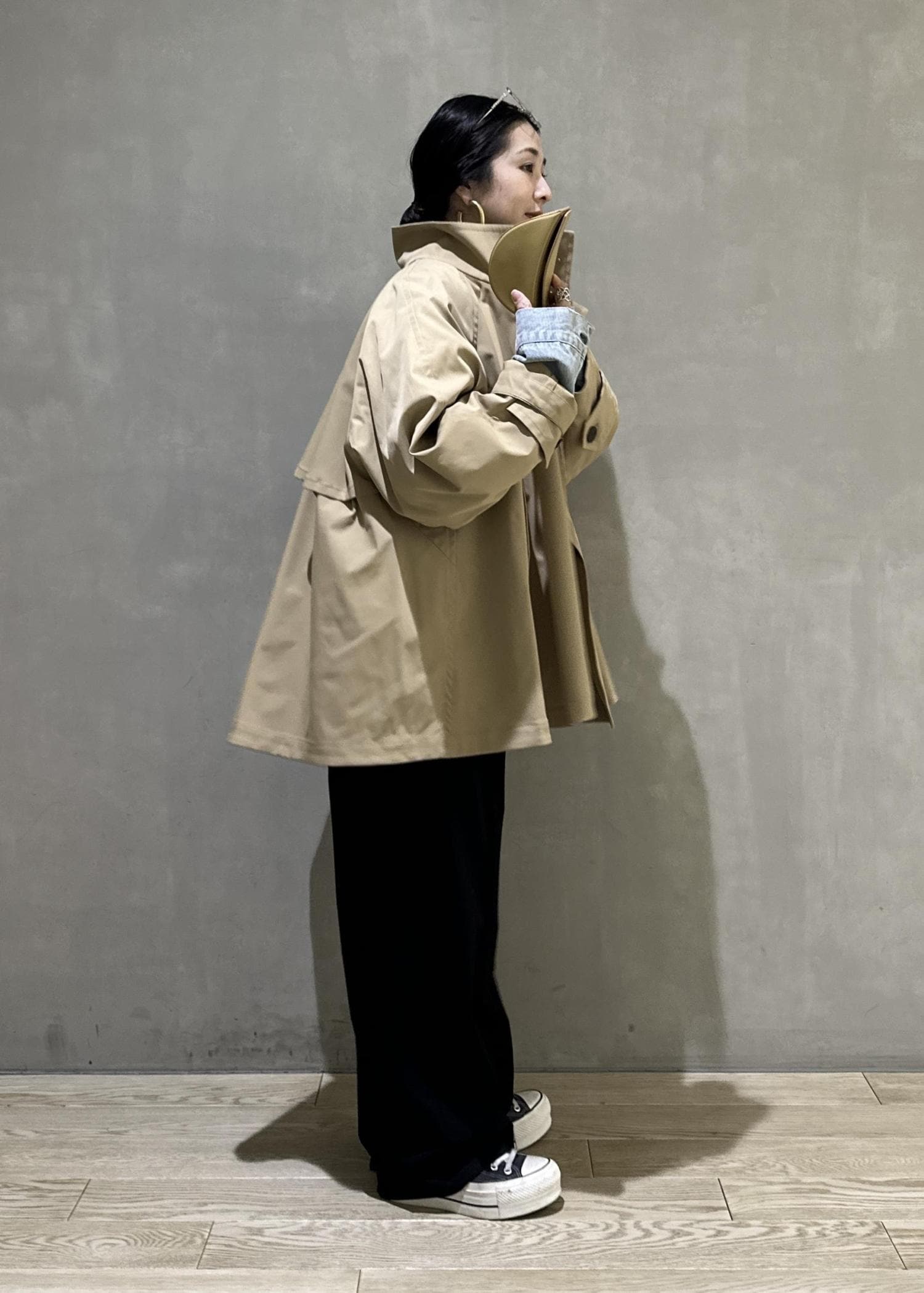 とはいえ、1月、2月デニムジャケットだけだと防寒しきれないと思うので、そちらにトレンチをプラス。