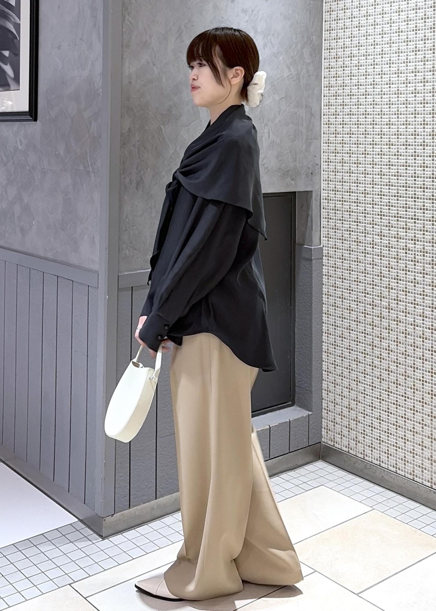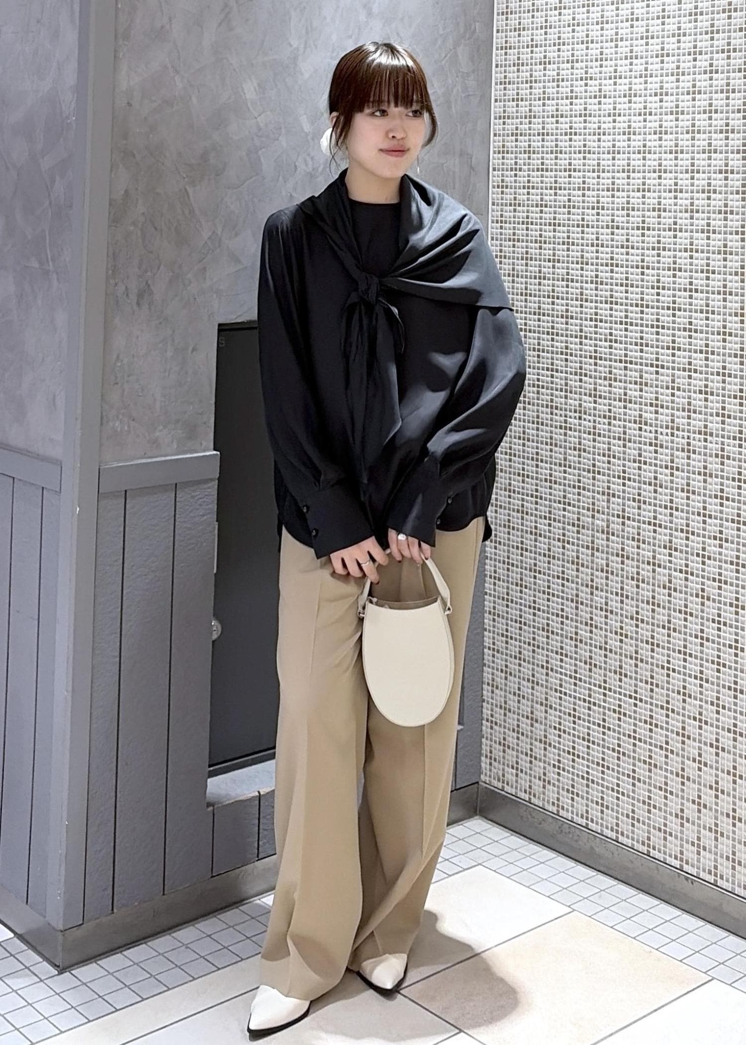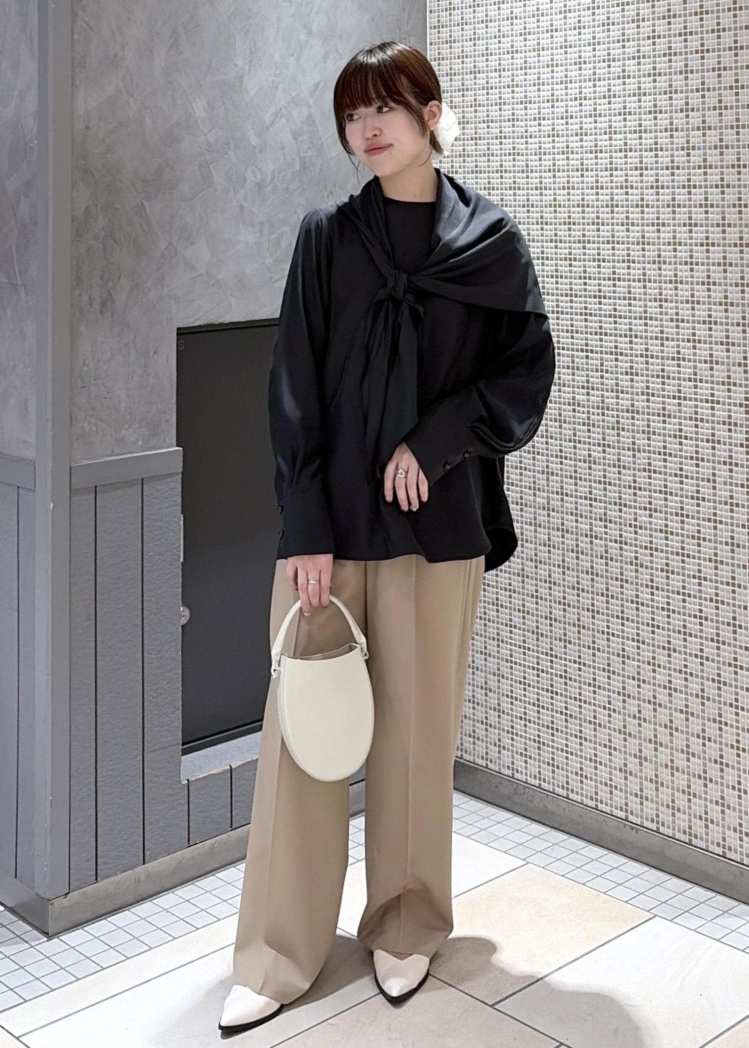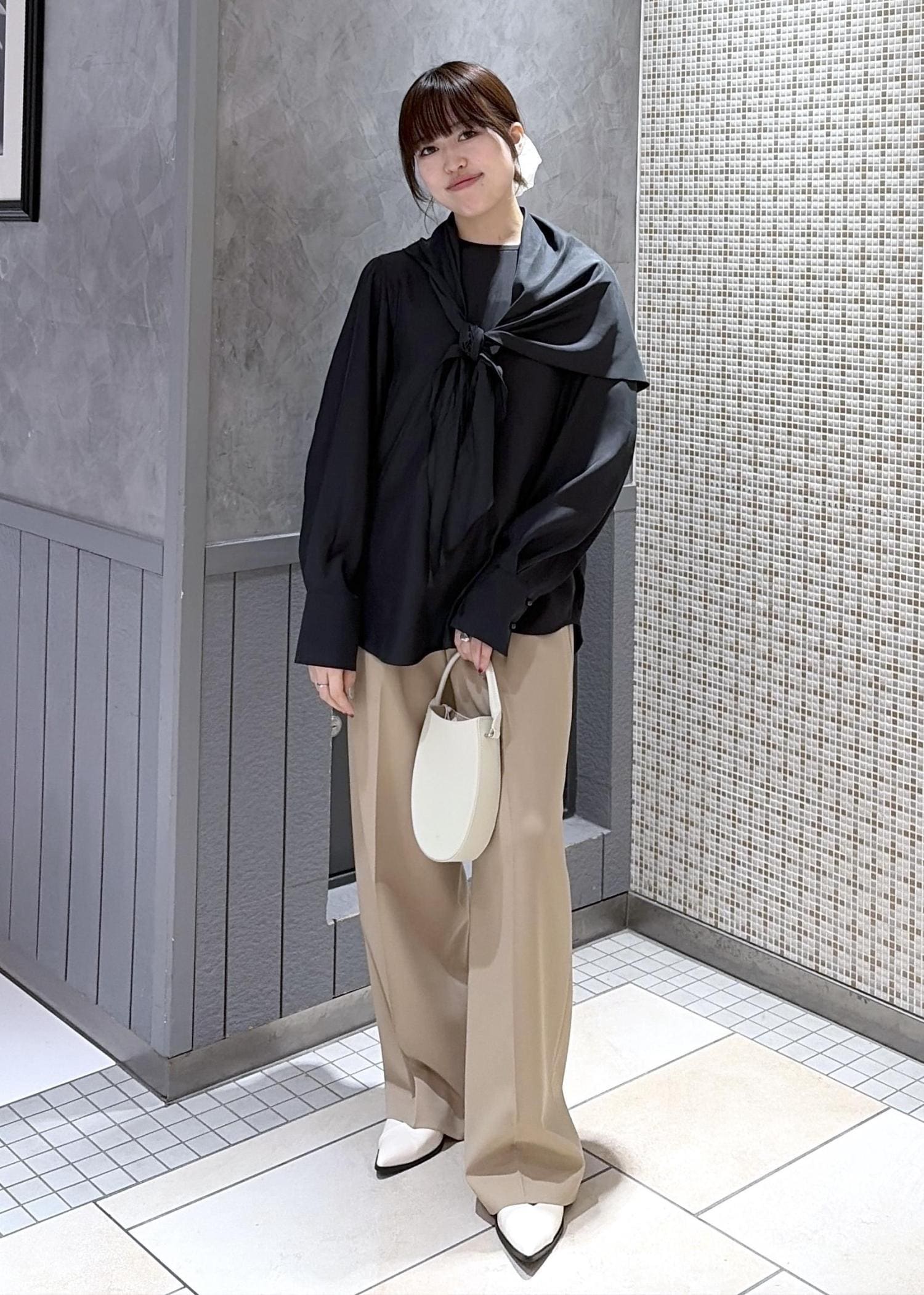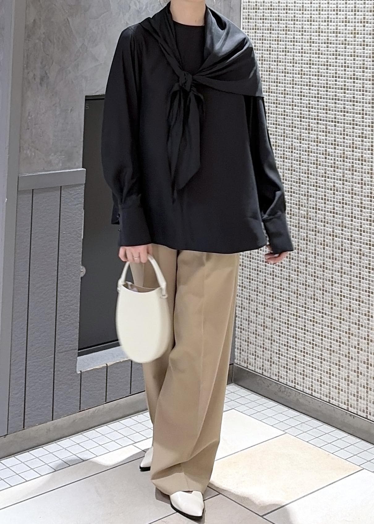 今回はフィブリルロンTEEスカーフブラウスを着用し、オフィスコーデを組んでみました。スカーフを自在にできるのもうれしいポイントです♩