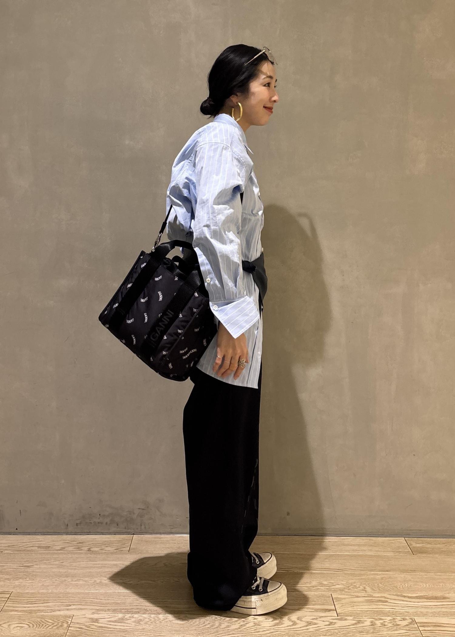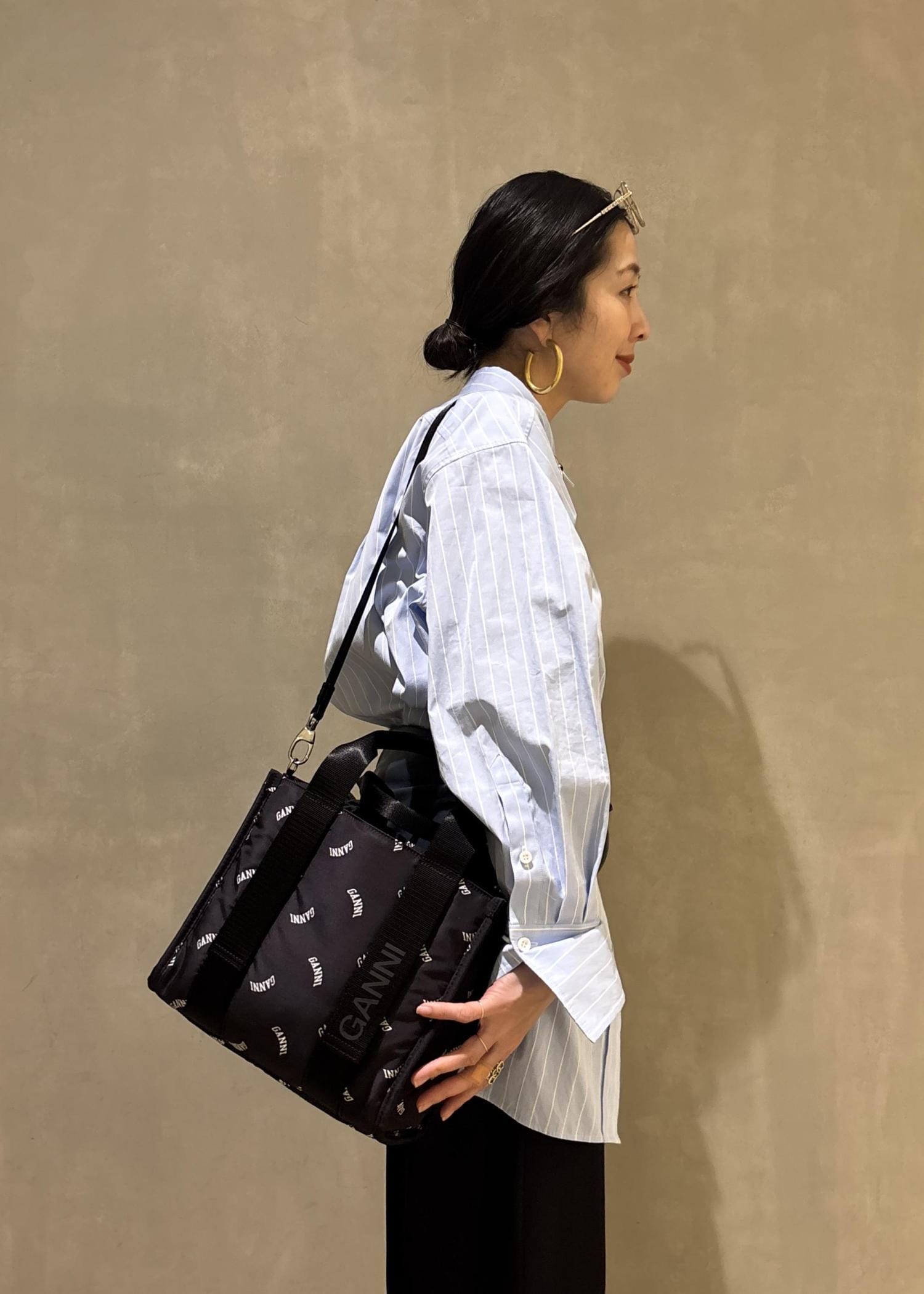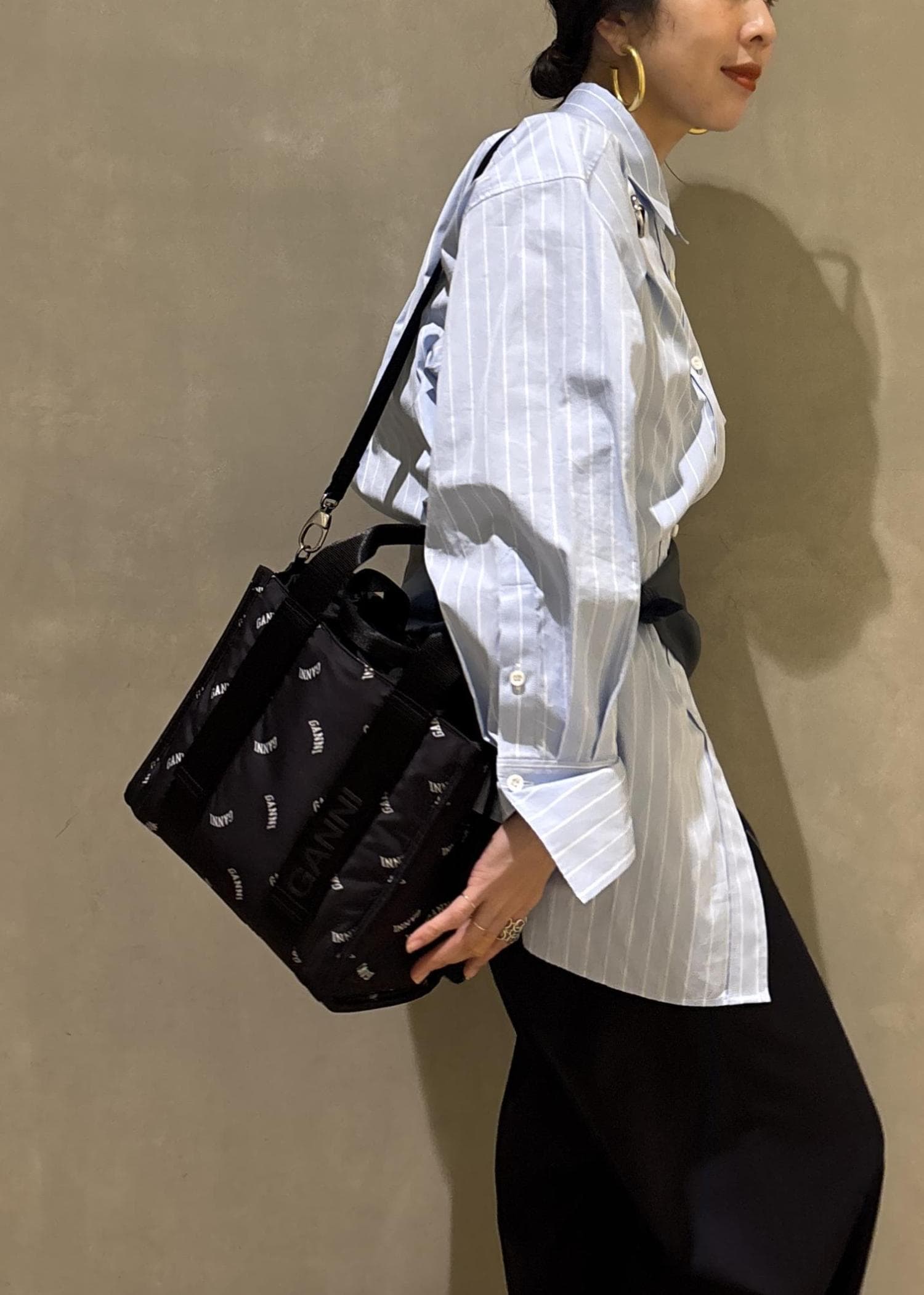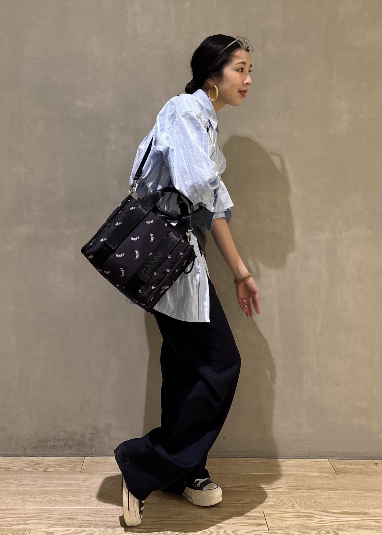 モノトーンにGANNIのロゴがポイントになるこちらのトートバッグ。シンプルながら、少しスポーティさのあるデザインで、ベーシックなスタイリングのアクセントになりとってもおすすめですよ!