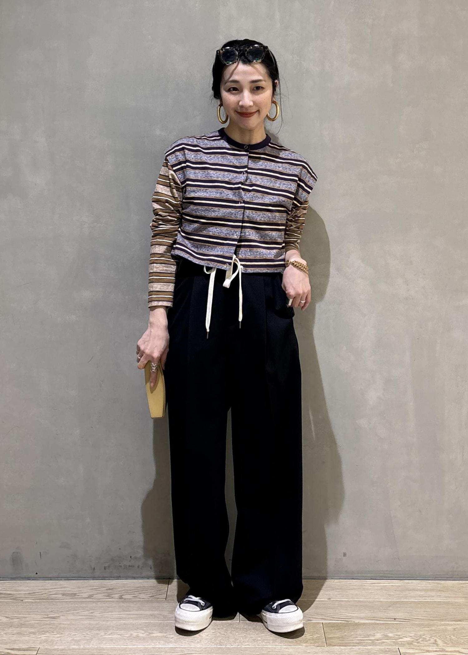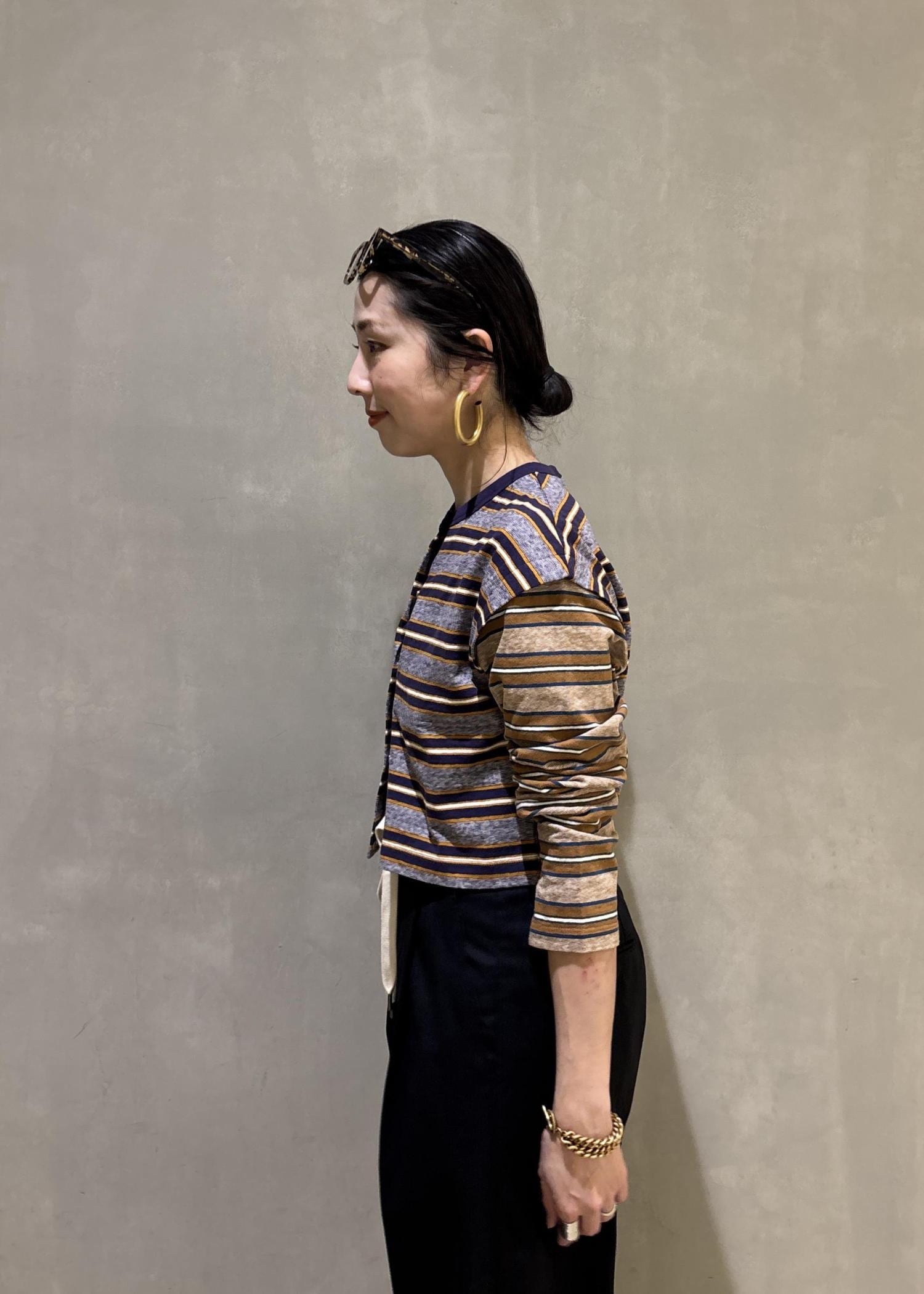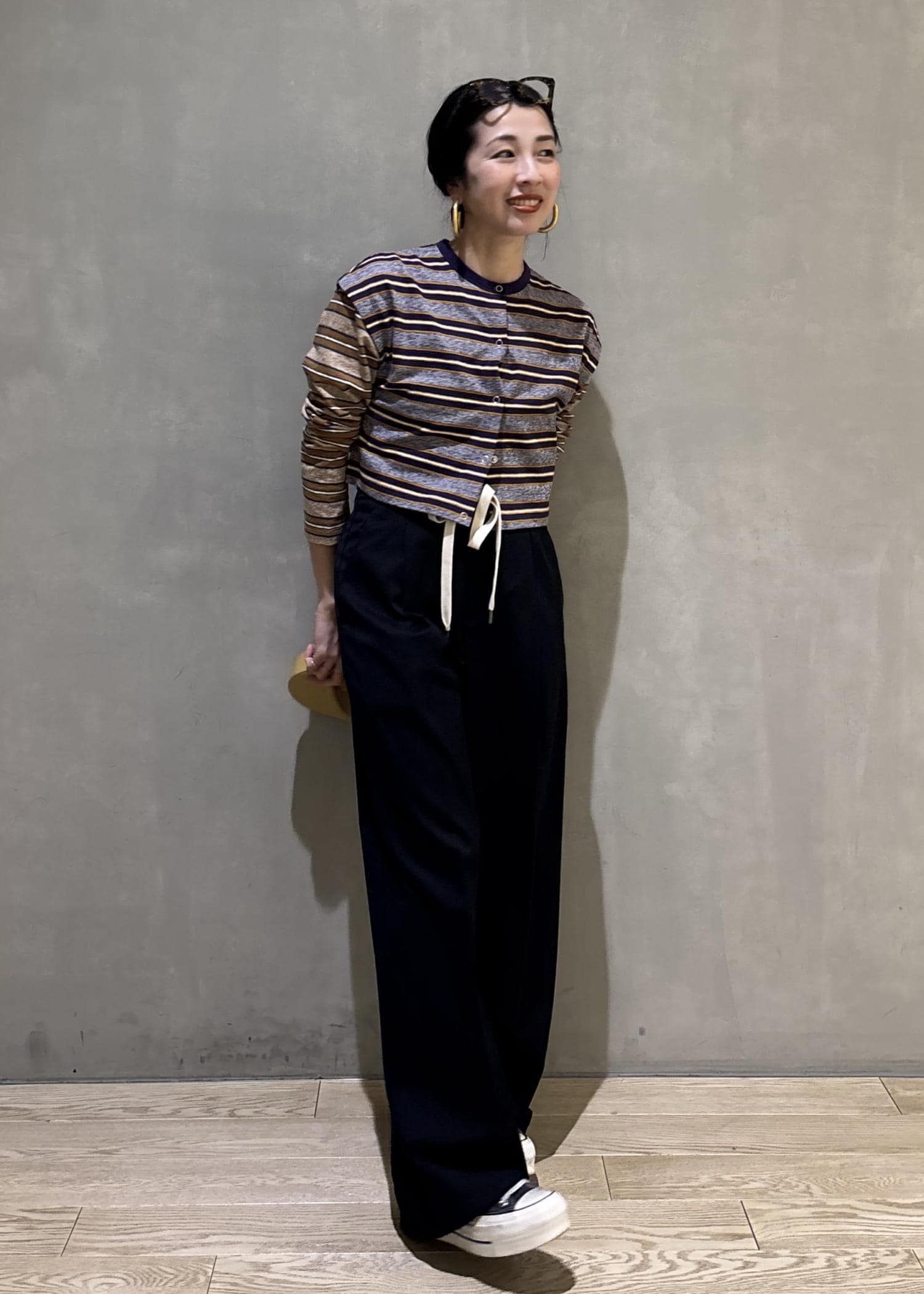 そちらにボーダーのトップスを合わせるだけで一気に春らしい雰囲気に。コンパクトな丈感のカーディガンとも相性よく、軽めの素材なので、春らしくコーディネートいただけますよ!