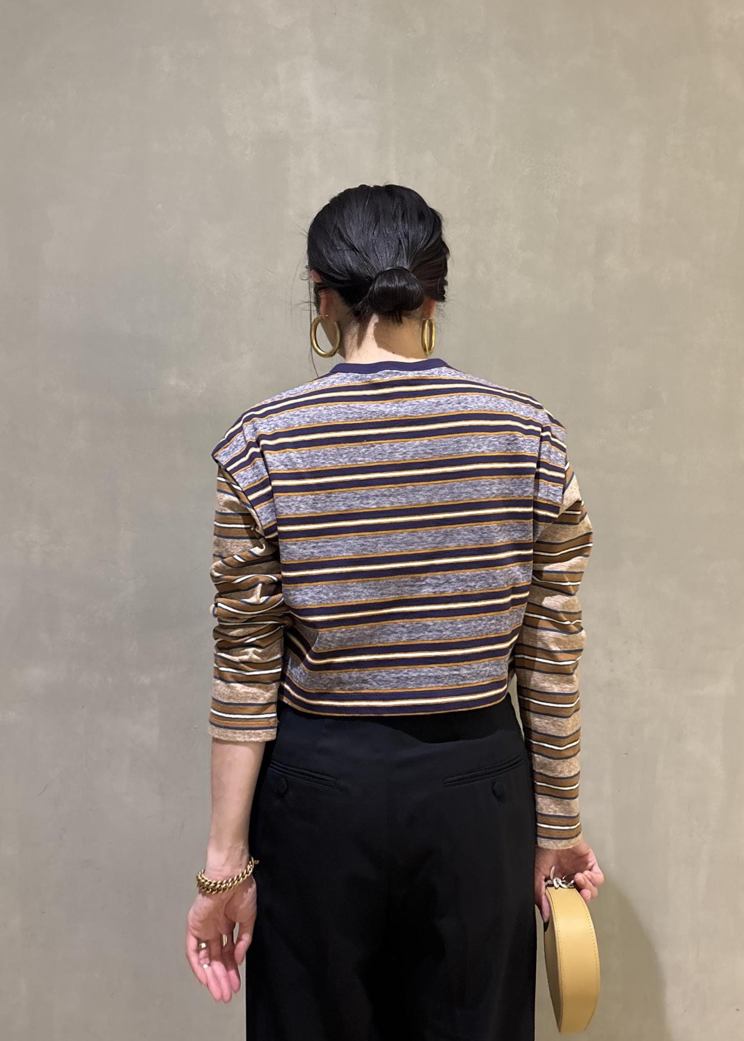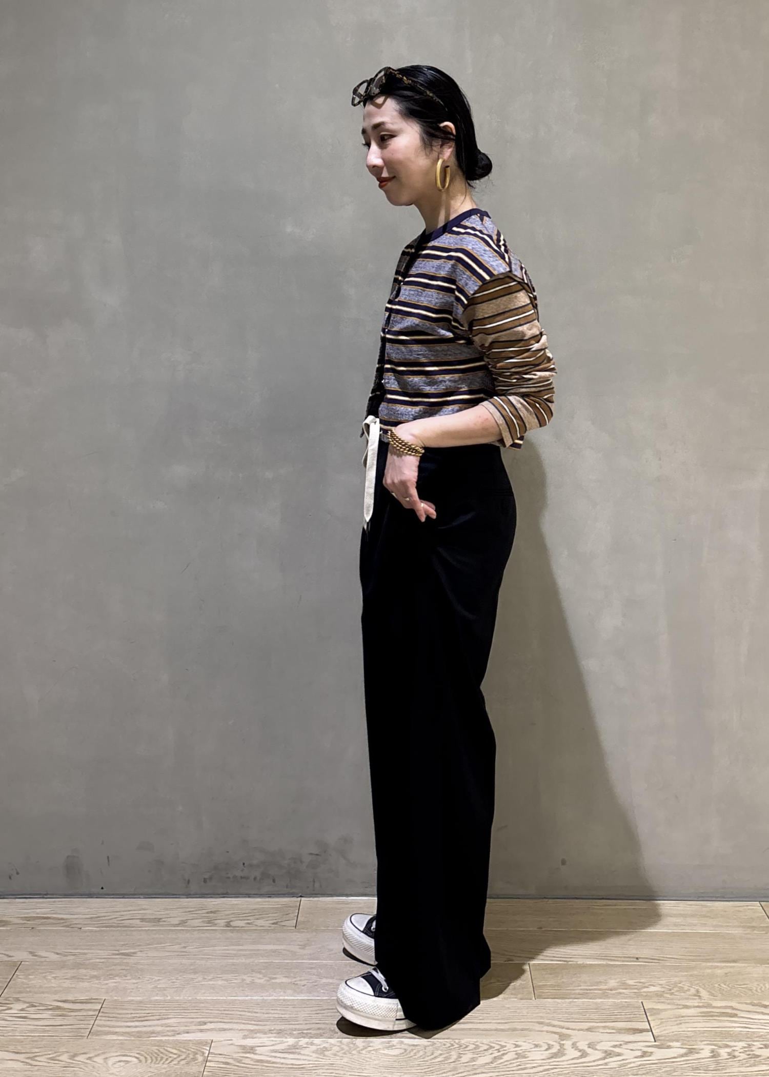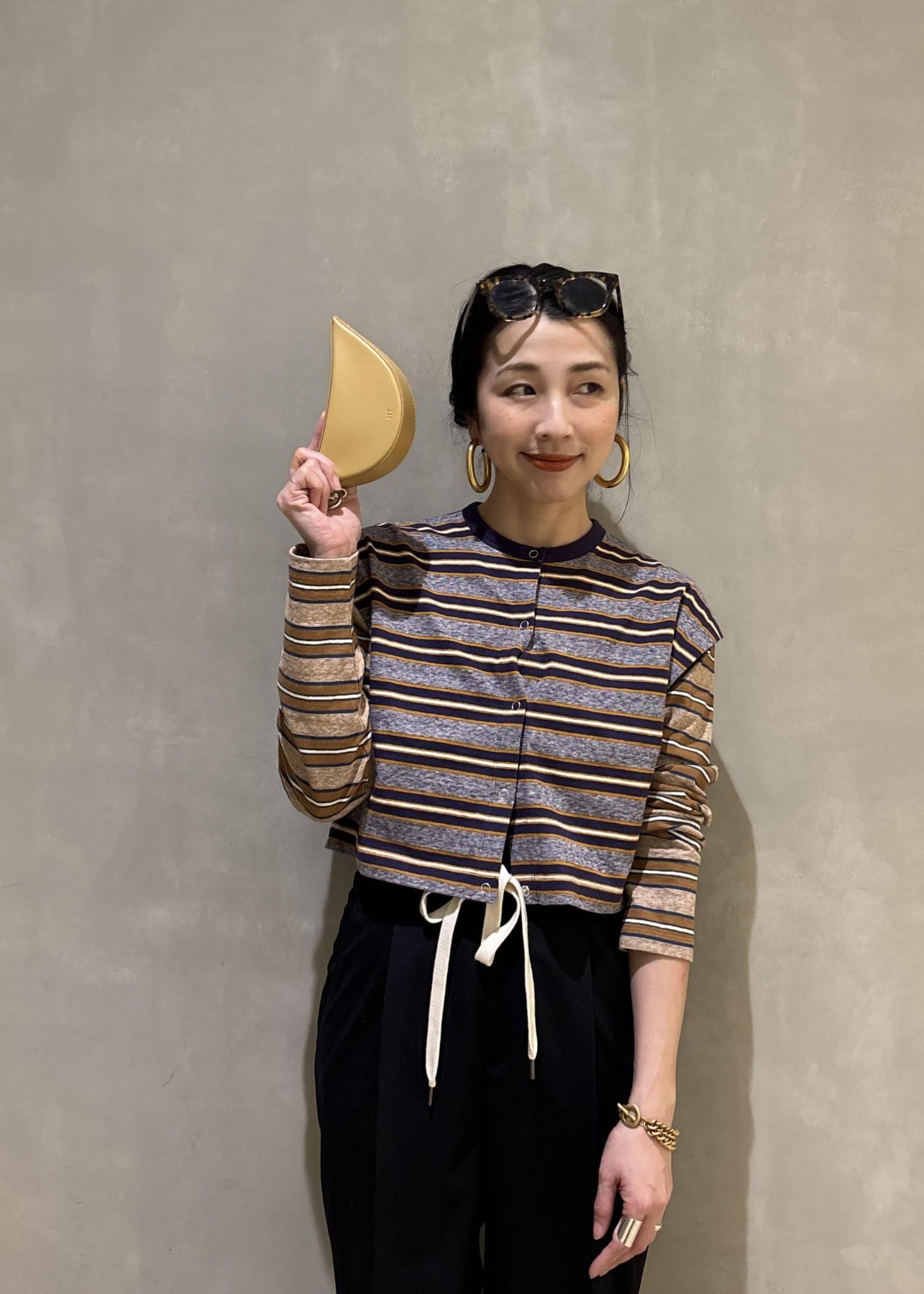 そちらにボーダーのトップスを合わせるだけで一気に春らしい雰囲気に。コンパクトな丈感のカーディガンとも相性よく、軽めの素材なので、春らしくコーディネートいただけますよ!