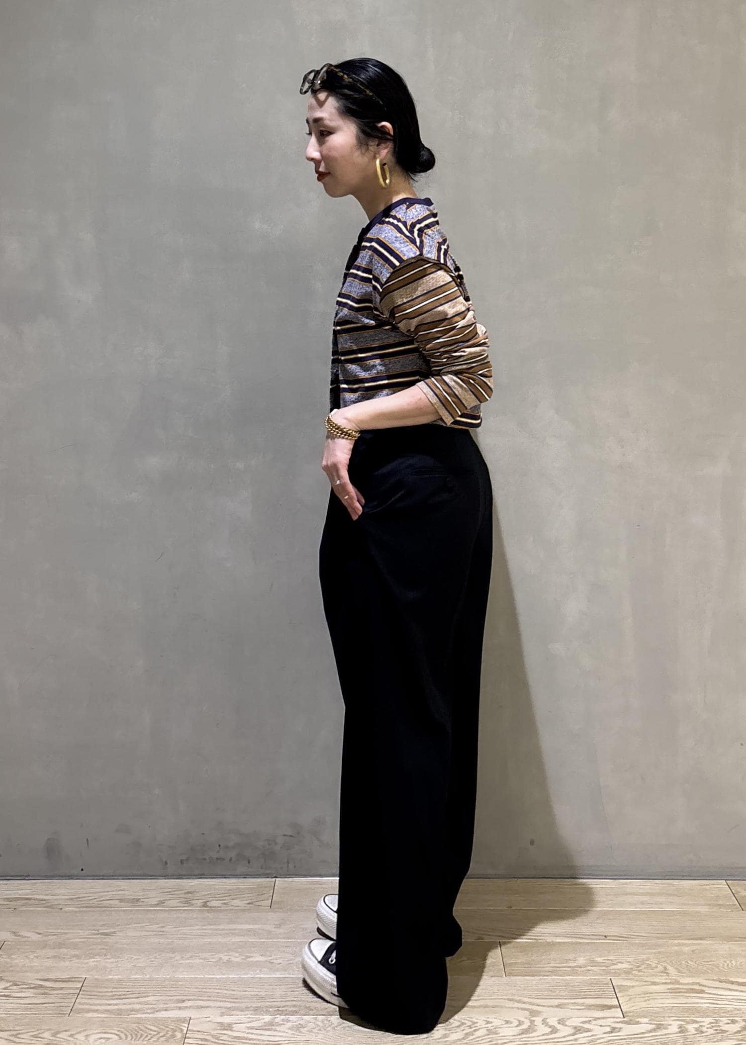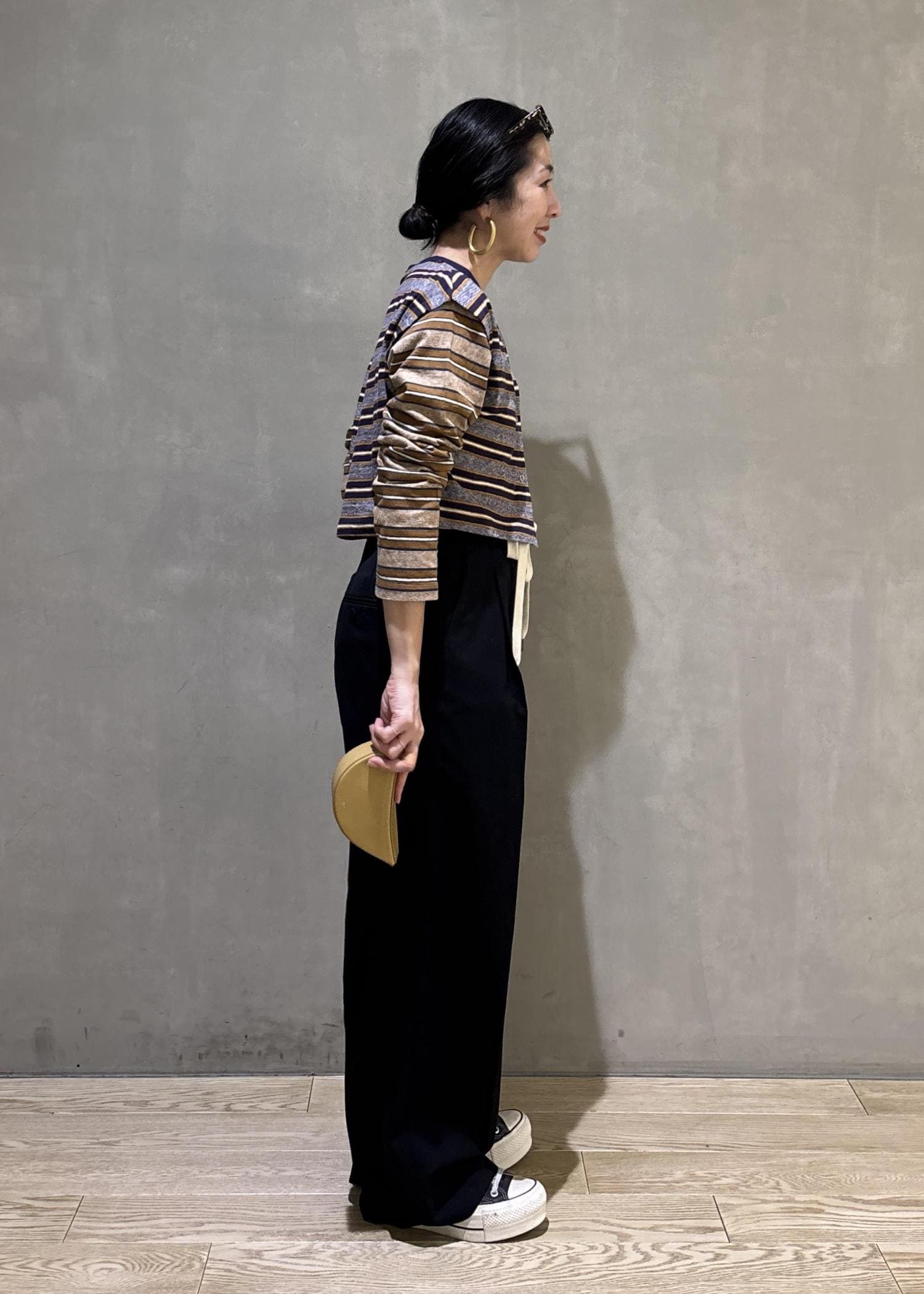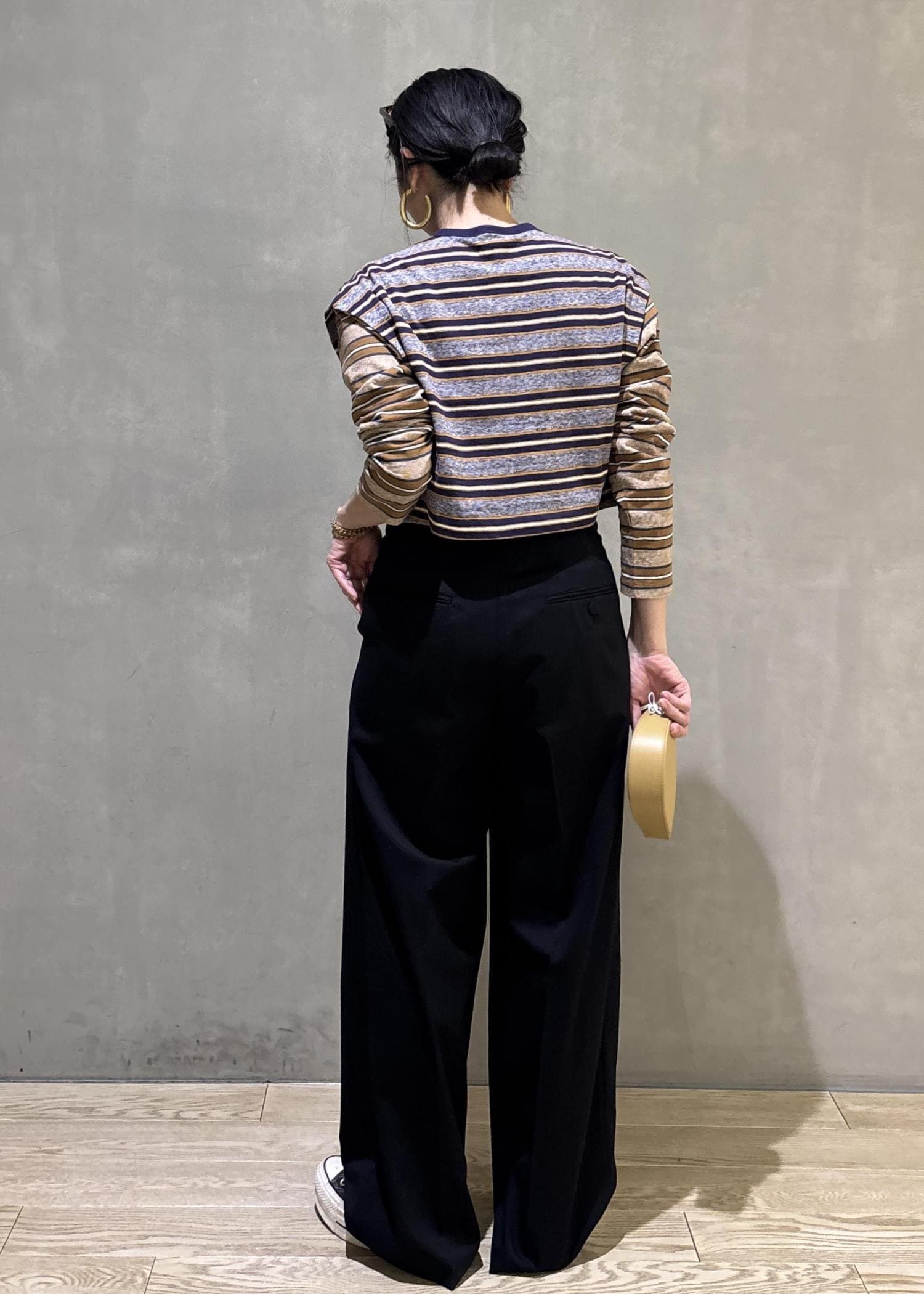 ADAM ET ROPÉ FEMMEイージースラックスブラック / 36¥22,000レビューウエストタックなので、少しゆとりがあり楽に着用できます。太さも細すぎず太すぎずの太さで、カジュアルすぎないのでお仕事着にもおすすめです。後ろゴムなので、締め付けもなくかなりストレスフリーです!!紐は取り外しができるので、テイストに合わせてつけてカジュアルダウンしたり、外してカッコよくまとめたりとアレンジできます。