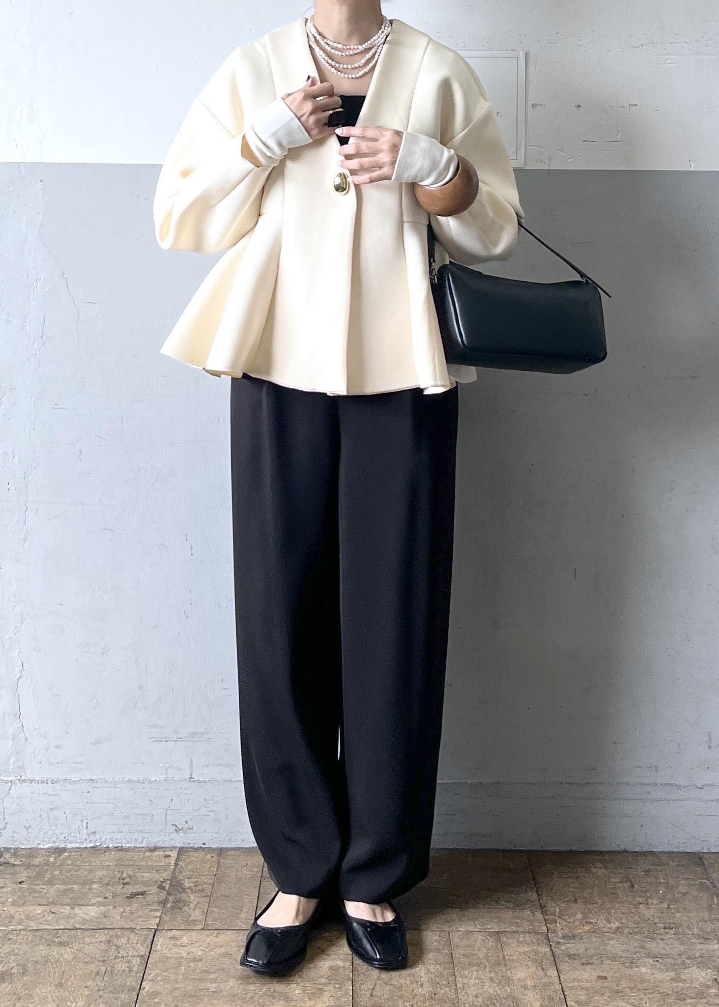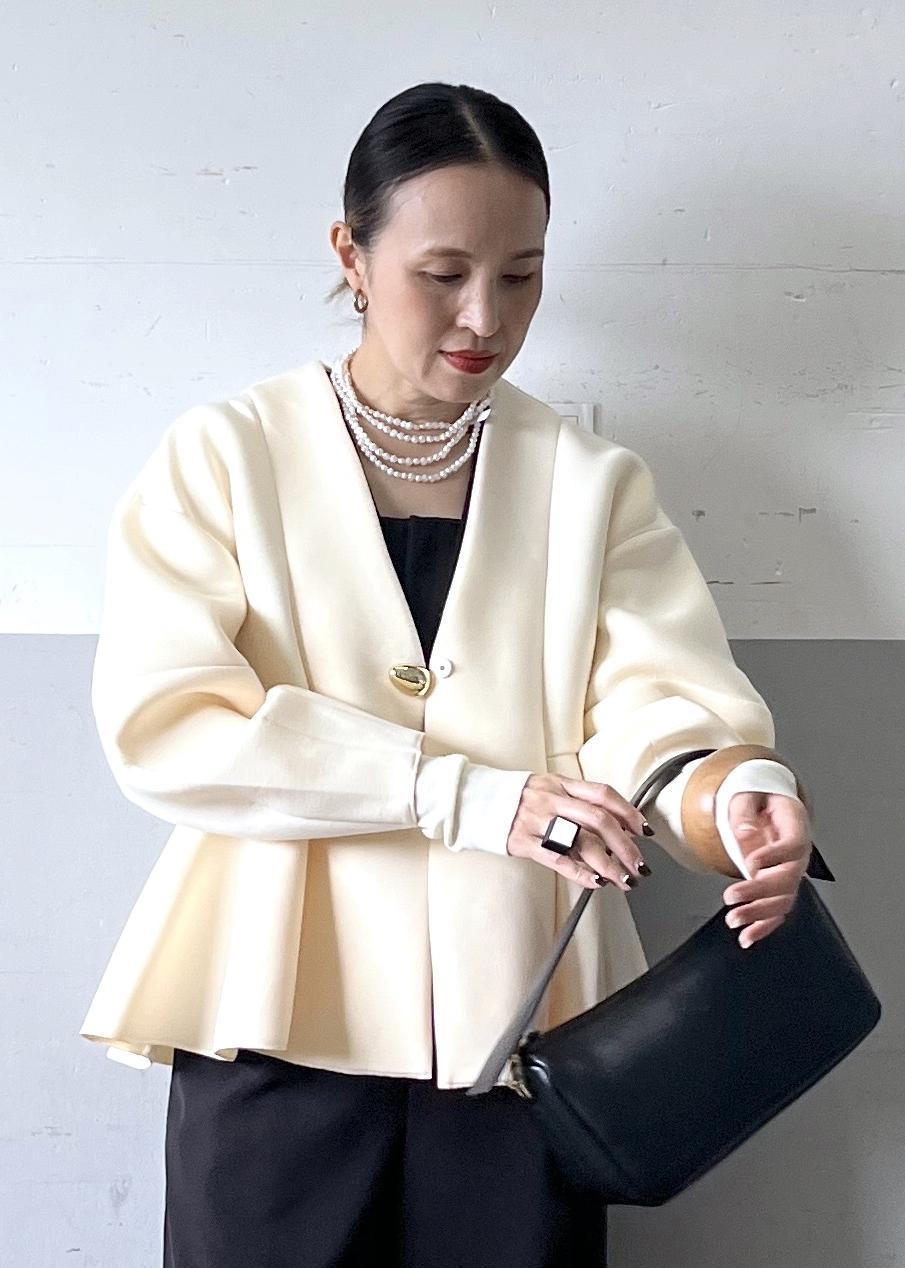 ロンパースにペプラムシルエットのジャケットを重ねることで、体のラインを拾いすぎず、自然な立体感と華やかさをプラスしました。ウエスト位置を高く見せてくれるデザインなので、スタイルアップ効果も期待できます。