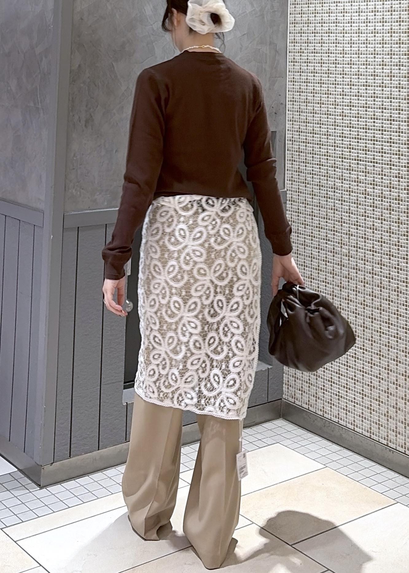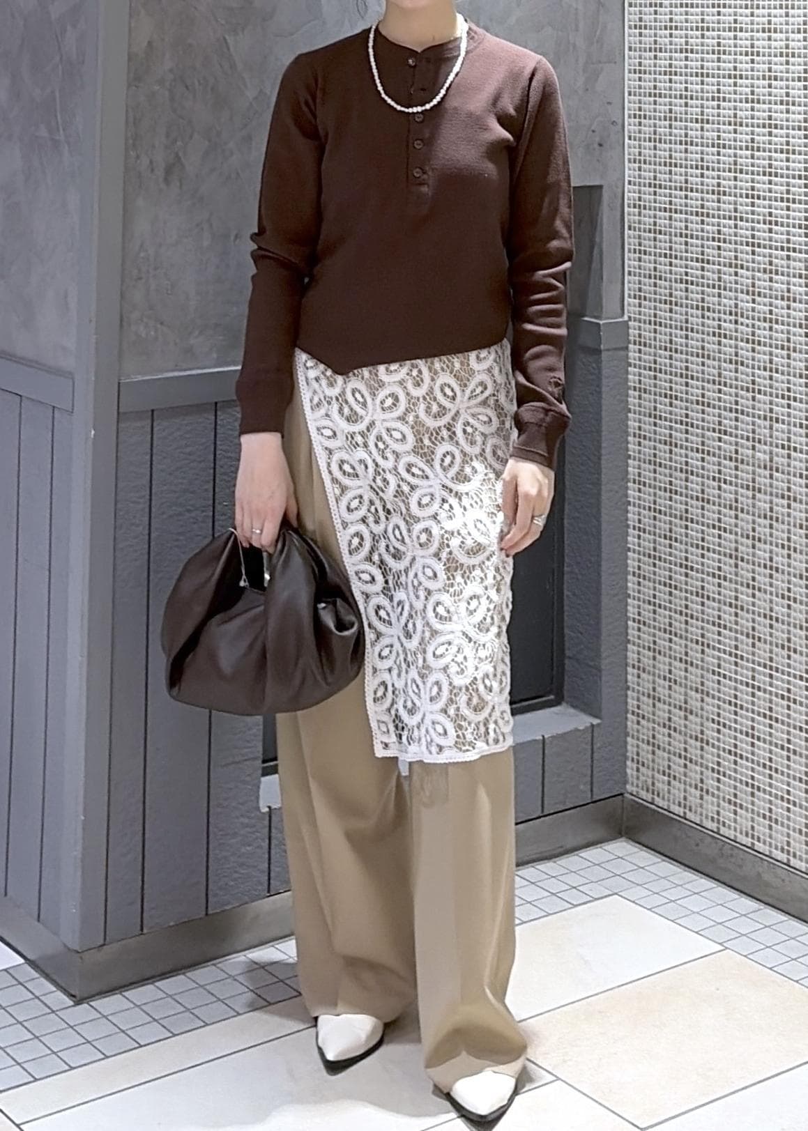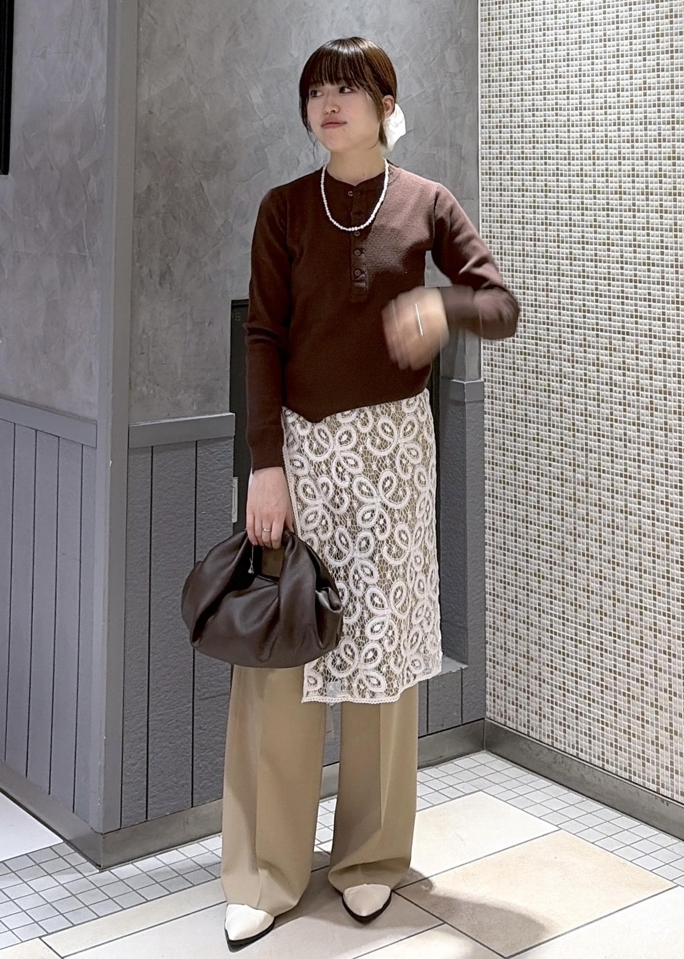 ブラウンやベージュに白の小物を足して春らしくしてみました!レースあるだけで一気に雰囲気を変えられておすすめです⭐︎