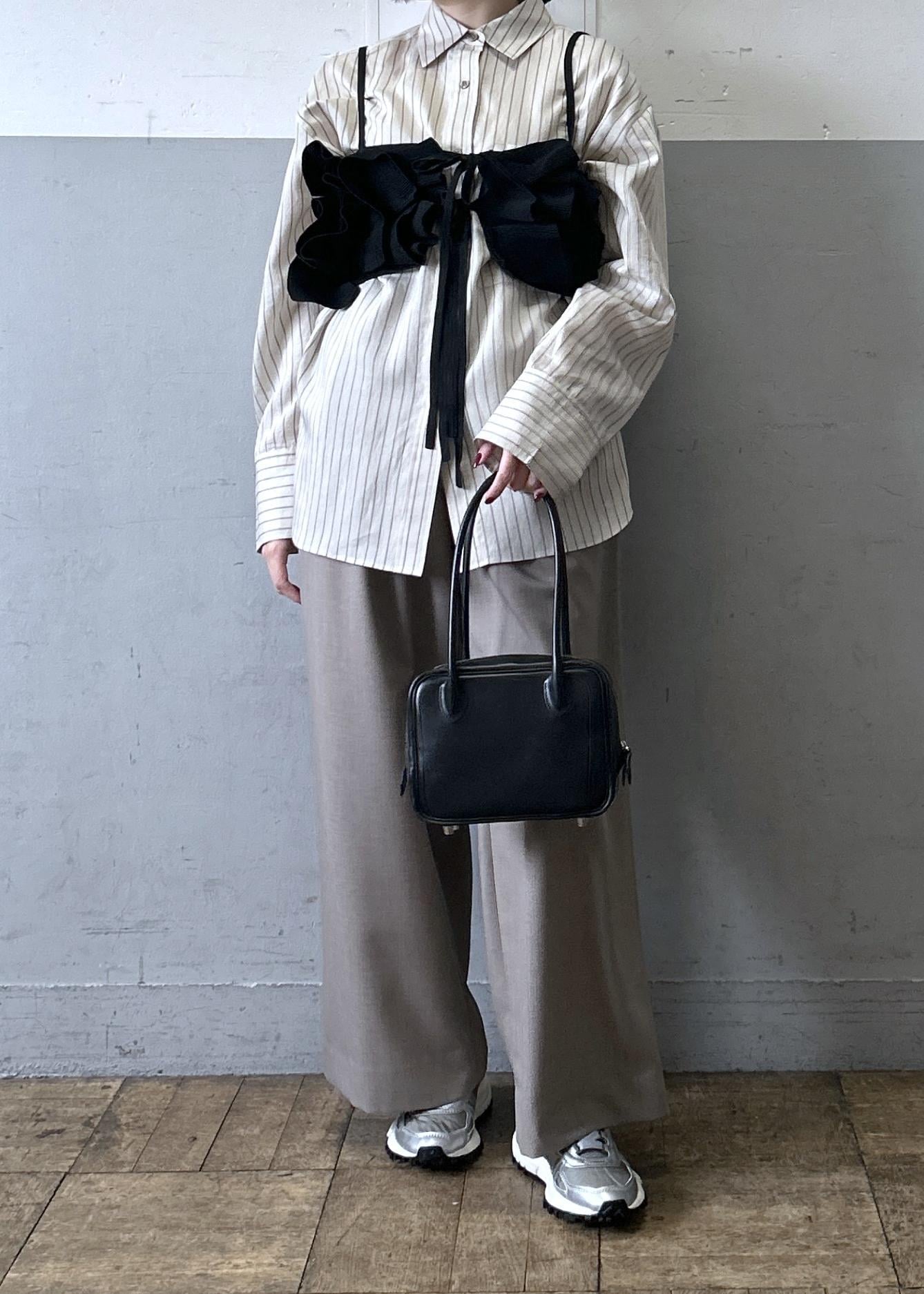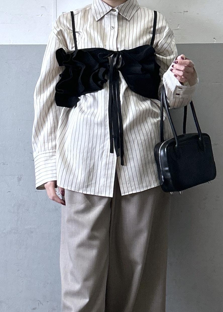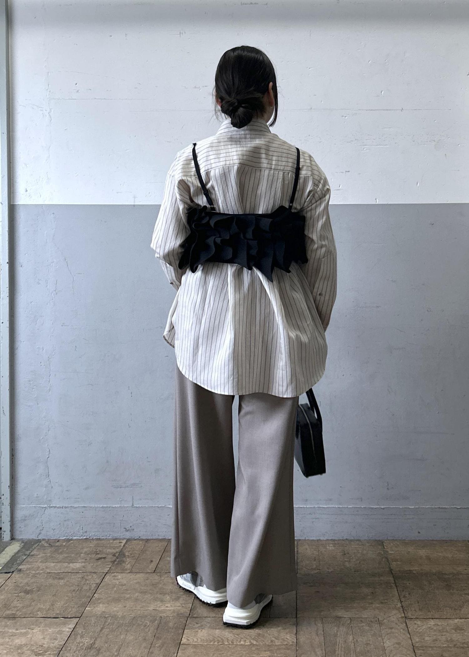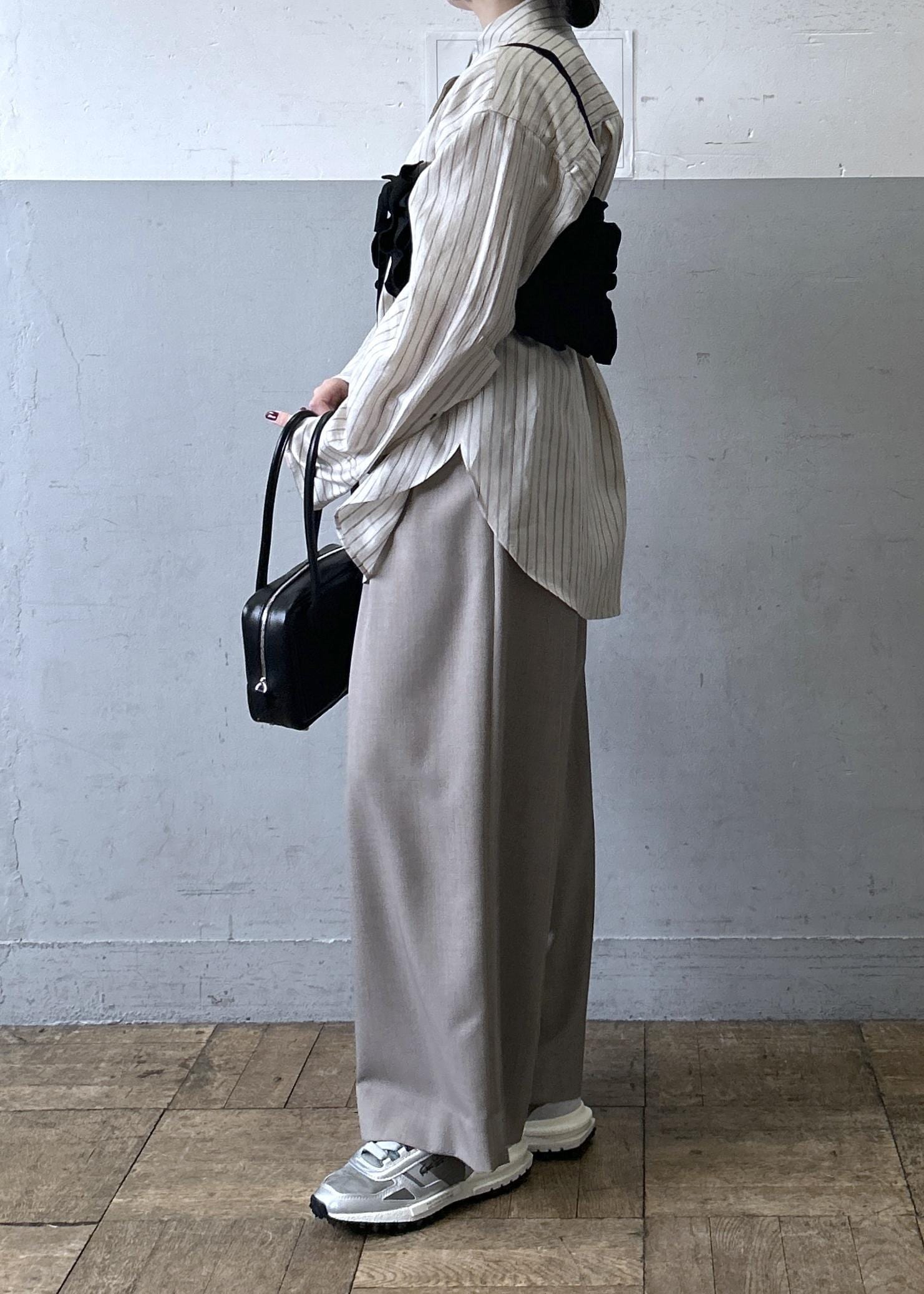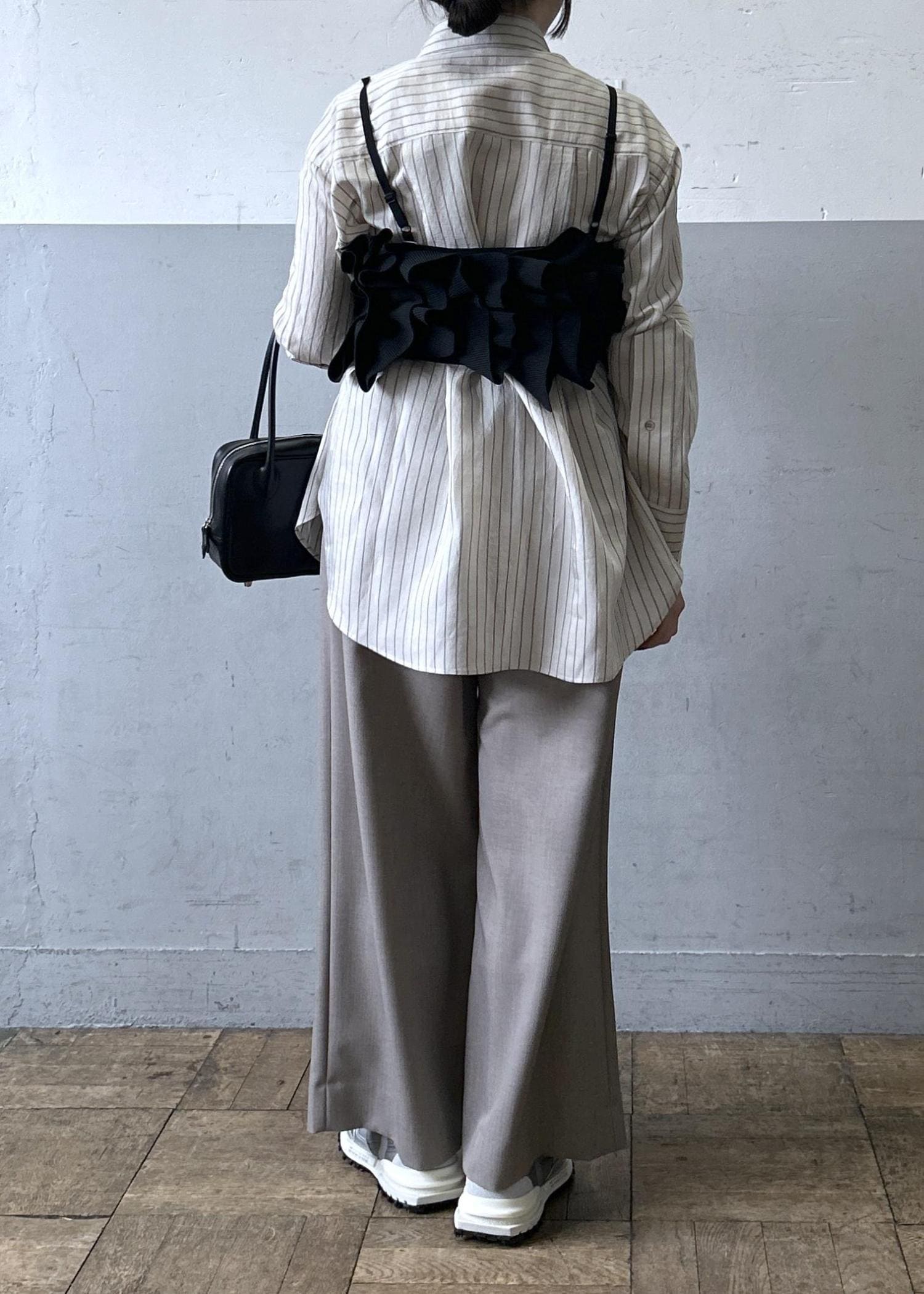 オーバーサイズシャツとワイドパンツを組み合わせると、ルーズな印象になりがちですが、ビスチェやベルトなどのアイテムをプラスするとメリハリがつくのでおすすめです♪