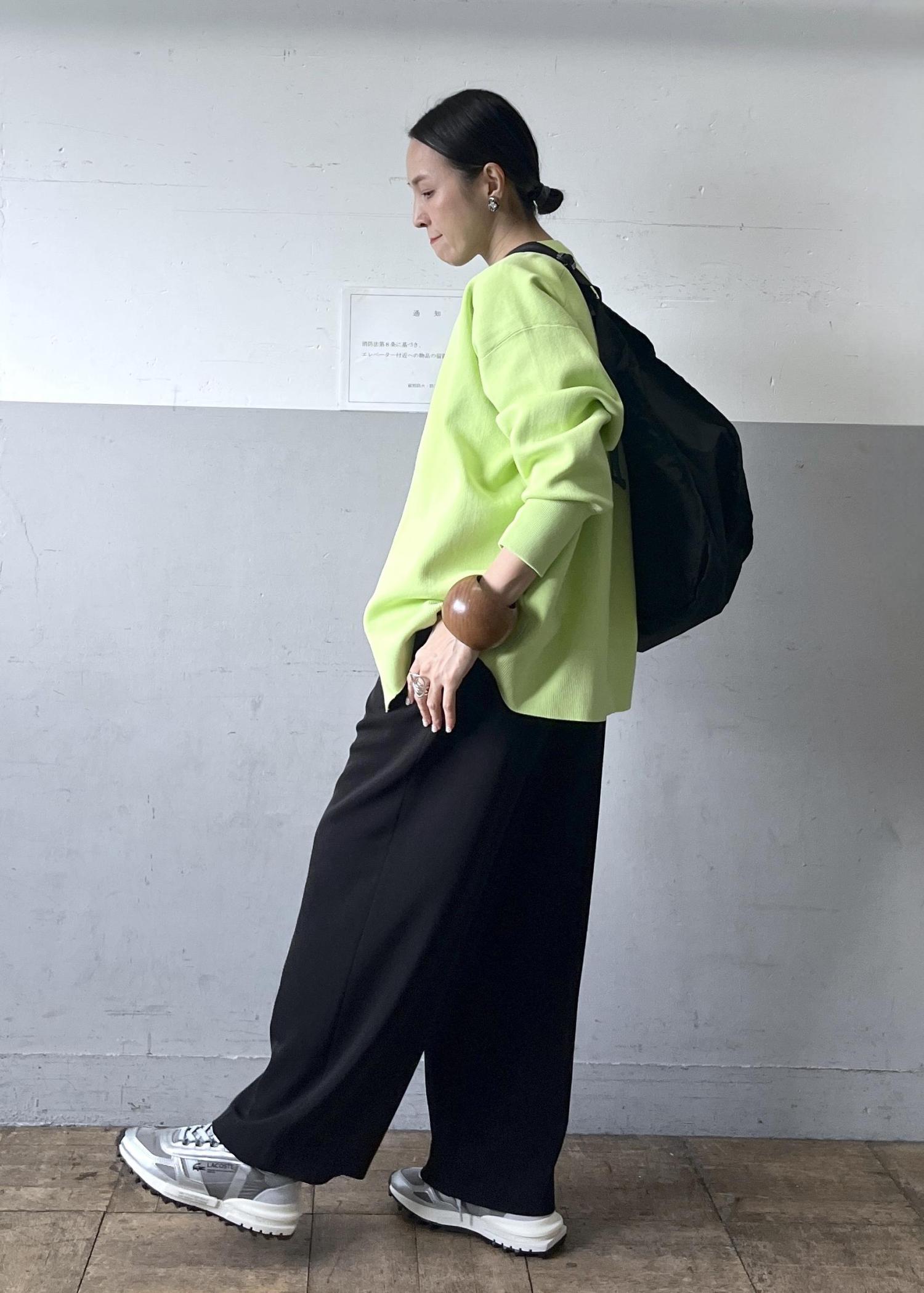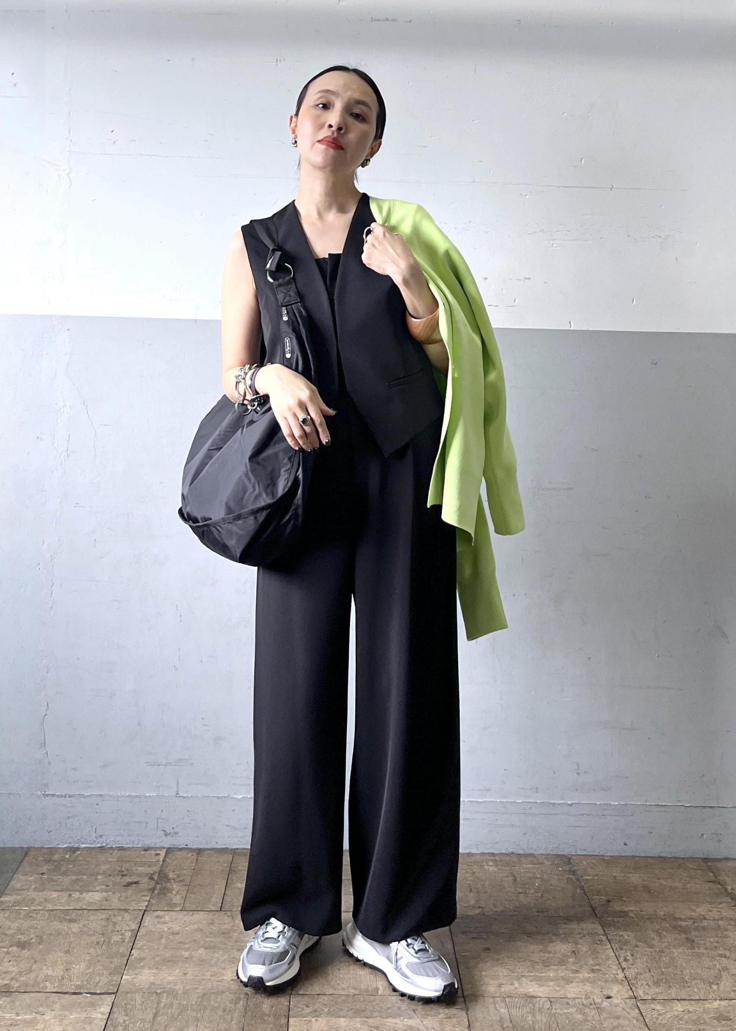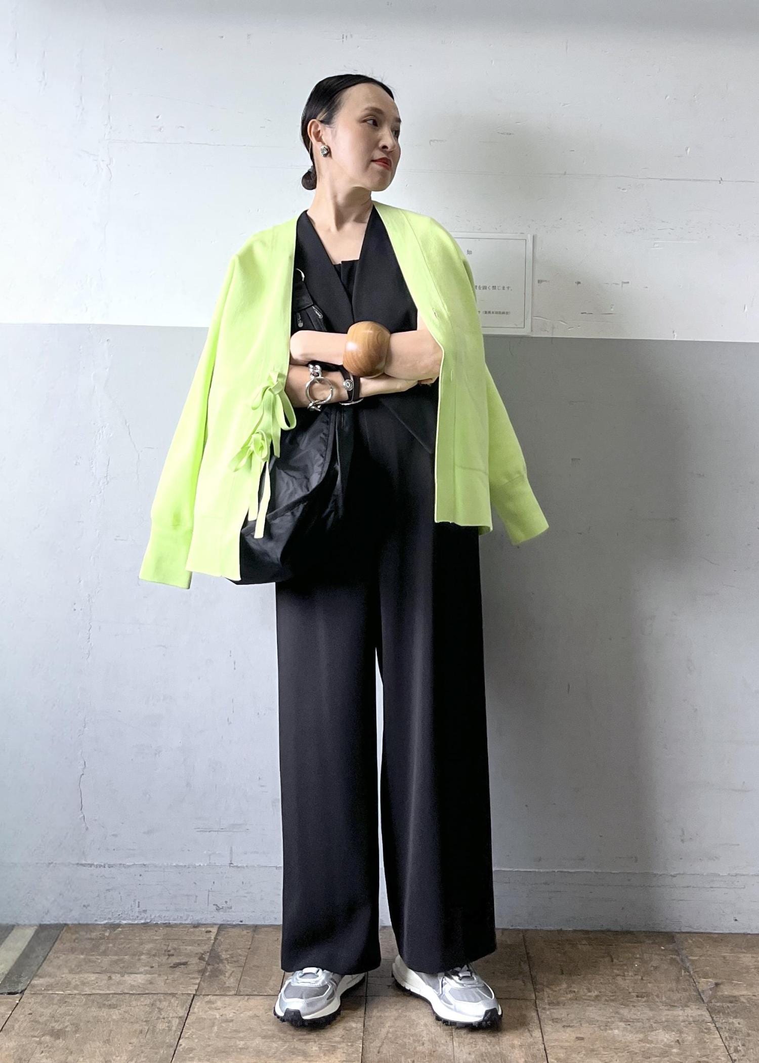 きちんと感のあるロンパースに、カーディガンとスニーカーを合わせてカジュアルダウンしたスタイリング。