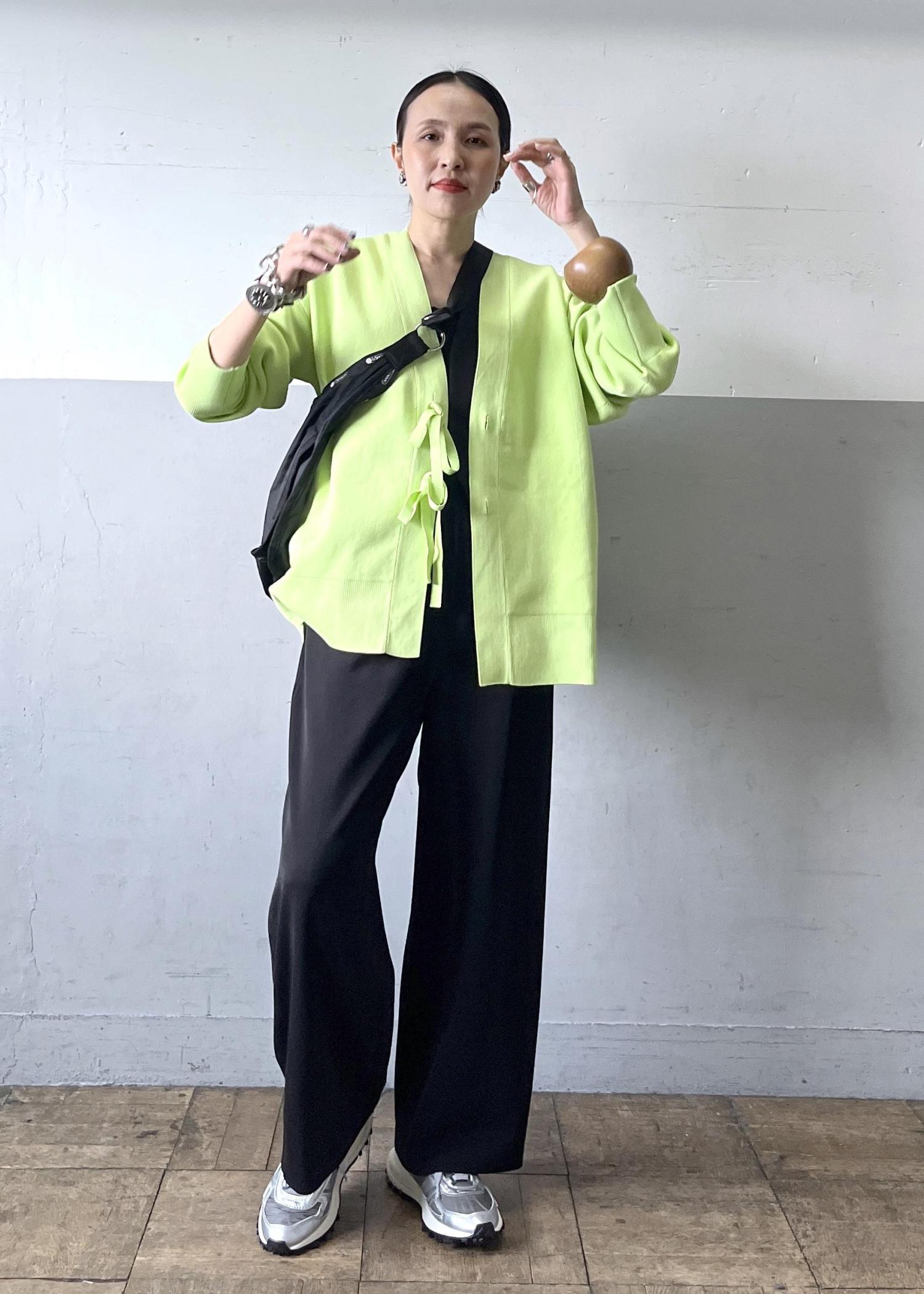 シルバーのボタンとリボンの2wayタイプのカーディガン。お尻まで隠れる長さで今の時期から重宝します。