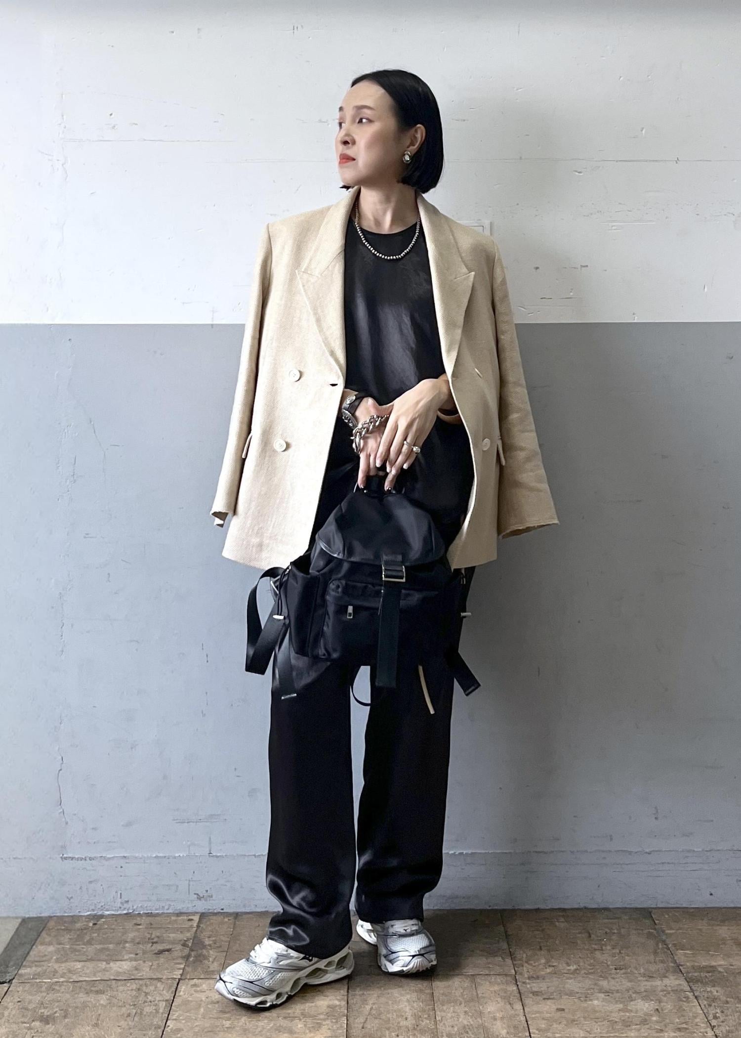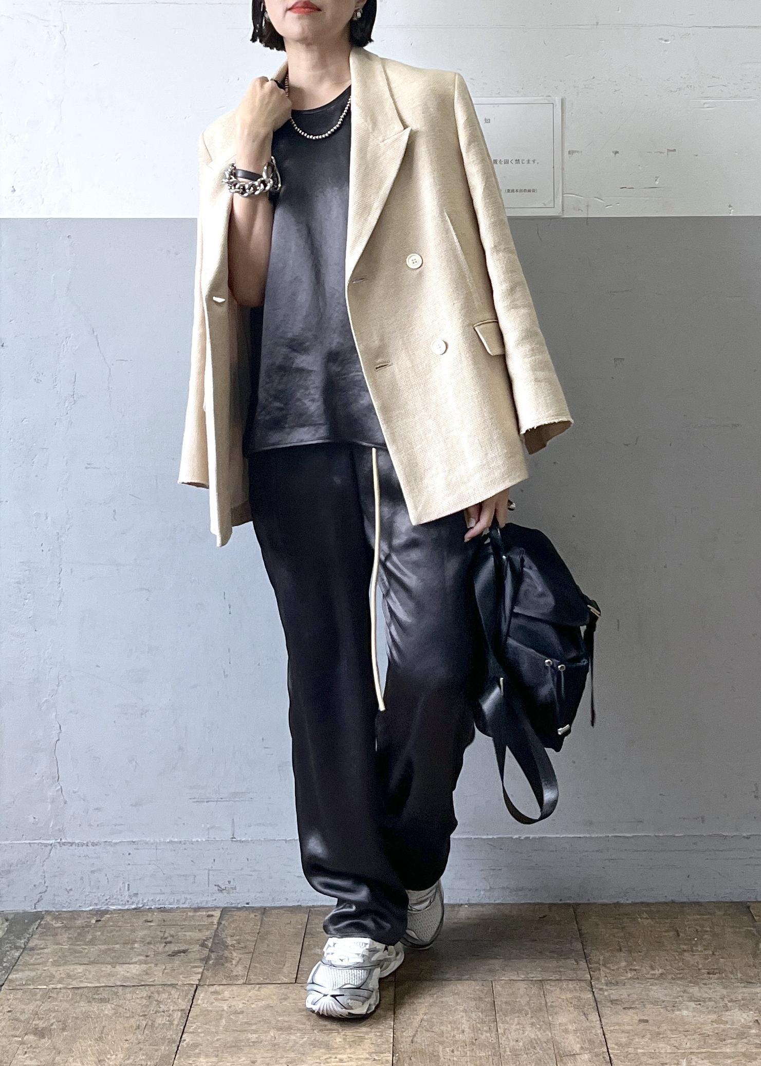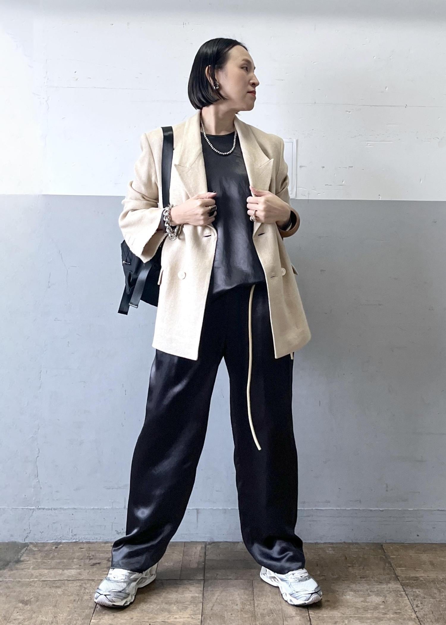 上品な光沢感が魅力のサテン素材セットアップに、イタリア製の上質な素材を使用したジャケットを合わせた大人のリラックススタイル。