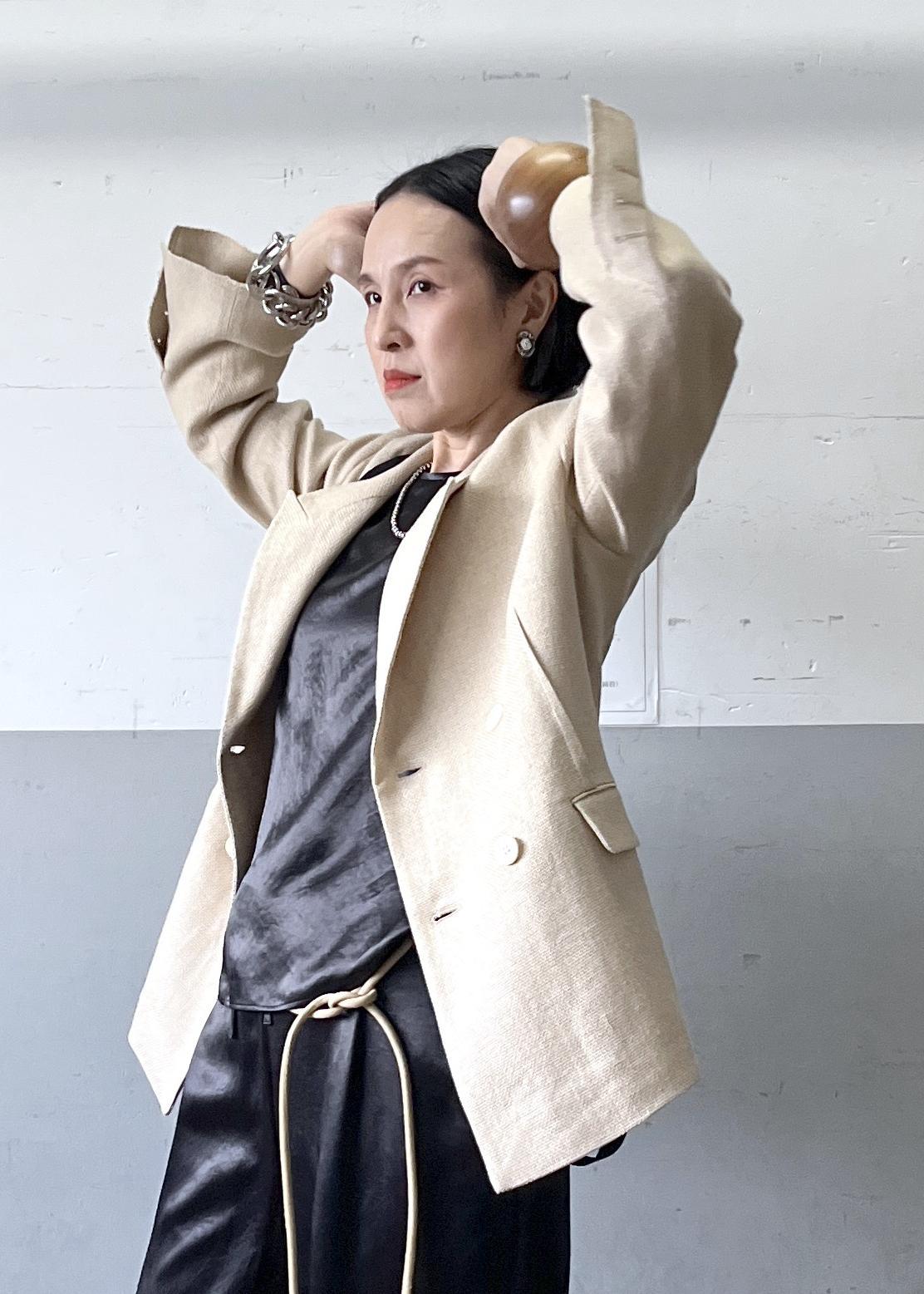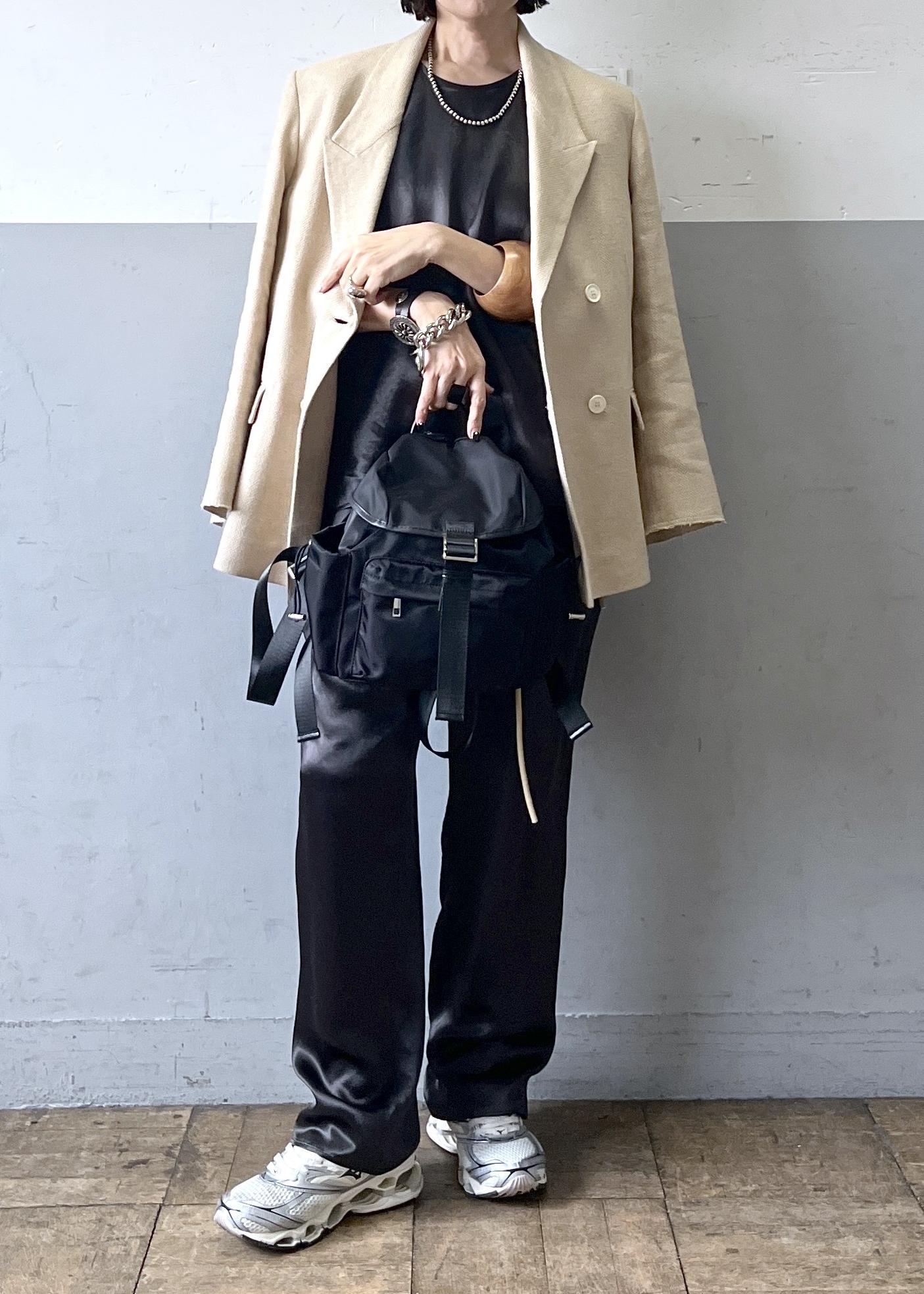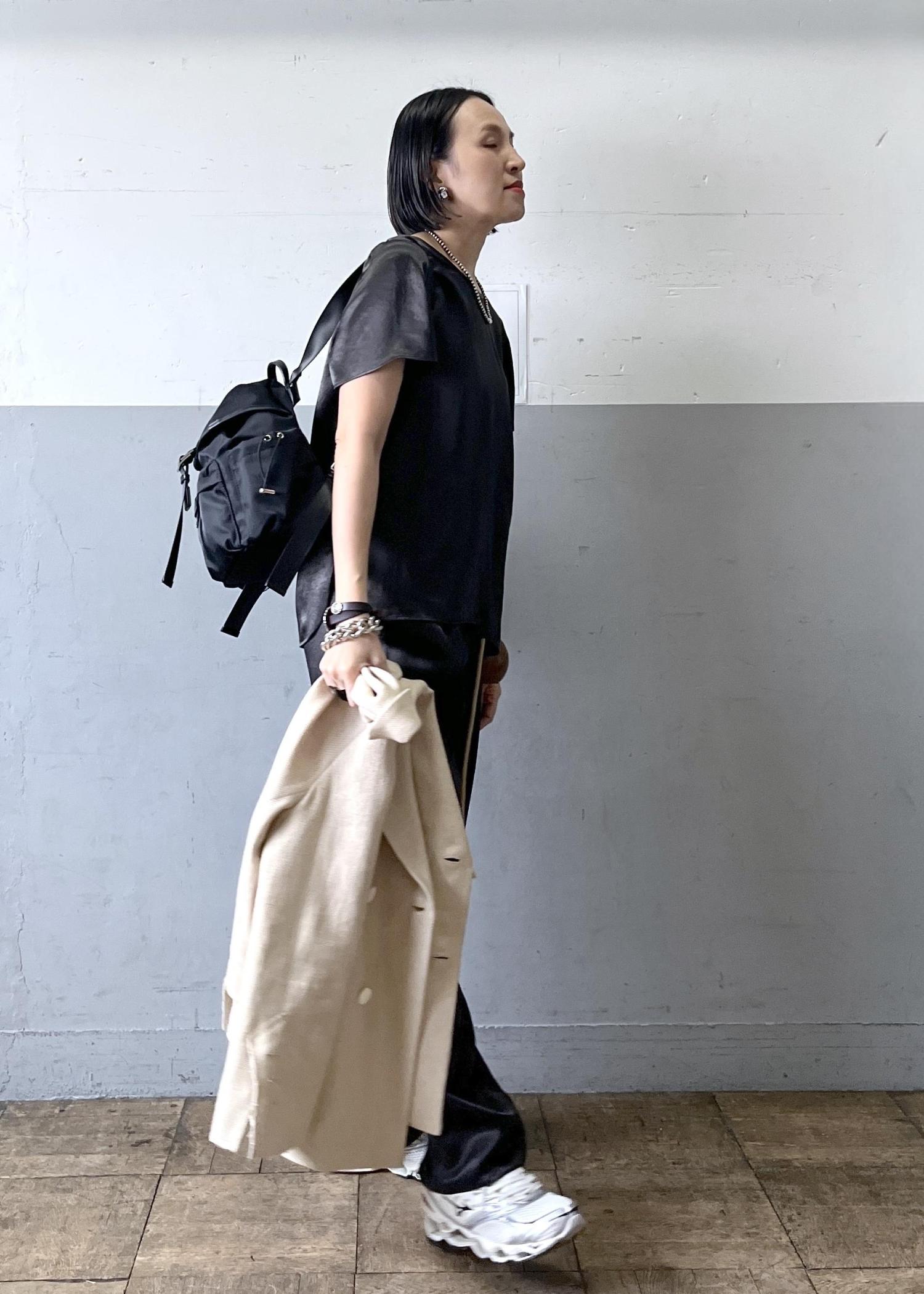 上品な光沢感が魅力のサテン素材セットアップに、イタリア製の上質な素材を使用したジャケットを合わせた大人のリラックススタイル。