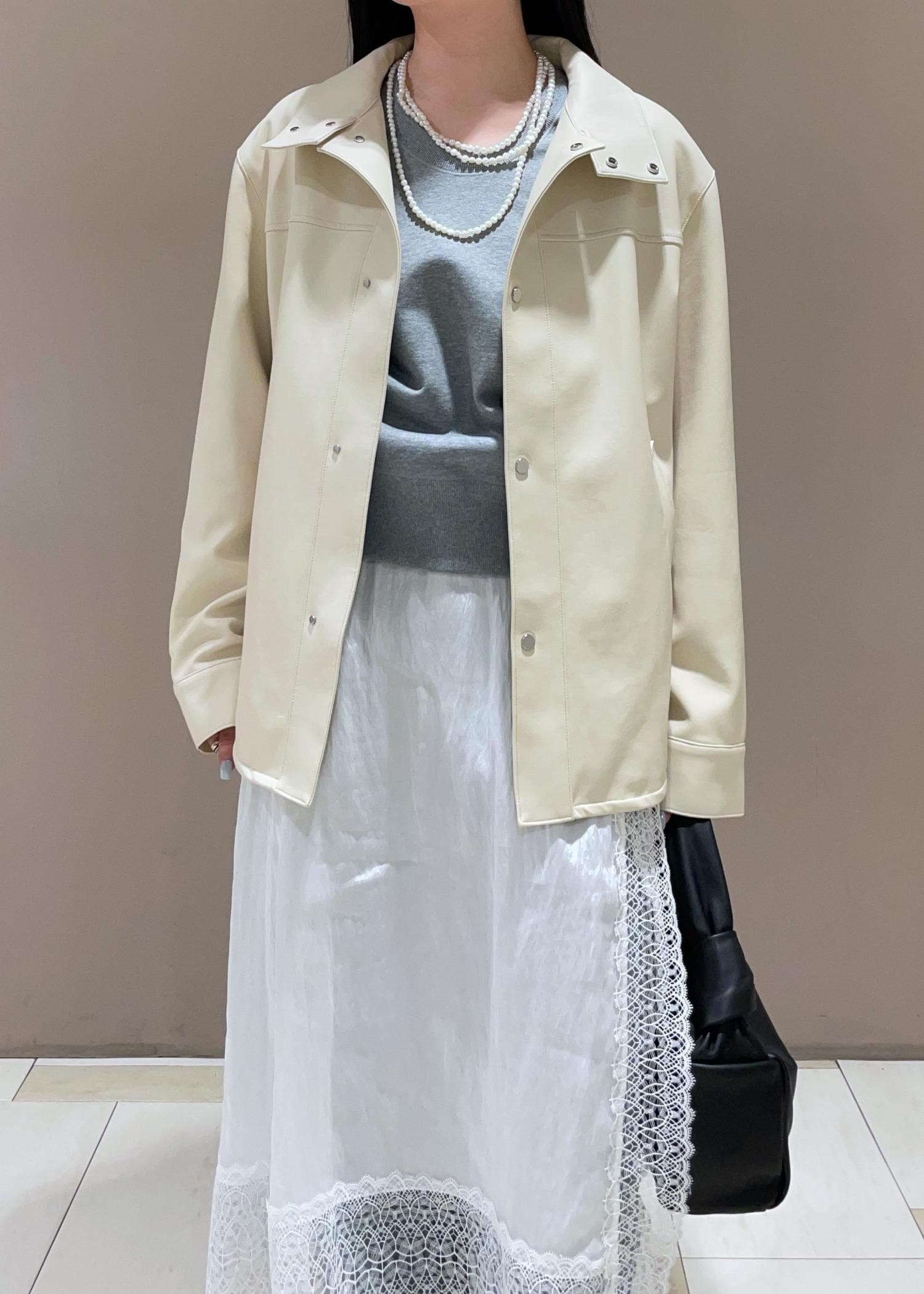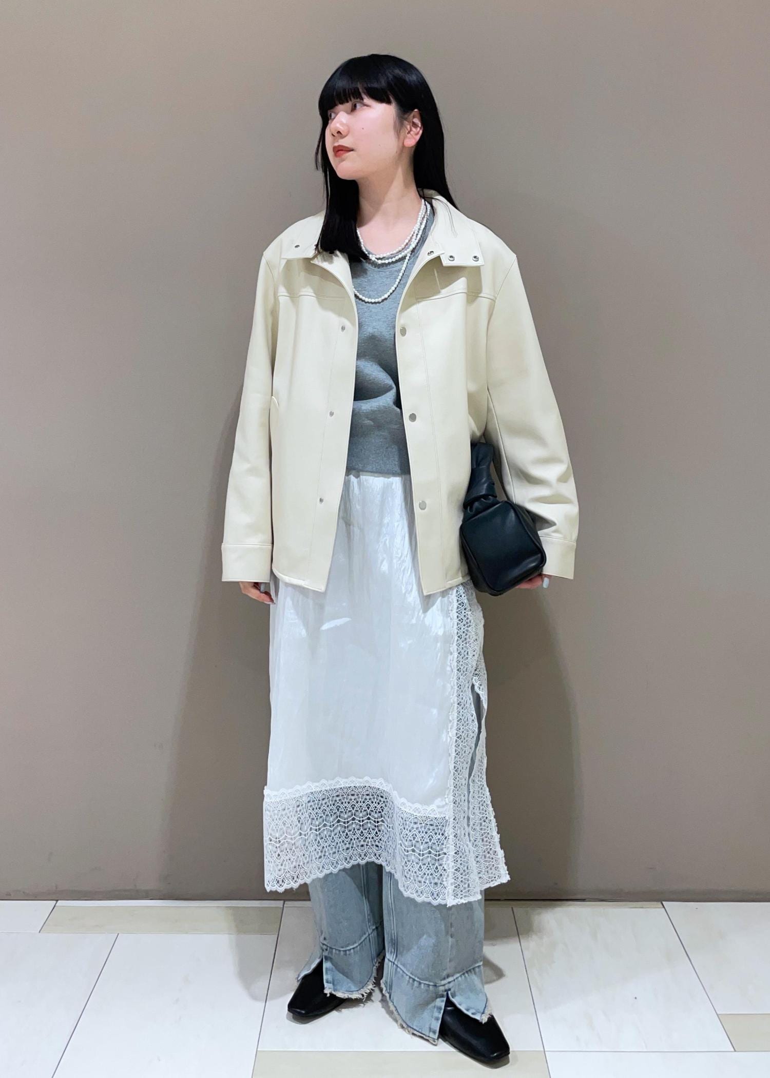 定番な春コーディネートに変化をつけたくて、レーススカートとパールネックレスを合わせて、フェミニンなスタイリングにしました❤︎