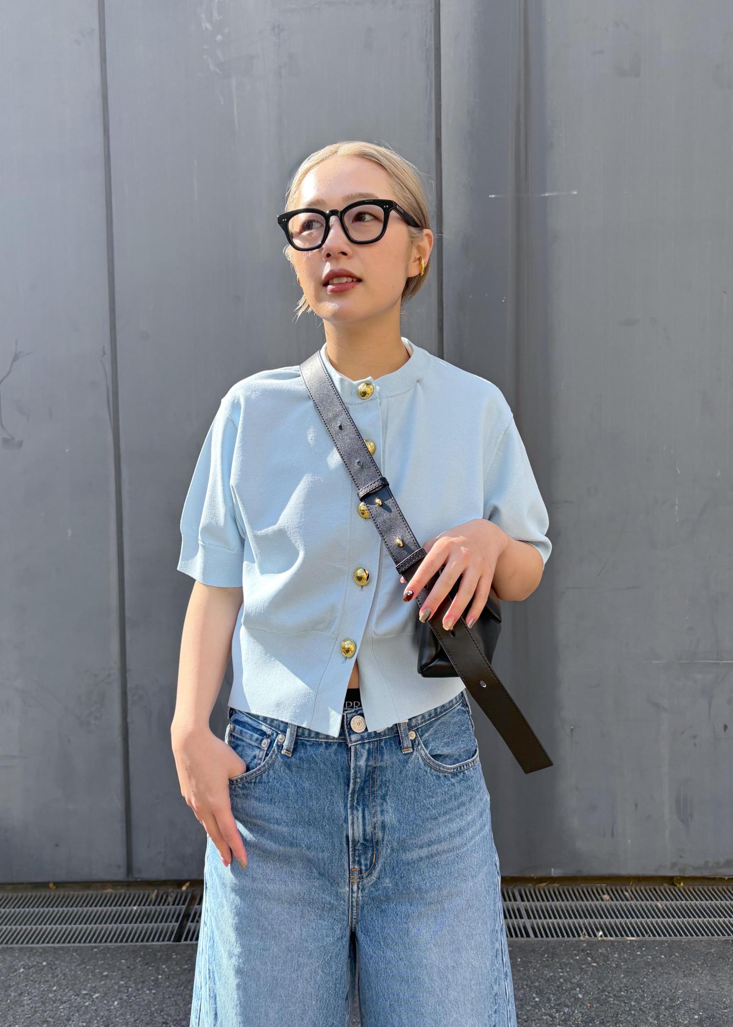 あえてスラックスを重ねて、カジュアルになりすぎないバランスと甘さのあるブルーは、ブラック小物で引き締めて大人っぽく合わせてみました☺︎