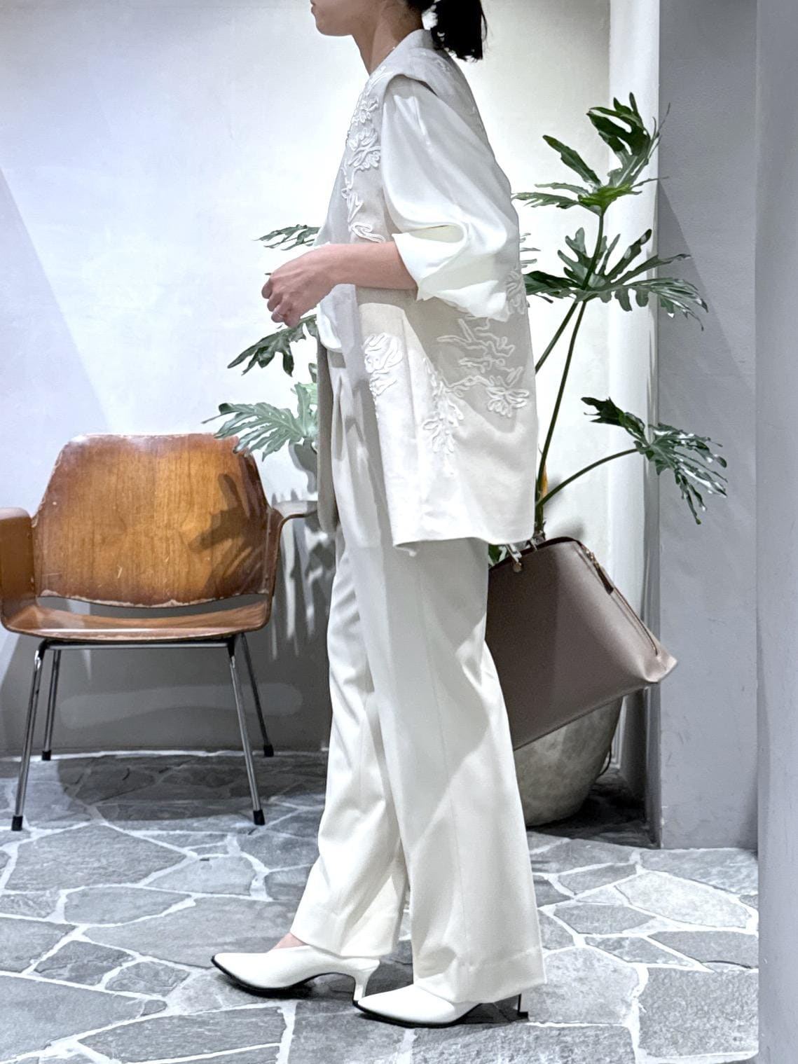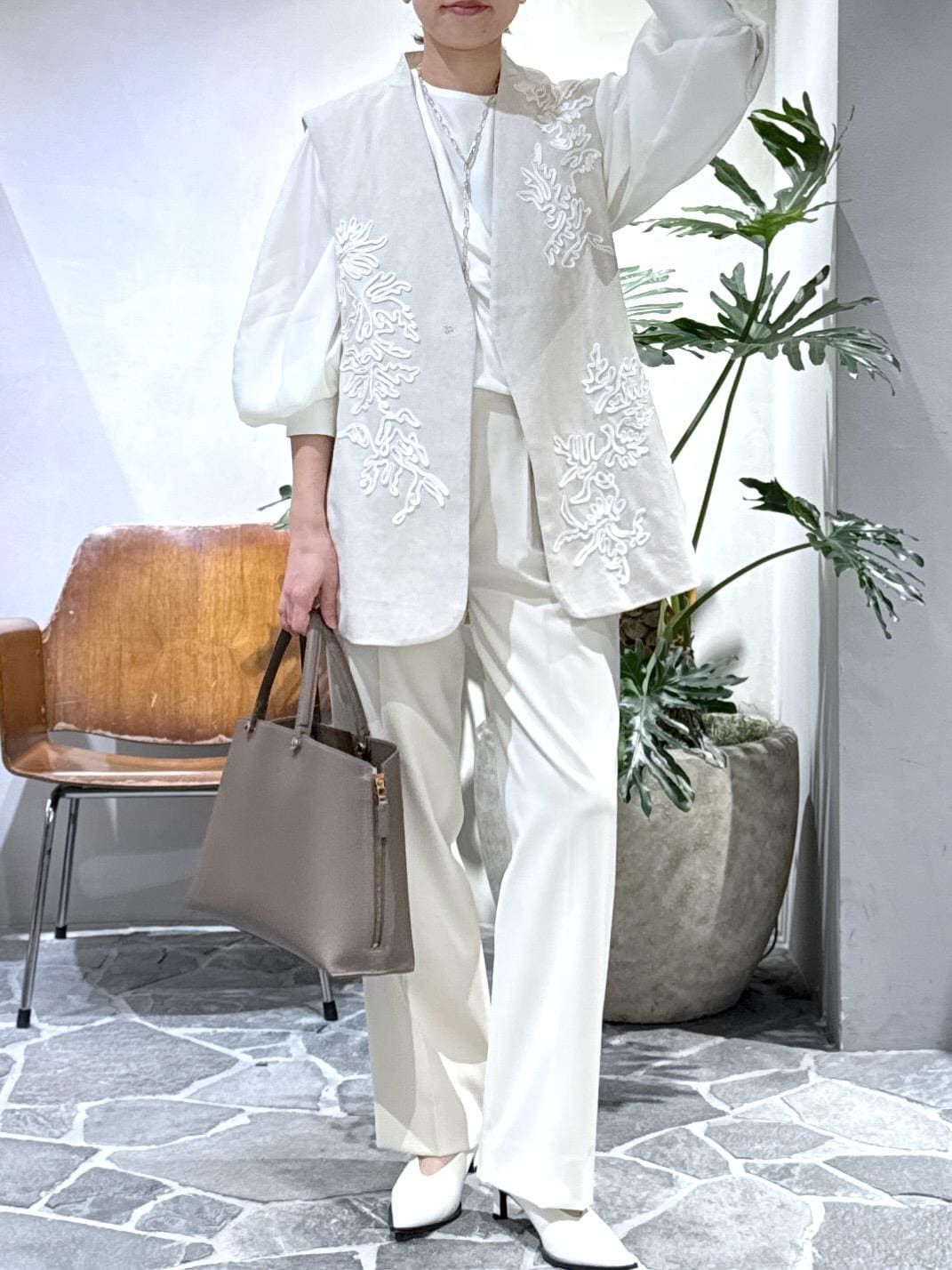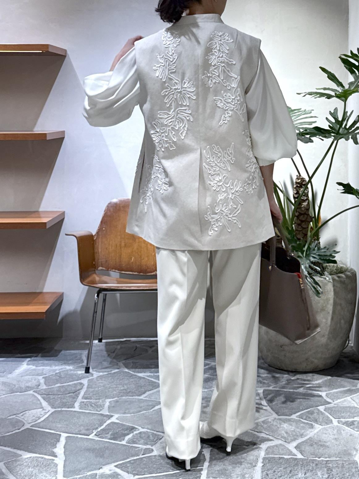 刺繍の入ったジレとサテン素材のブラウスは異素材同士なので、合わせるだけで表情が出ますよ!
