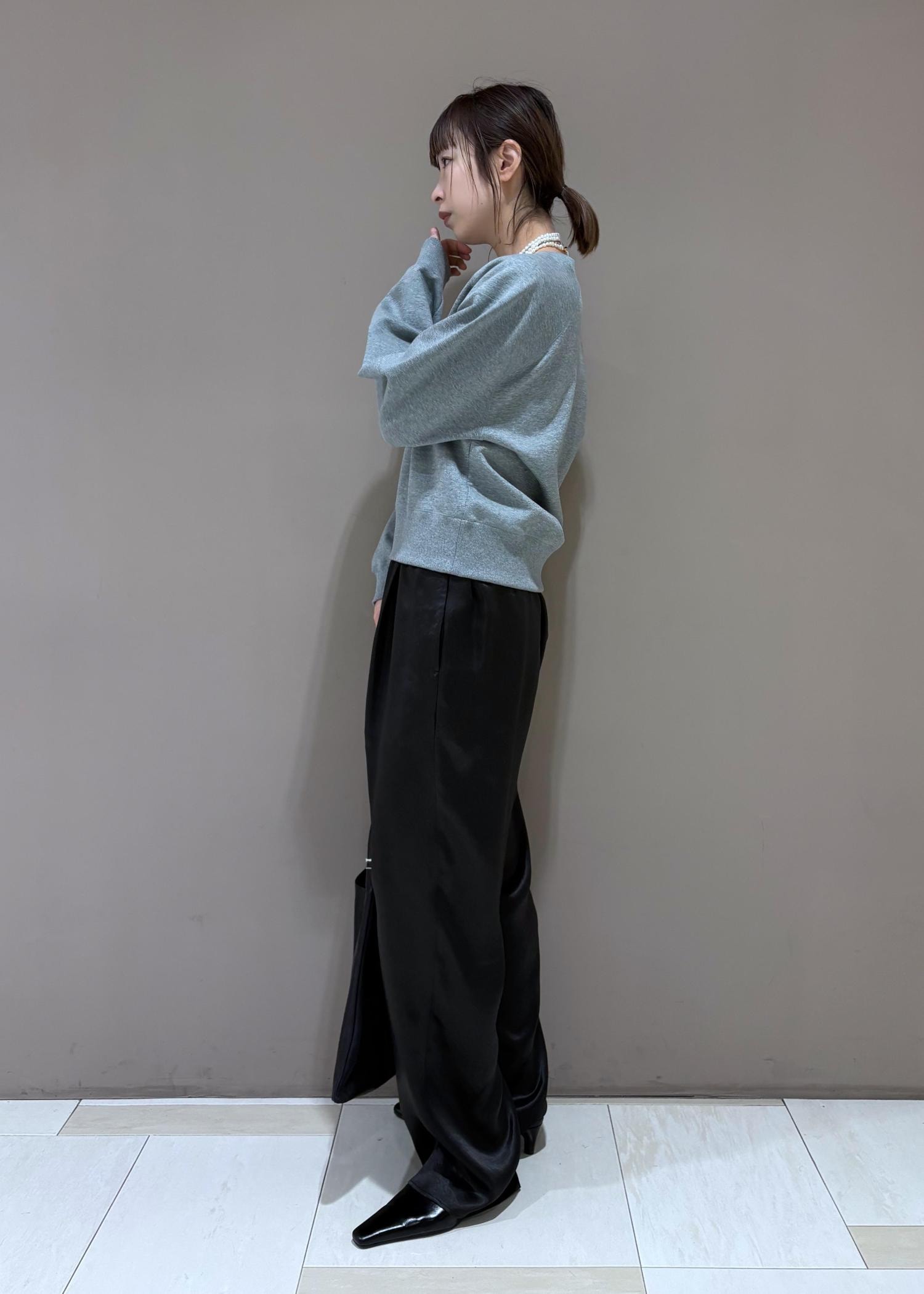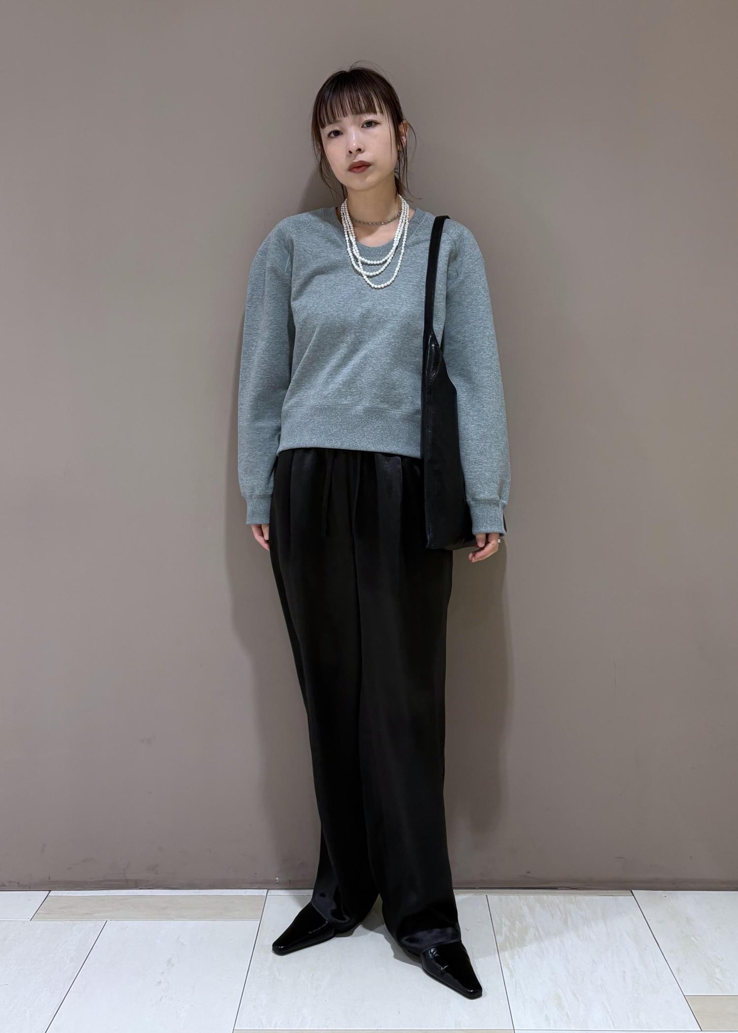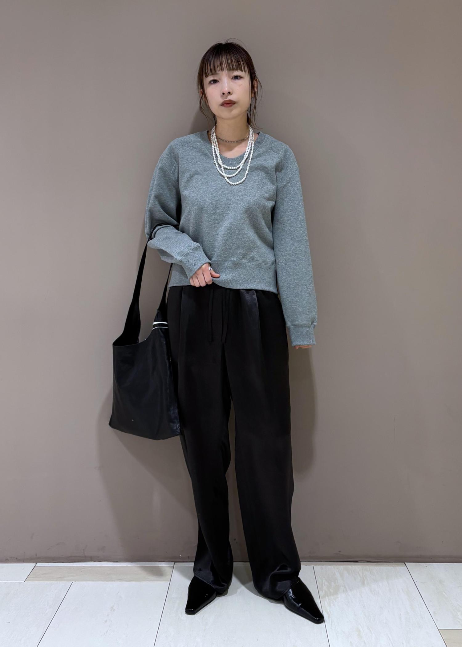 今から着れるスウェットに、艶っぽいパンツで