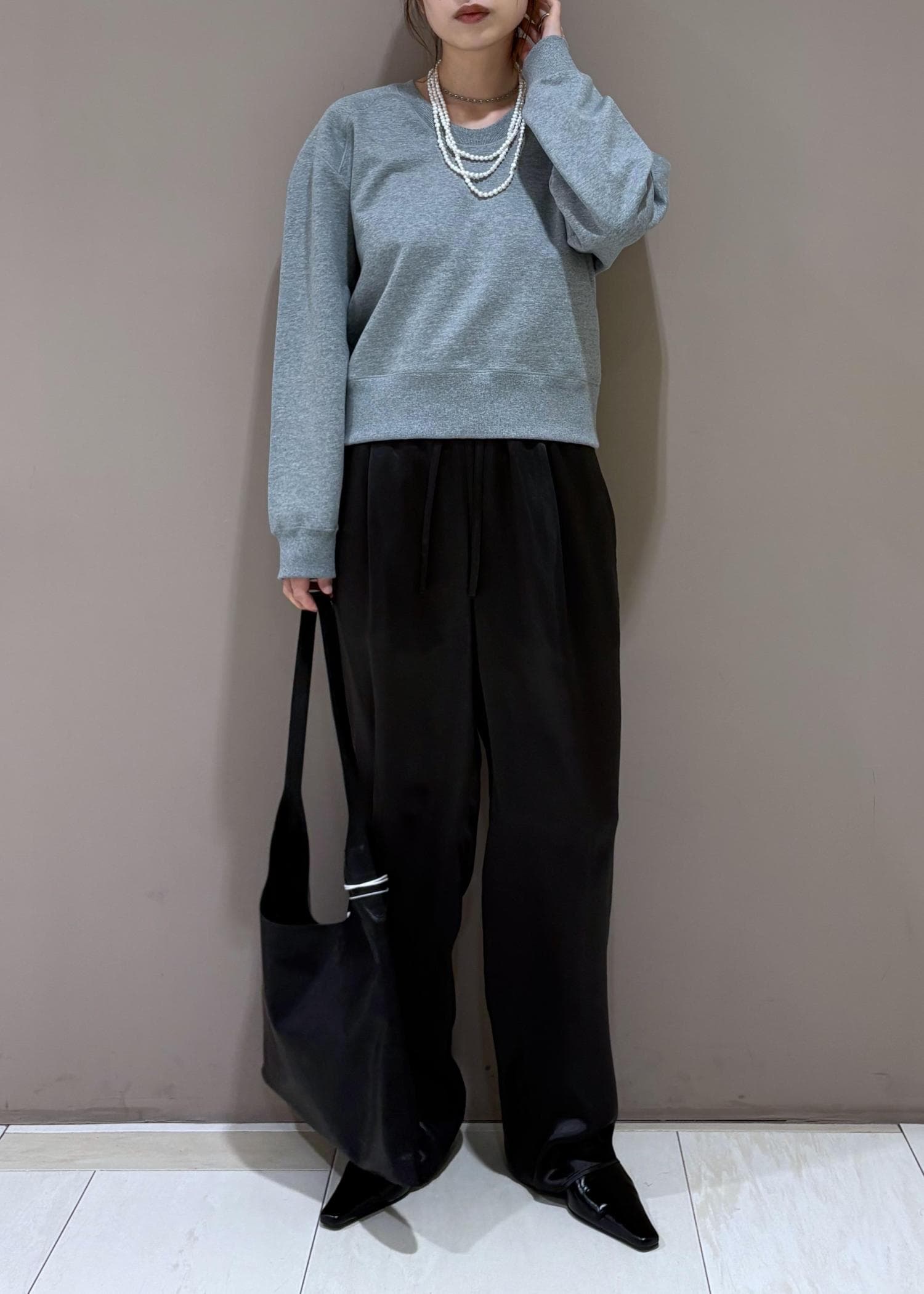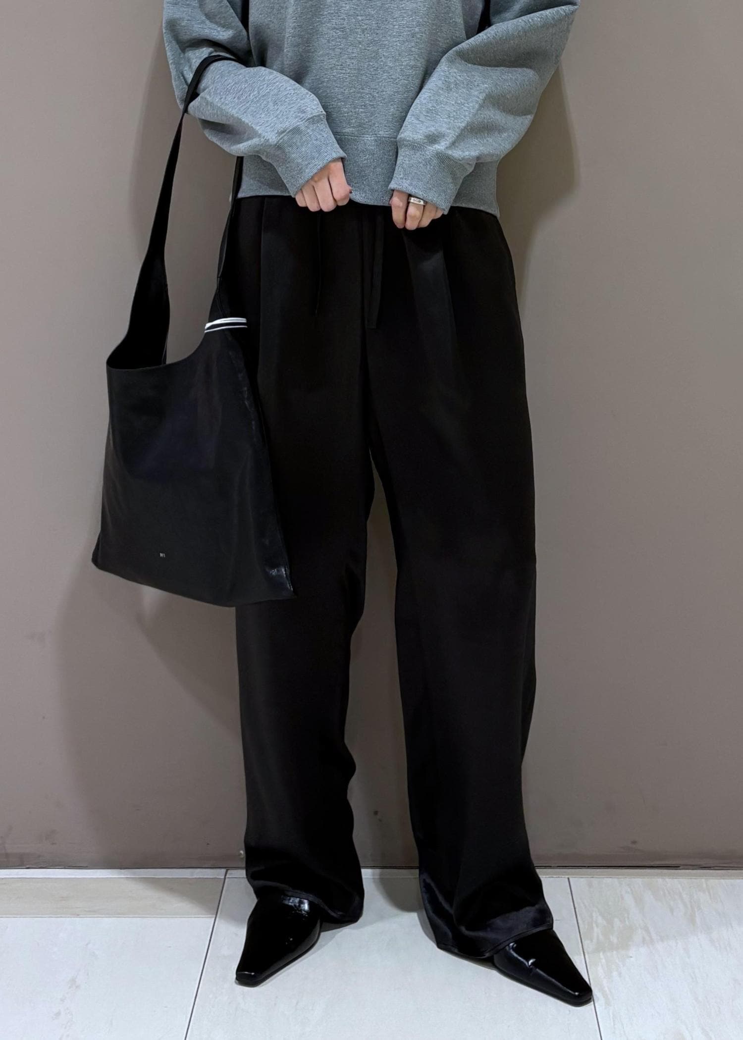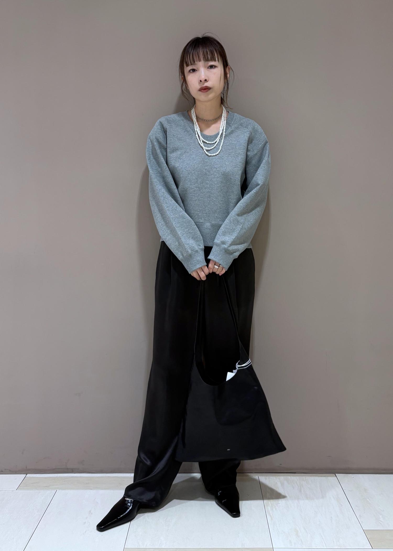 今から着れるスウェットに、艶っぽいパンツで