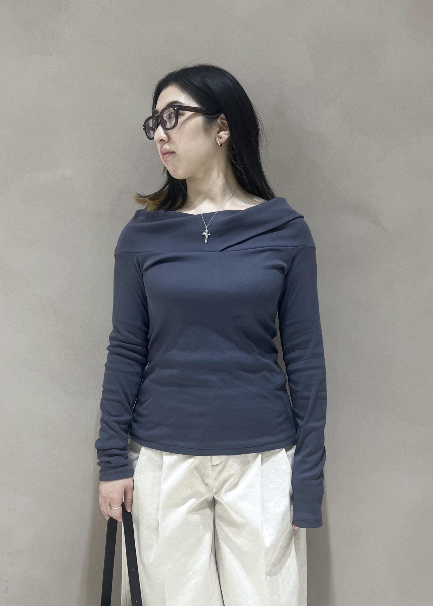 オフショルでも着られるトップスです!伸縮性のある素材感でアウトで着るのも可愛いです!