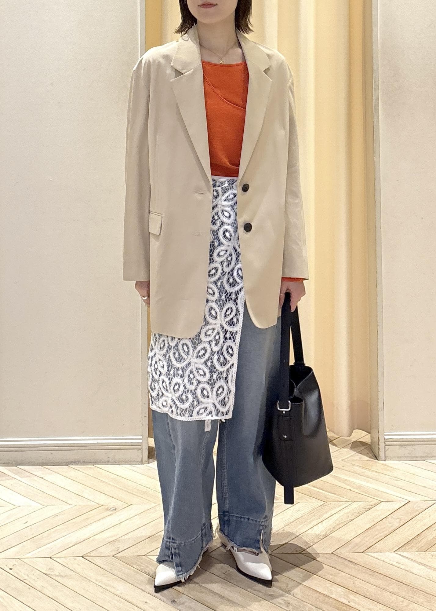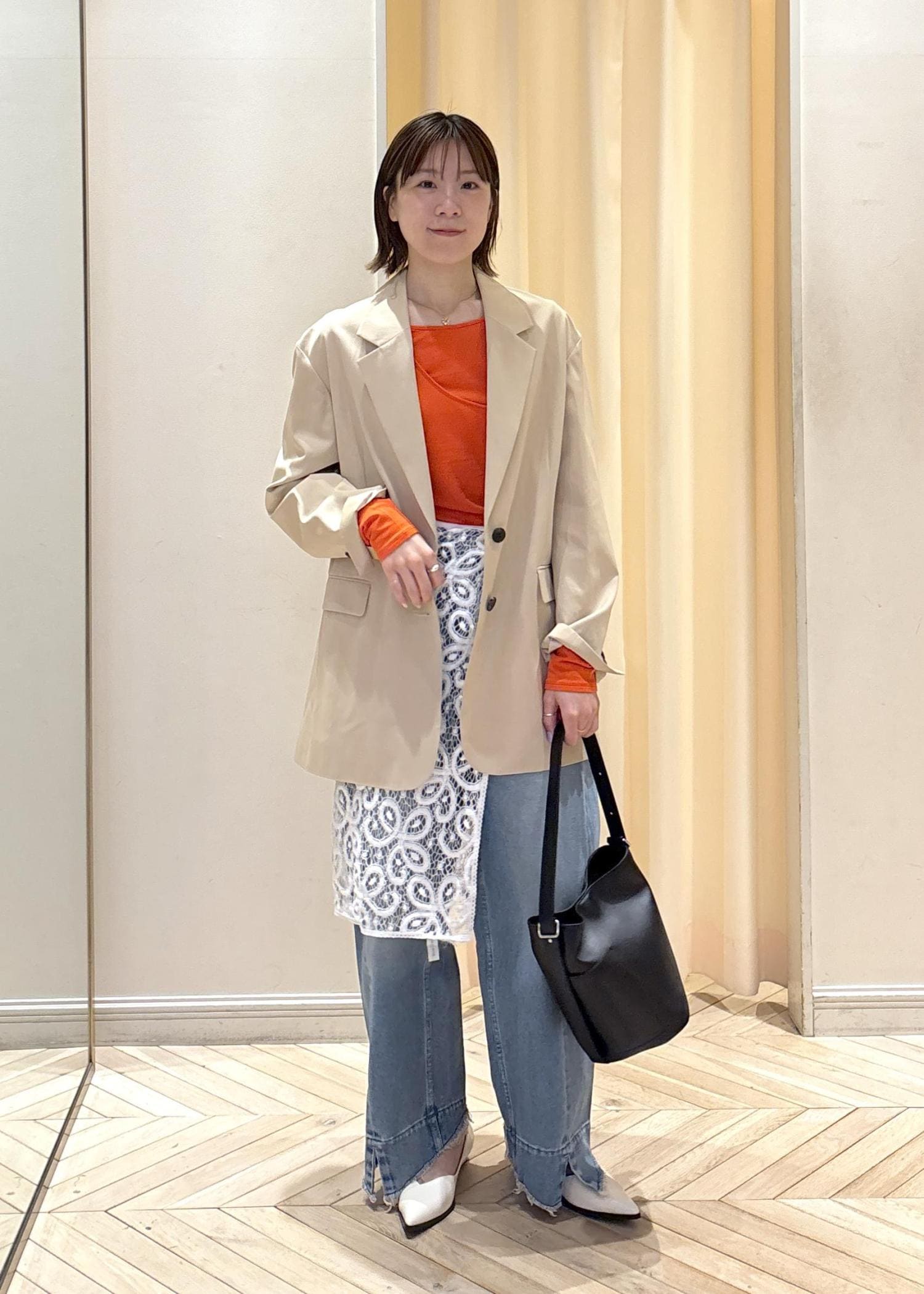 優しいベージュカラーにパキッと発色の良いオレンジを合わせる事で、春を意識したカラーリングにしてみました!