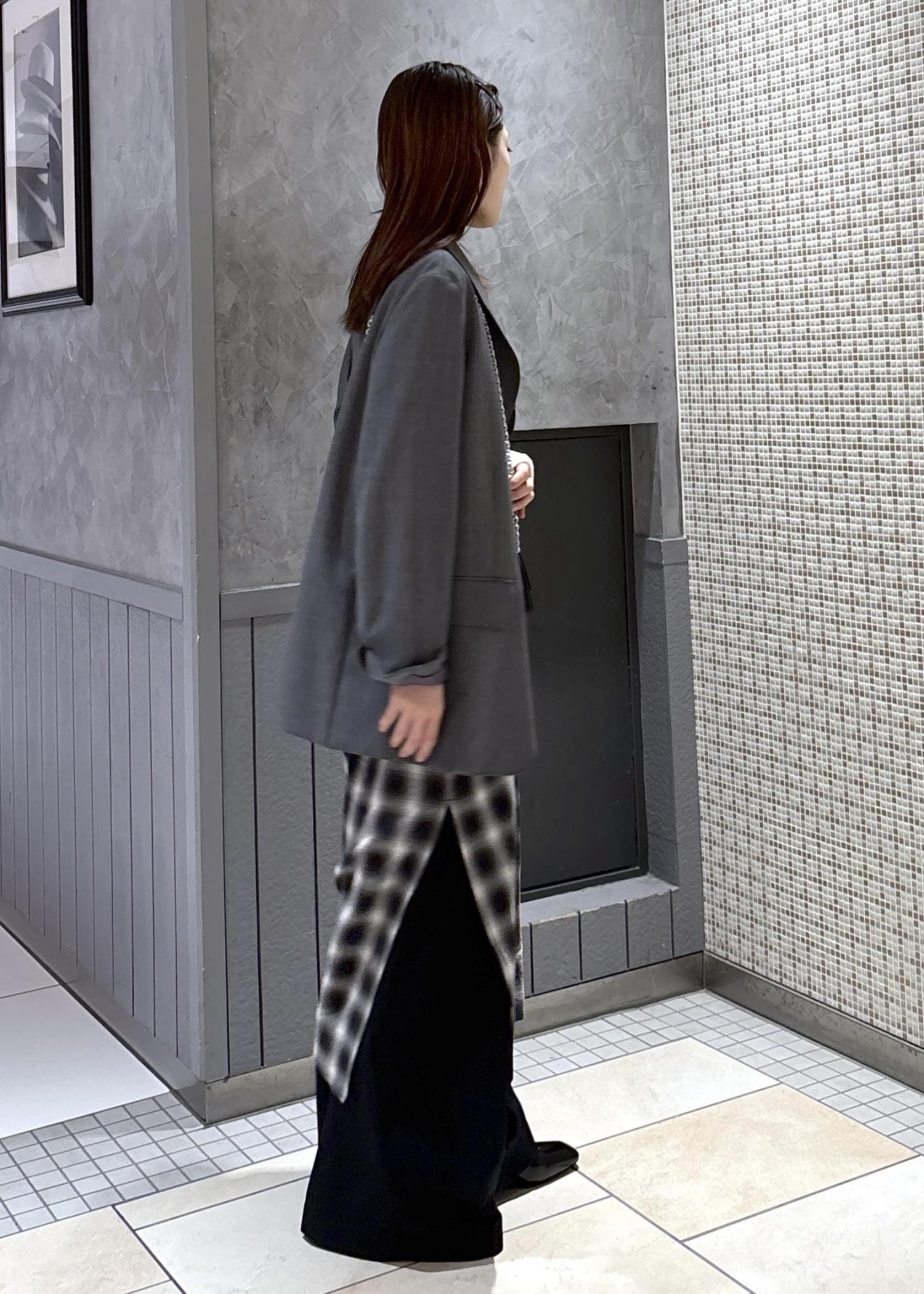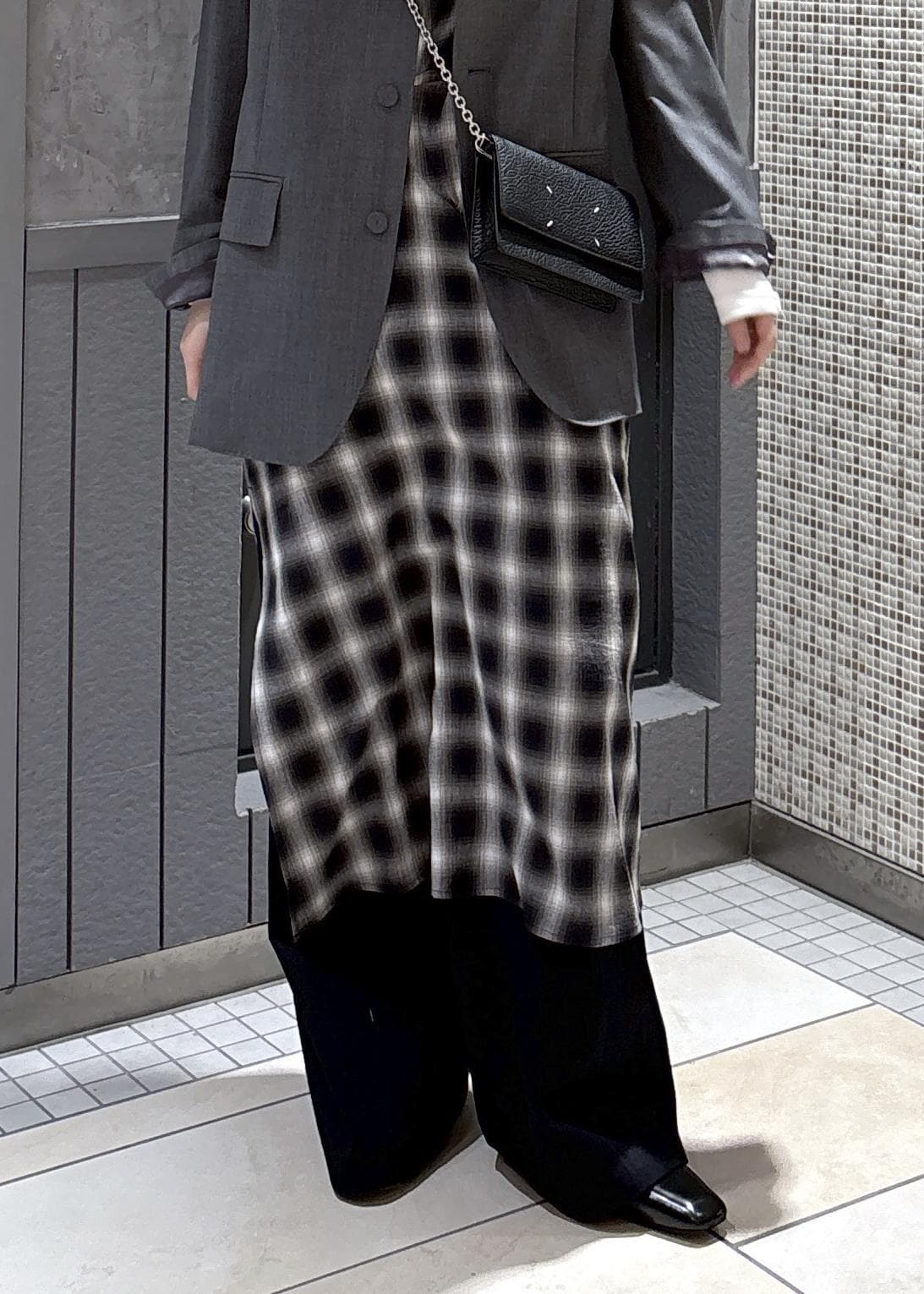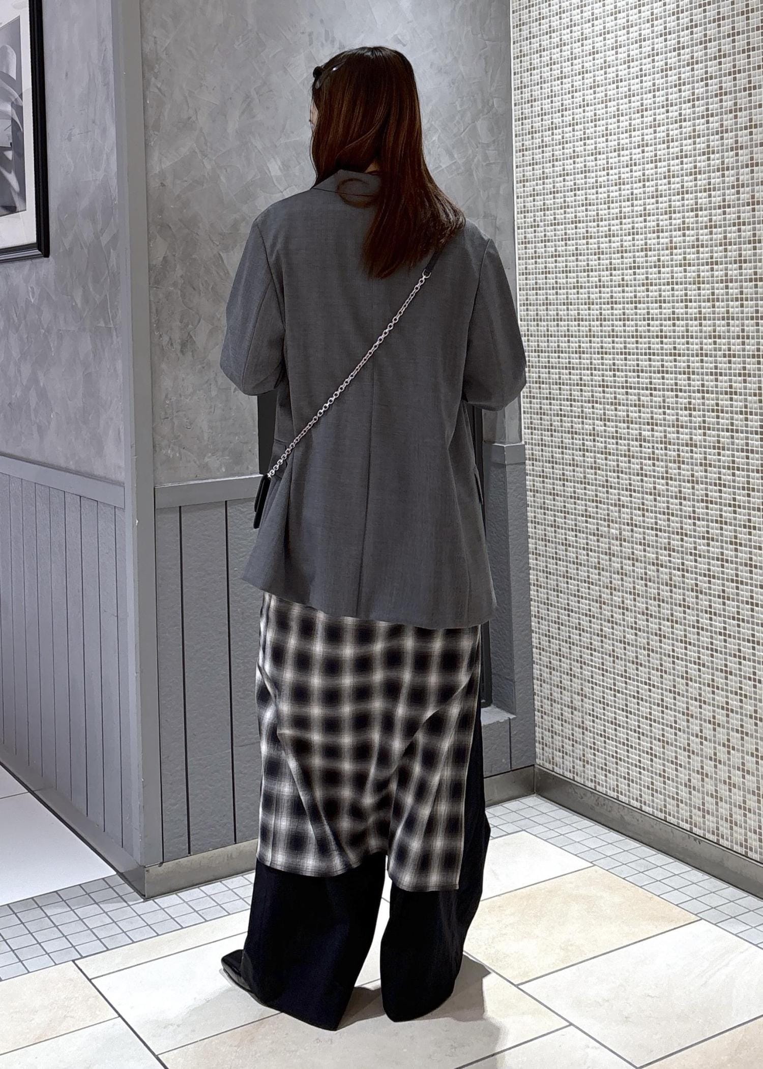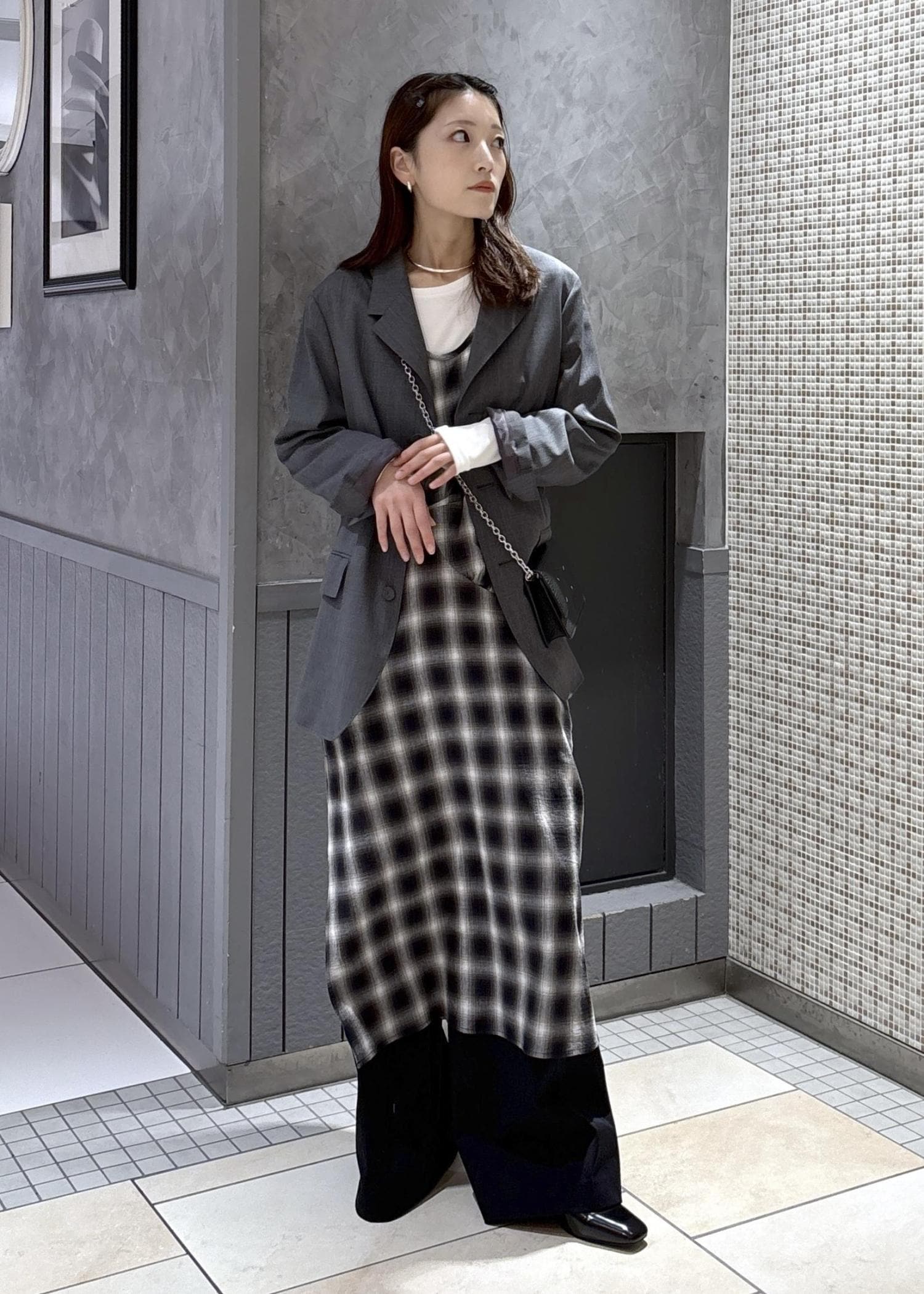 シングルジャケットとチェックワンピースをあわせて、ジャケットのカジュアルコーデにしました!