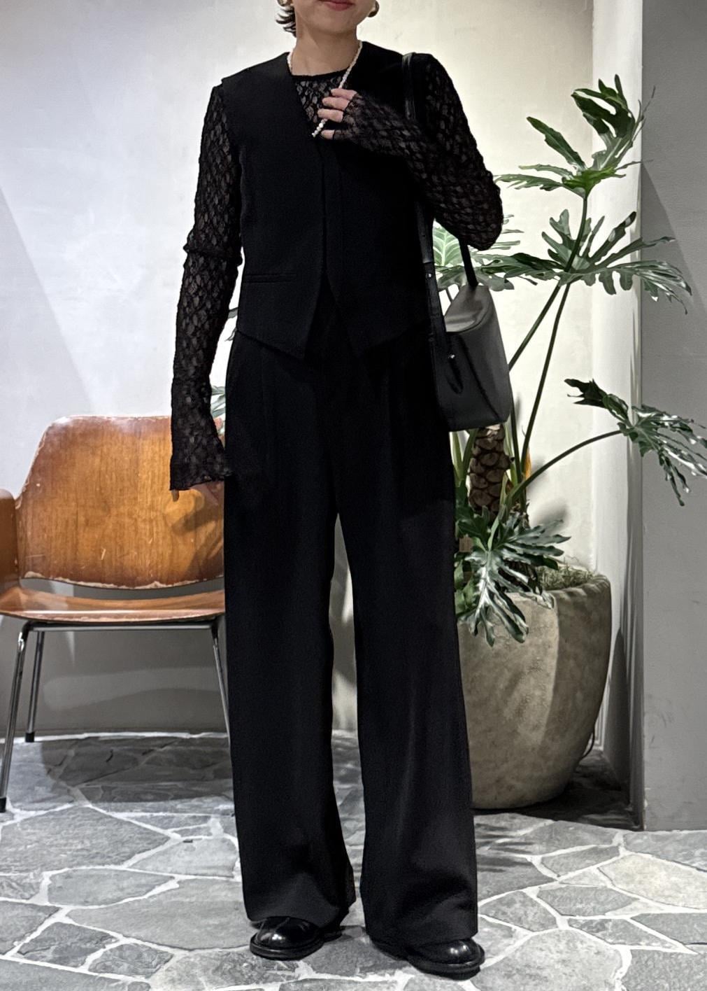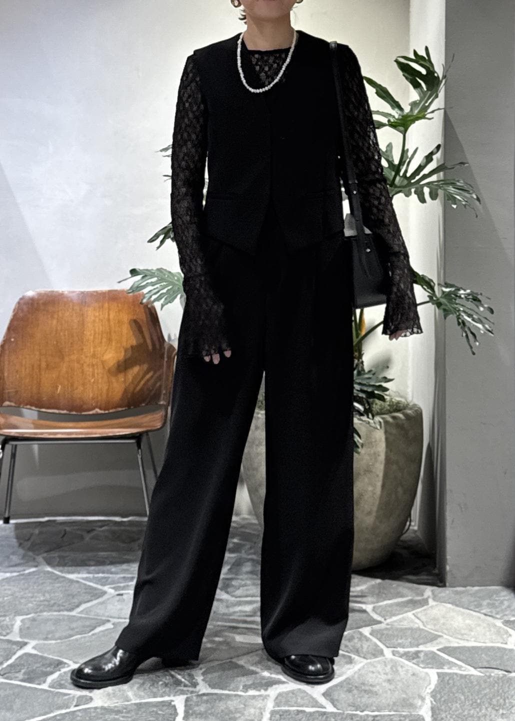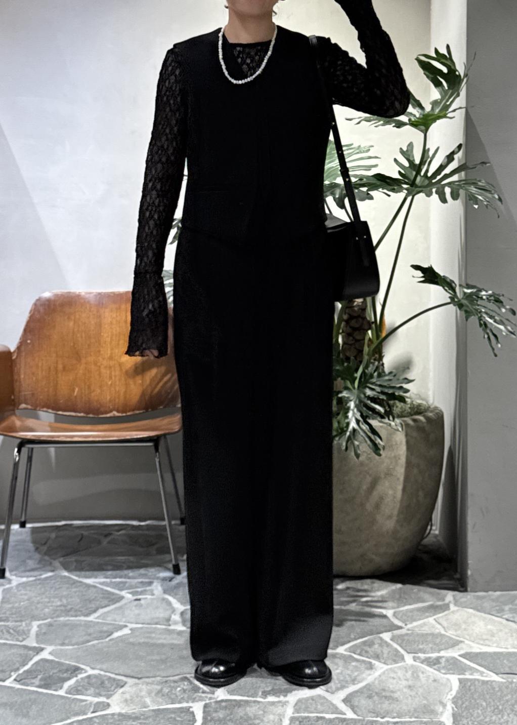 ロンパースは、ベストがドッキングされているので、そのまま着るとマニッシュなハンサムな印象なので、レースのプルオーバーをレイヤードして女性らしさをプラスしました。