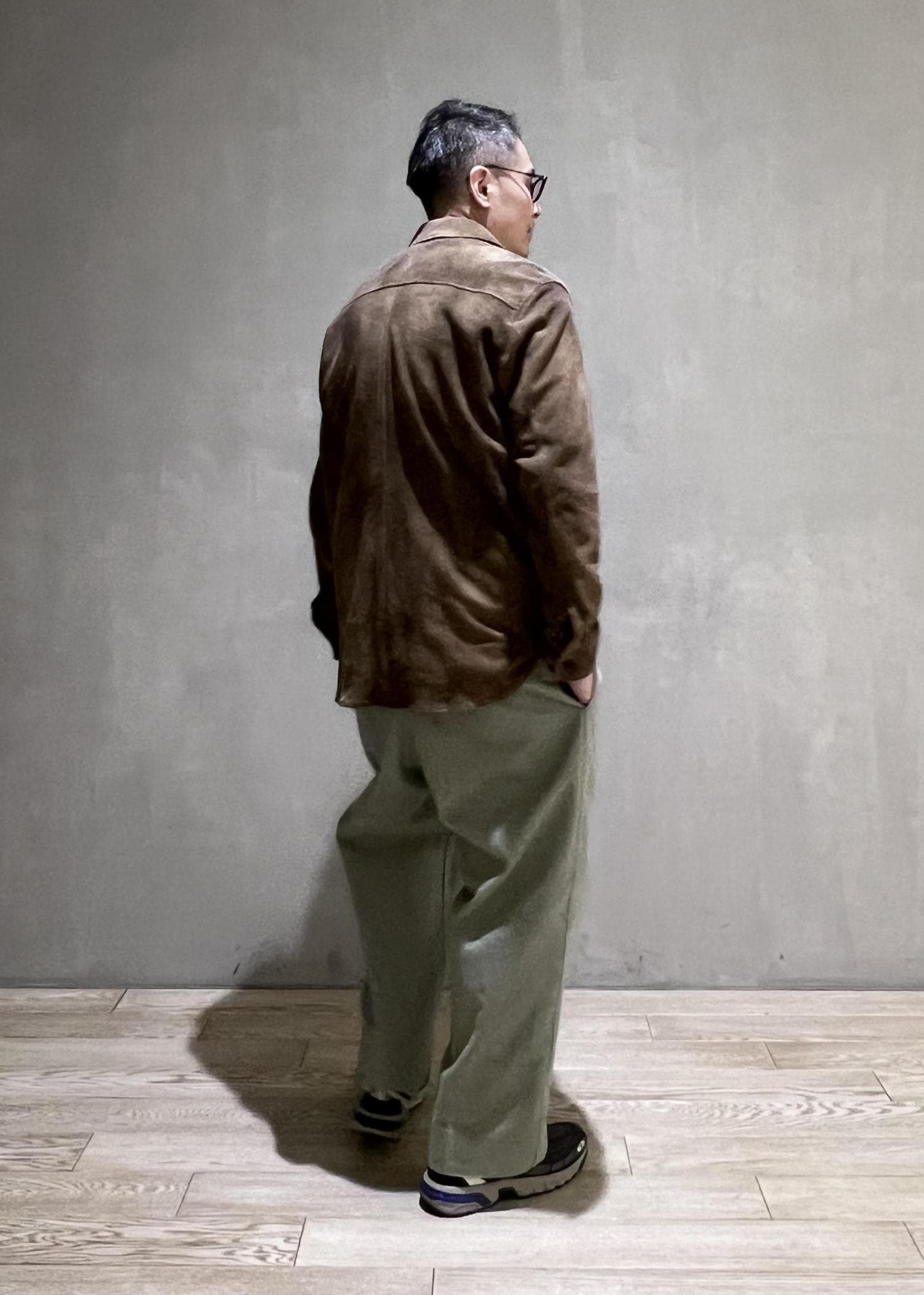 山羊革スエードのソフトな質感にムラ染めのヴィンテージ加工もいい雰囲気で、今はコートやダウンのインナーとして、春先にはロンTやニットとでアウターとしてのスタイリングといろいろ楽しめそうです!