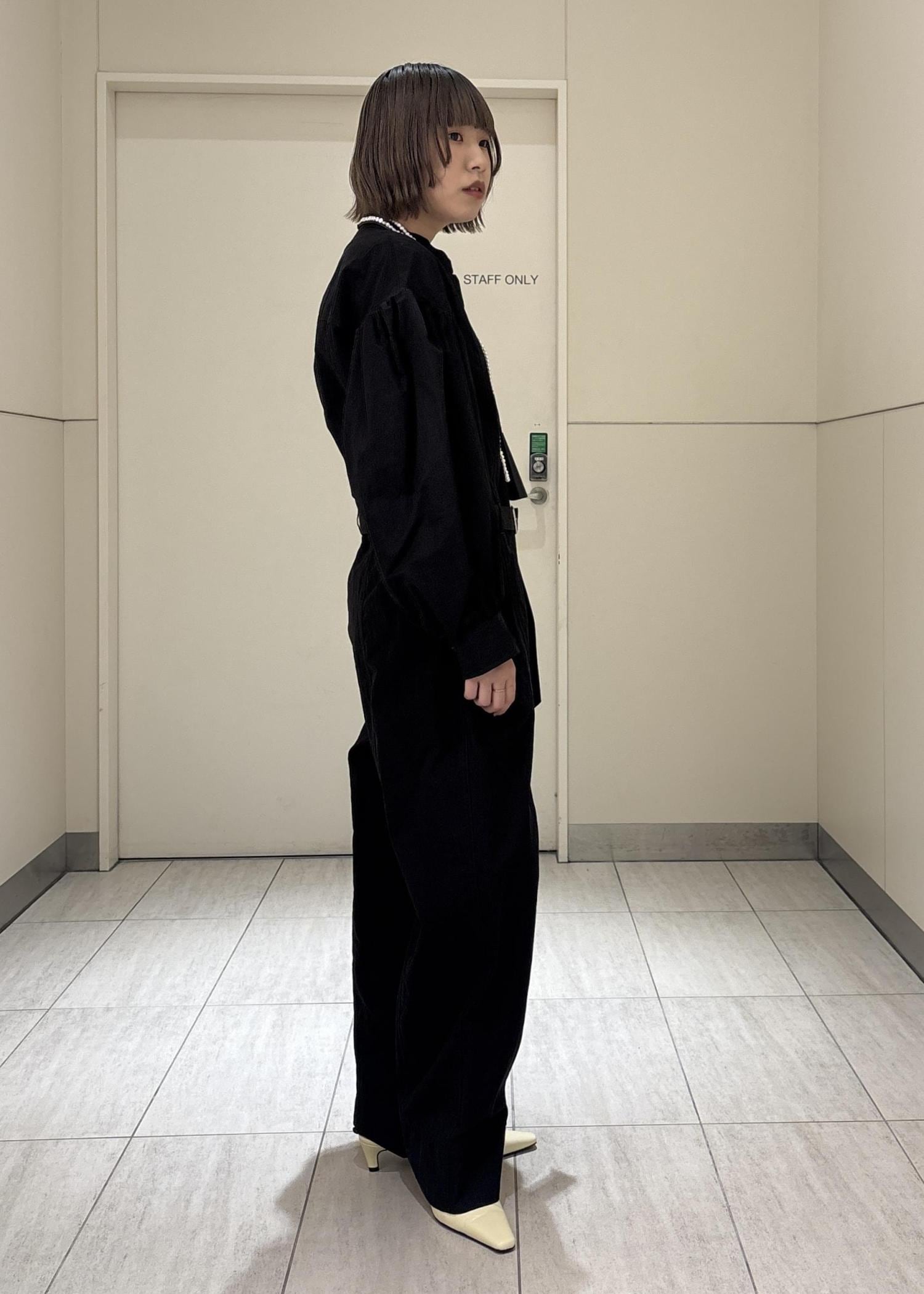 エモエレのロンパースを主役にしたオールブラックコーデ。