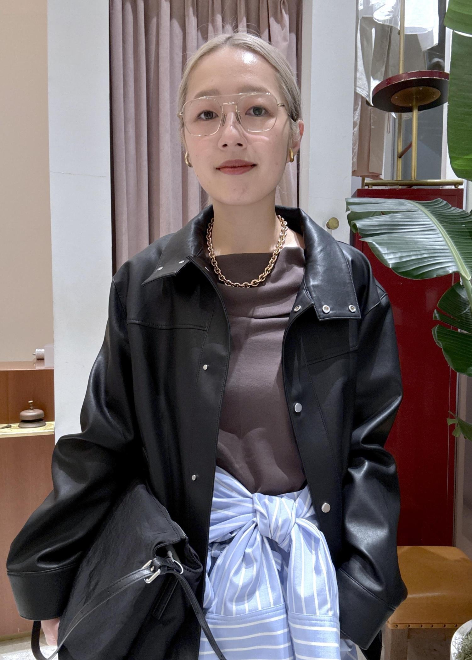 フェイクレザージャケットを主役に、ストライプパンツで軽さをプラスしたスタイリングで合わせてみました♪