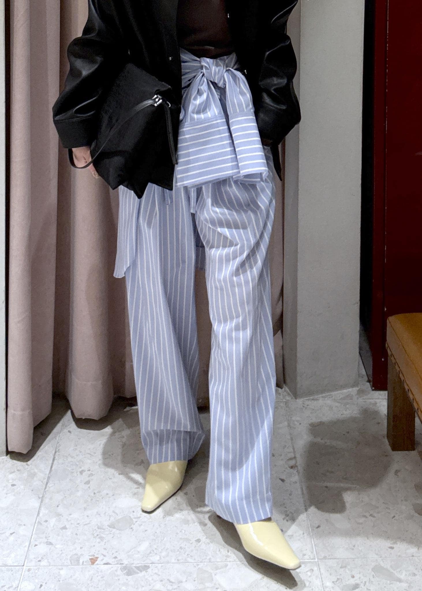 ウエストには同素材のシャツを腰巻きにして、自然な立体感とアクセントを。