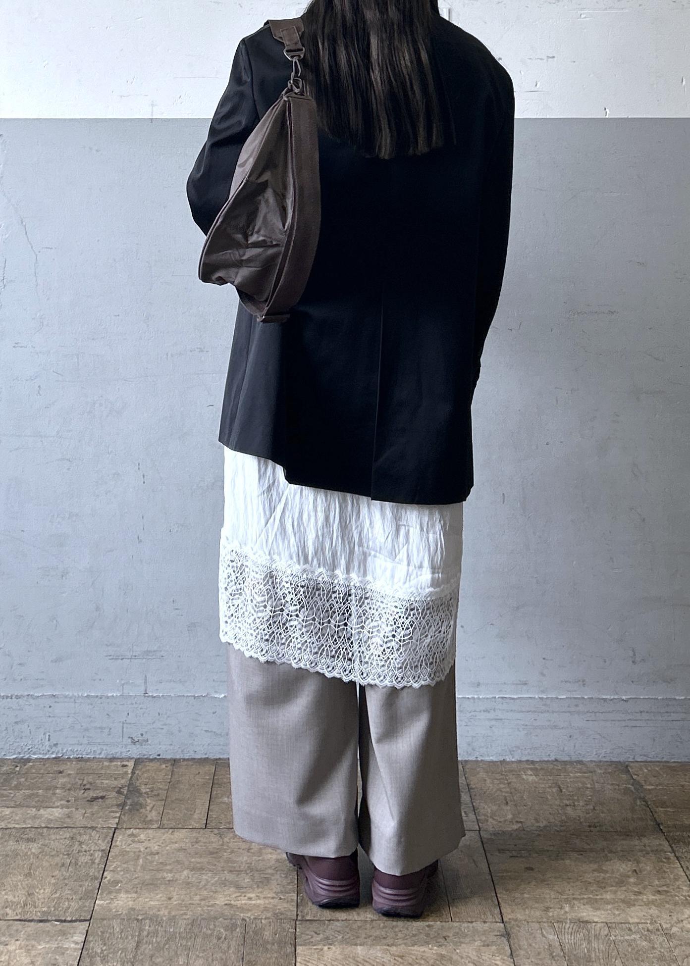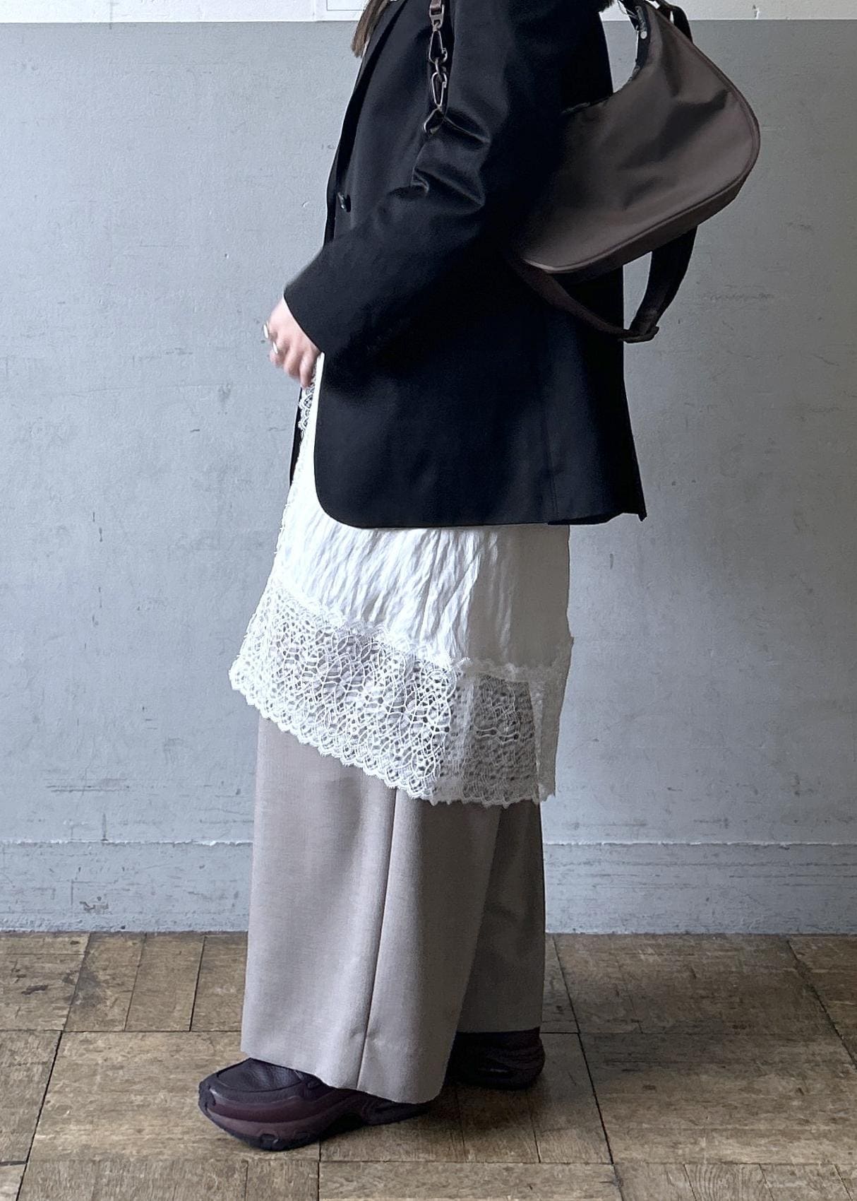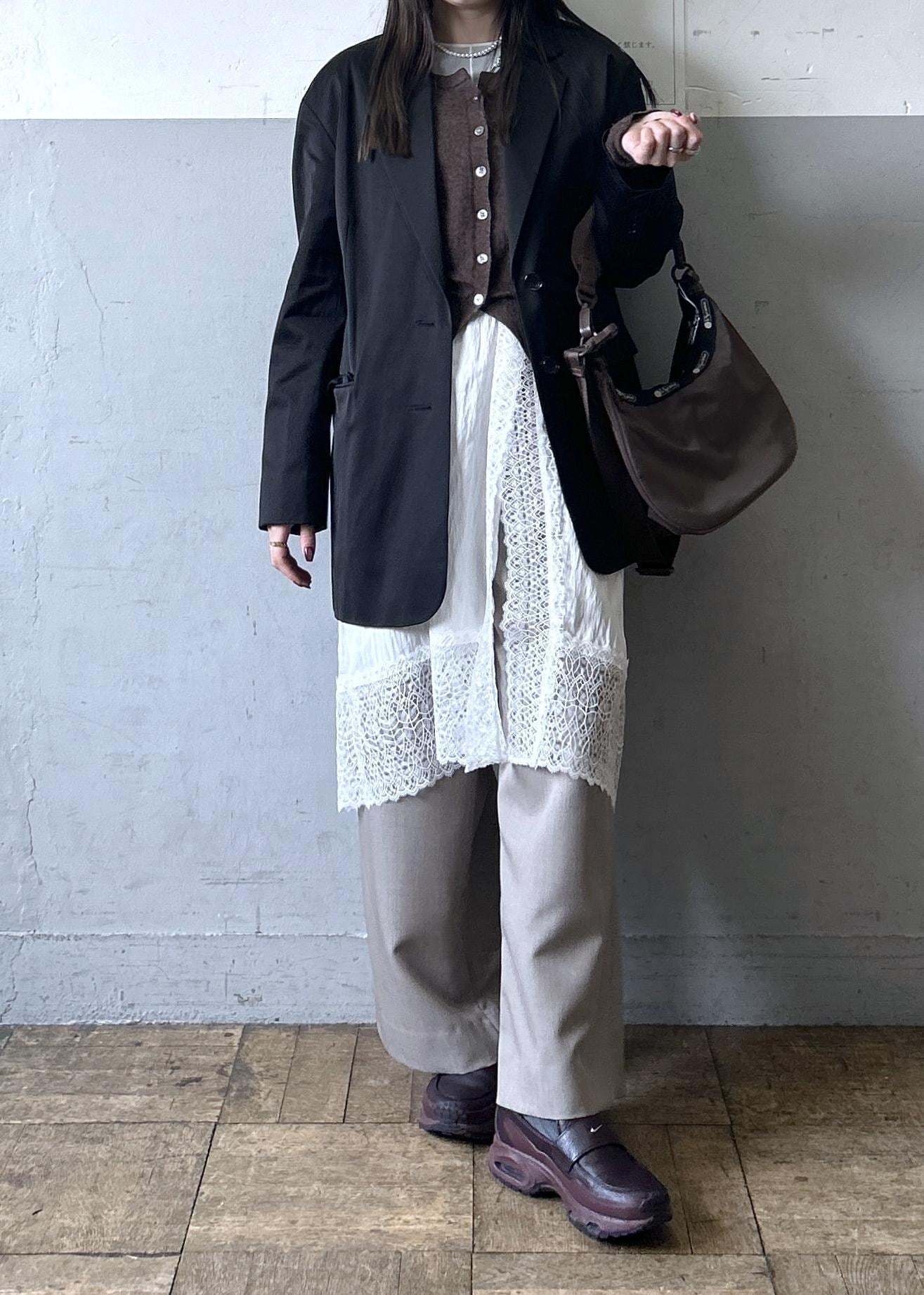 ジャケットにワイドパンツを合わせるだけだと、フォーマルな印象になりがちですが、レーススカートなどをレイヤードすると一気におしゃれ感がプラスされるのでおすすめです!