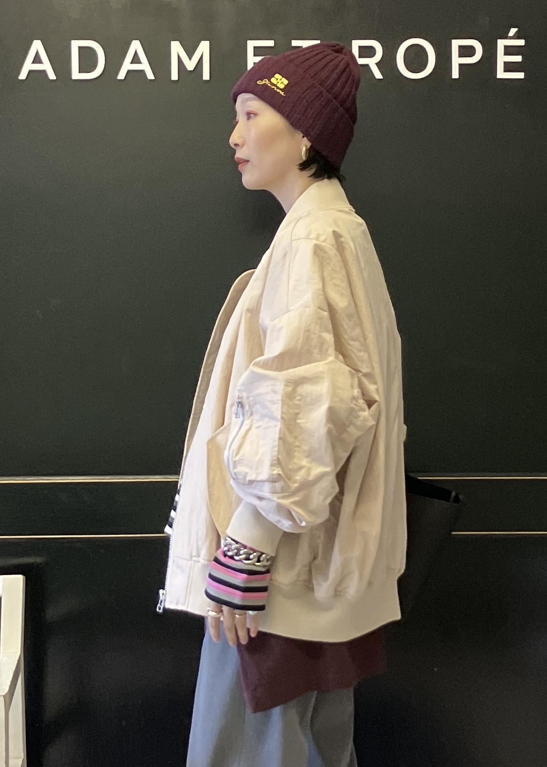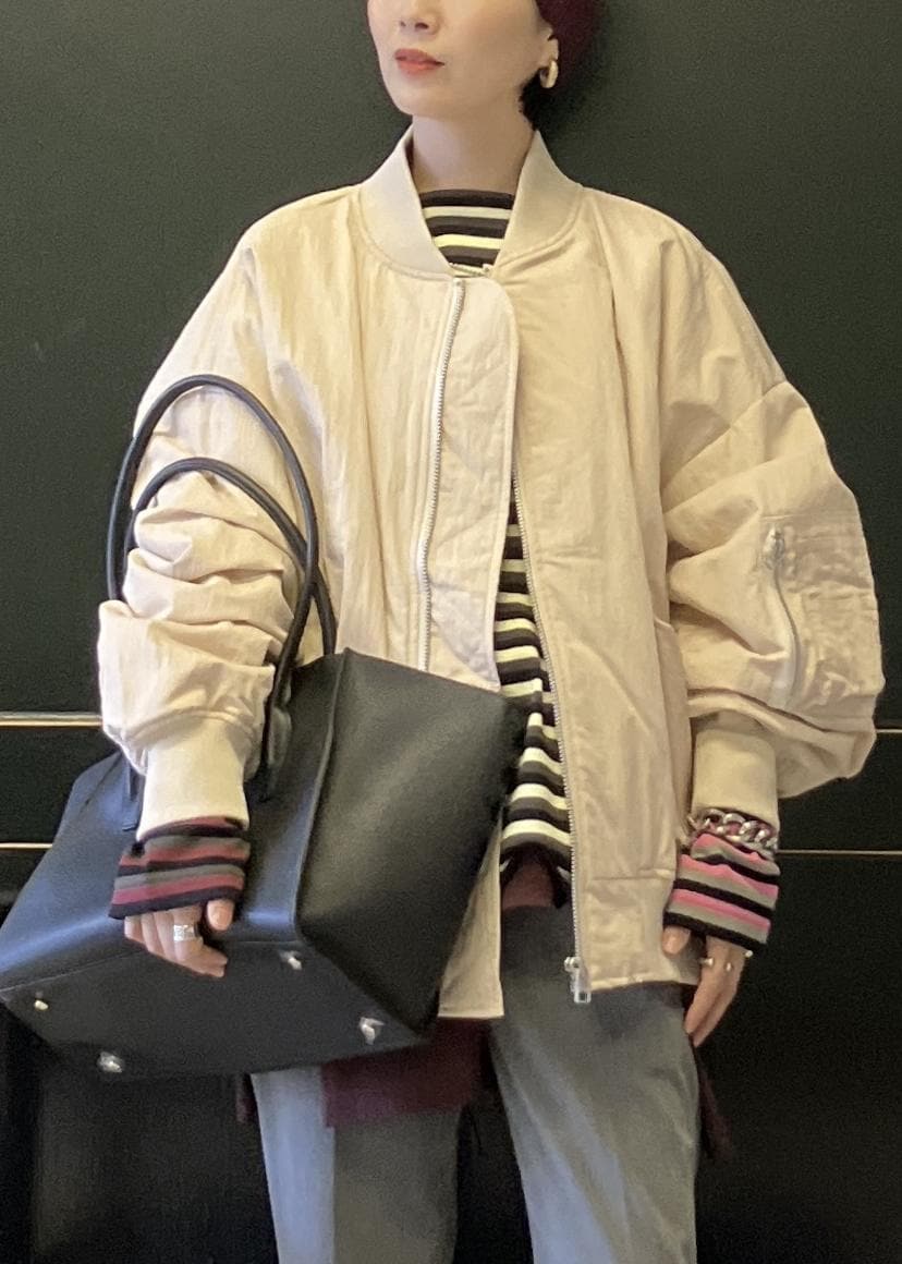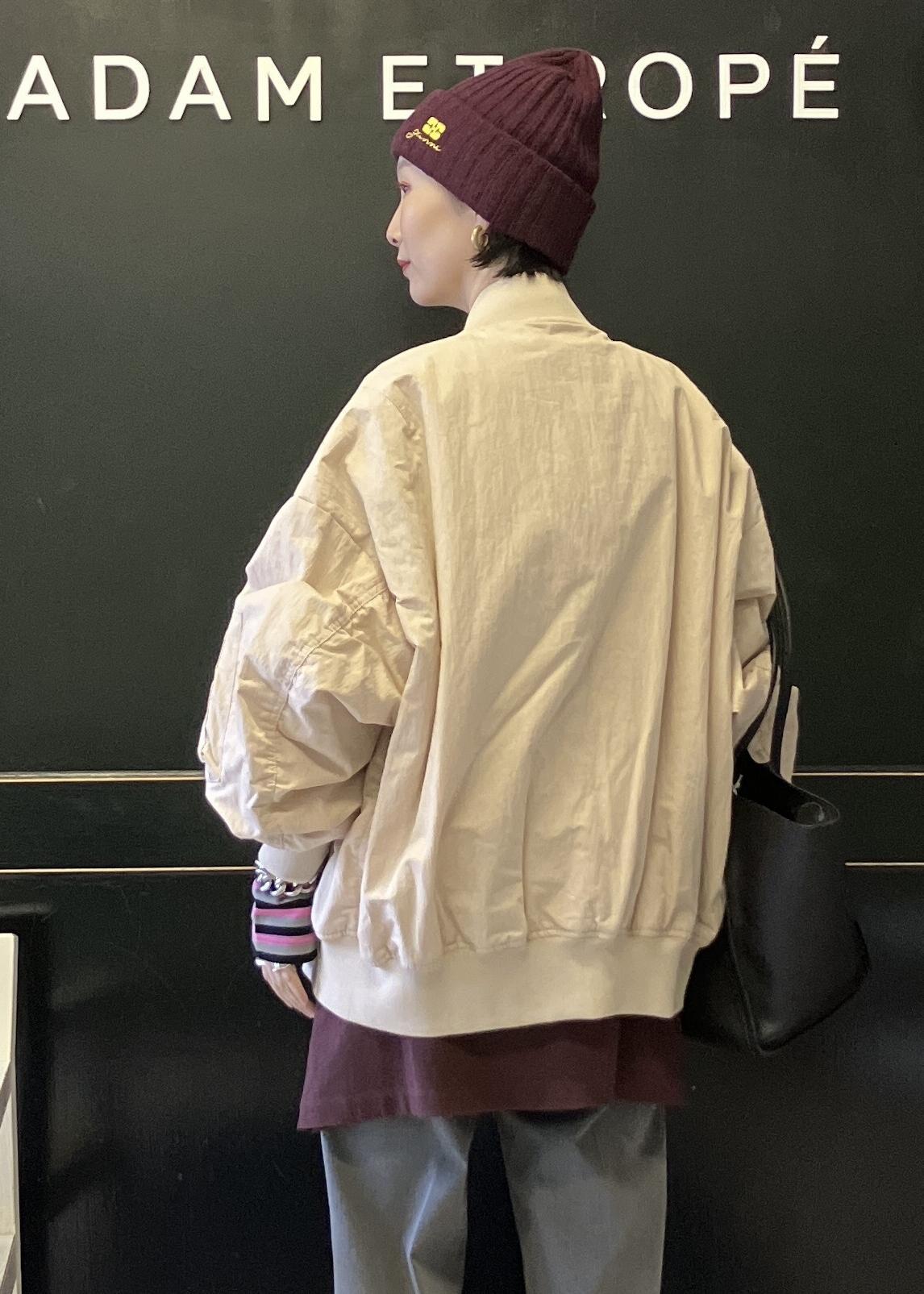 ヌードベージュはMA-1でも、女性らしく着れます。