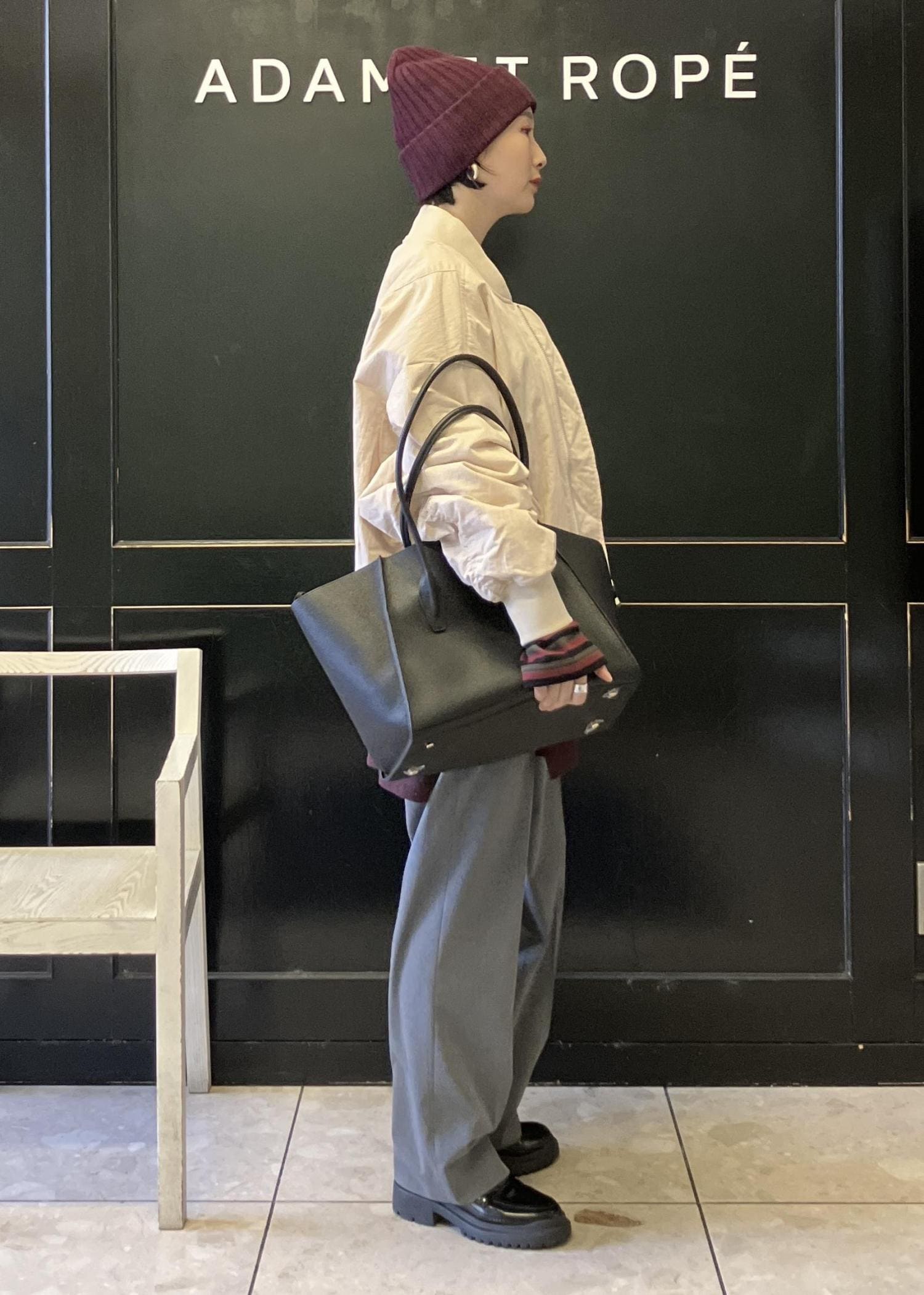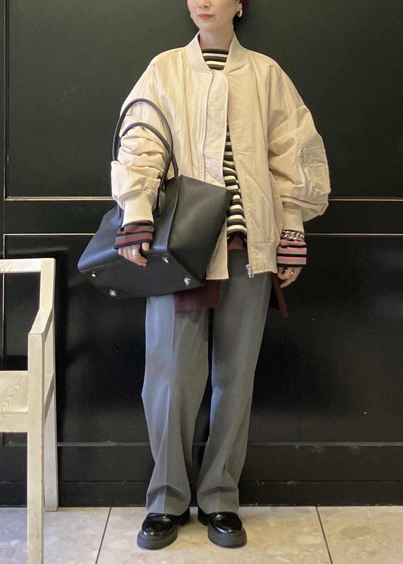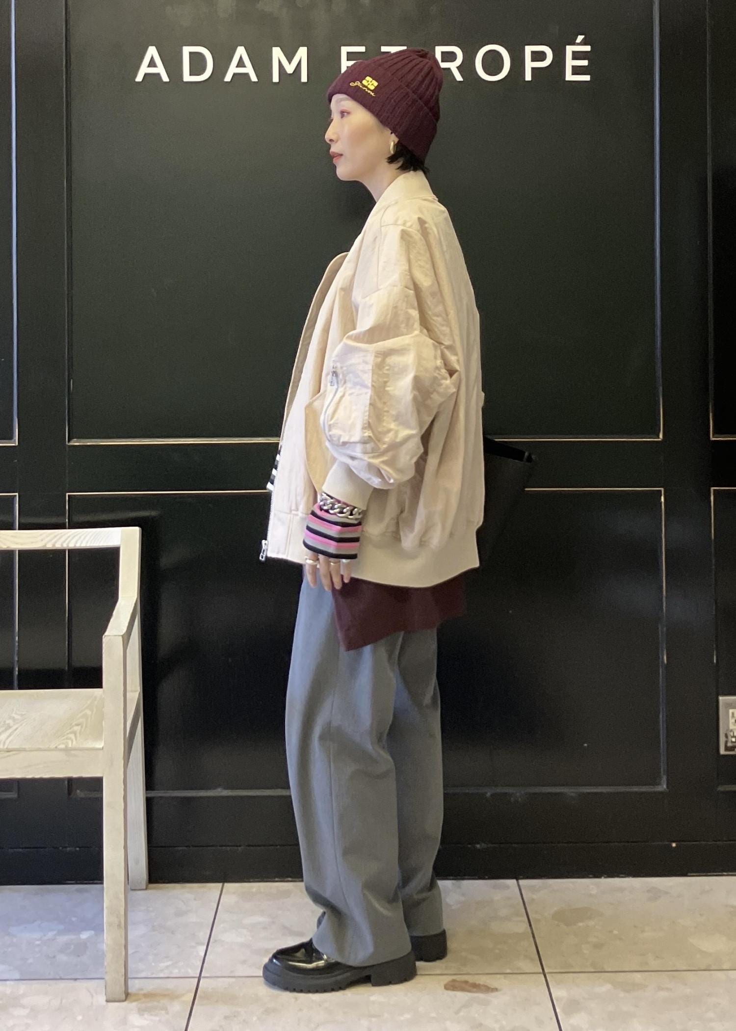 ヌードベージュはMA-1でも、女性らしく着れます。