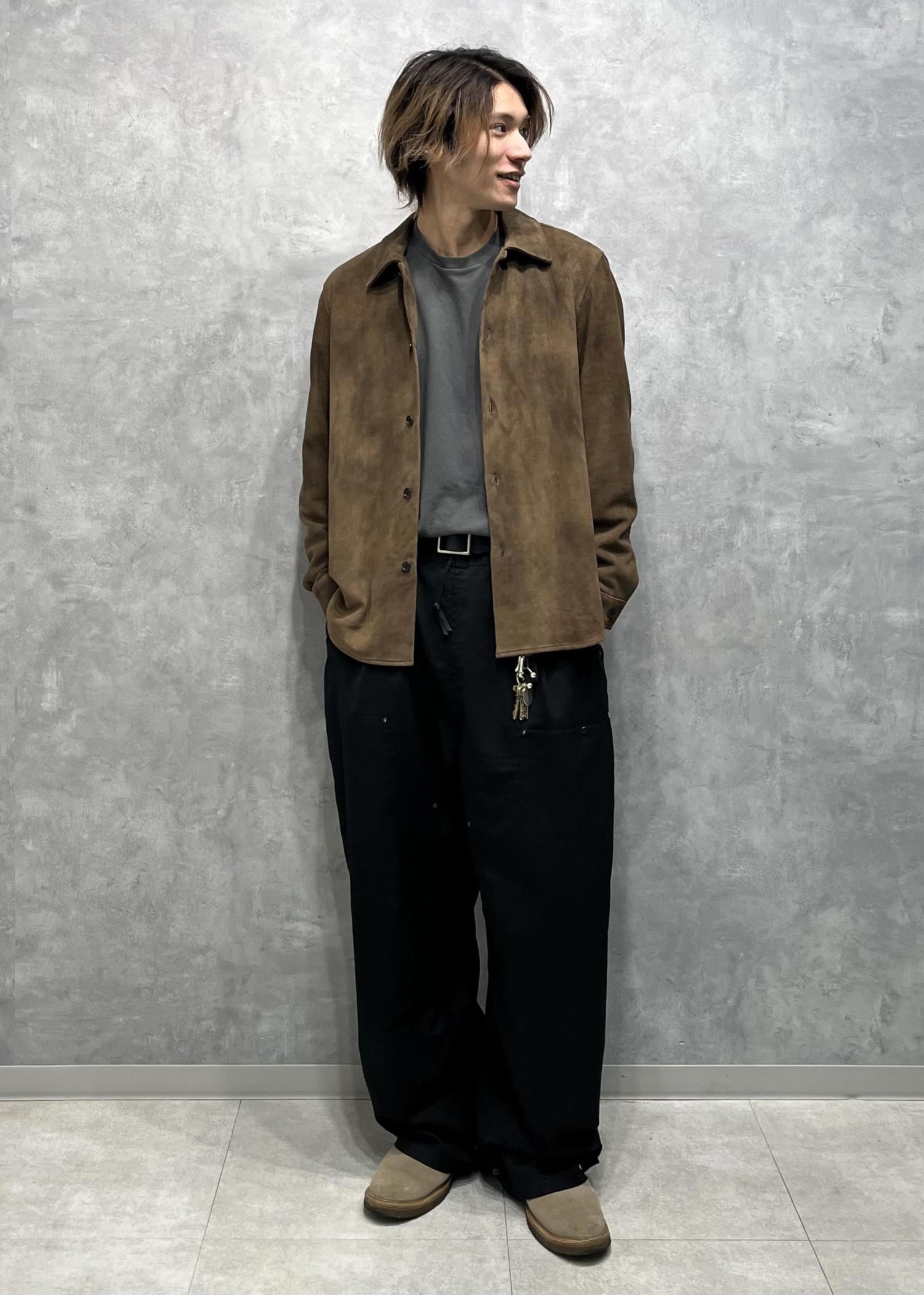 ショート丈ながらも身幅アームホールともにゆったりとしたシルエットで袖口もたまるようなシルエット感が特徴です。ジャケットを羽織る際は少しかさばるため大きめのサイズ感の羽織がベストです。