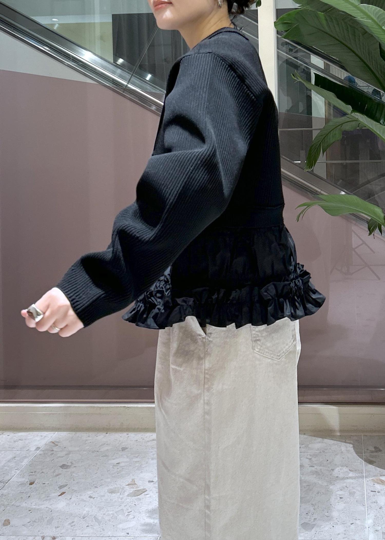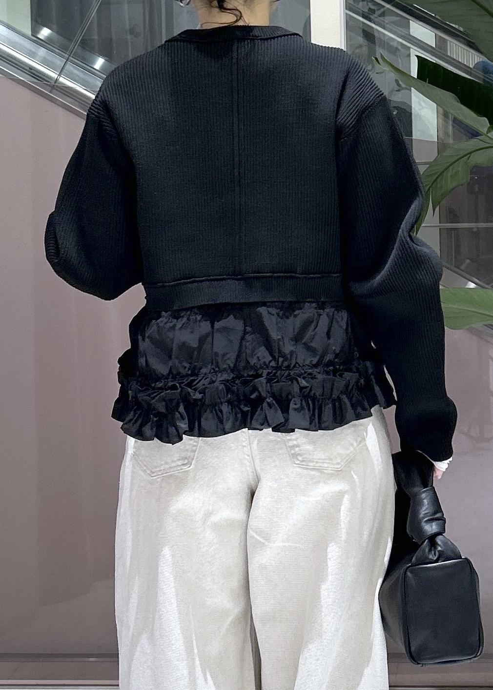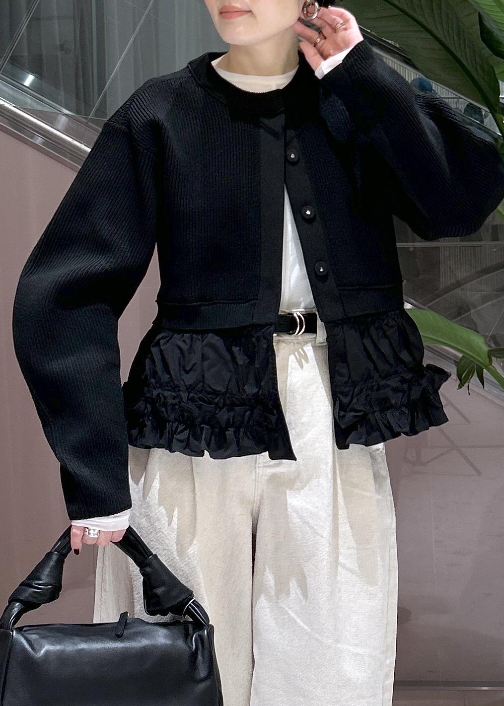 ADAM ET ROPÉ FEMME【サステナブル】ギャザーフリルコンビカーディガンブラック / F¥18,700レビューとっても軽くて張りのある素材。肉感があるので肌寒い時期から春先まで活躍します。