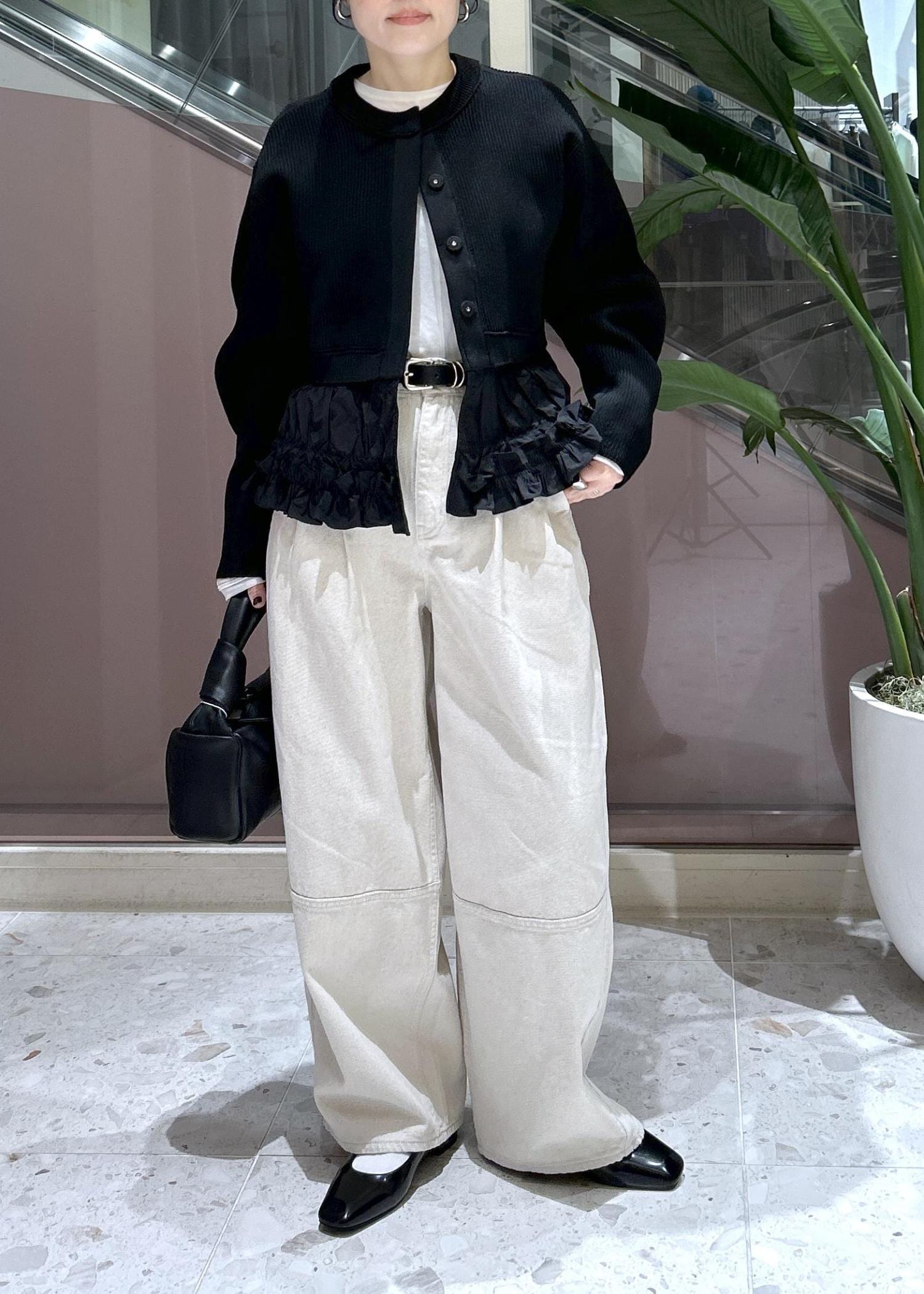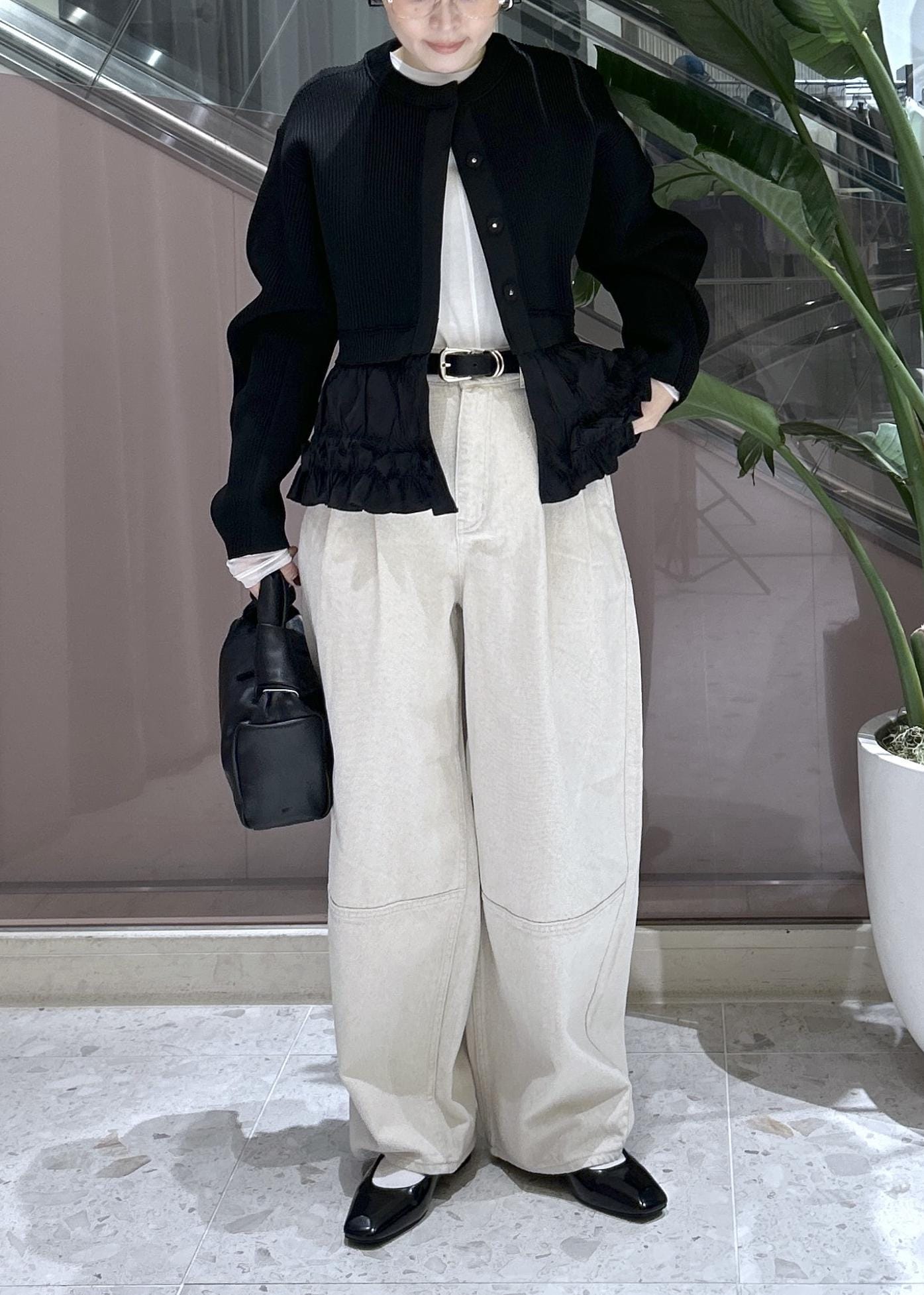 デザイン性のある主役級カーディガンはシンプルに合わせたくモノトーンで合わせました。