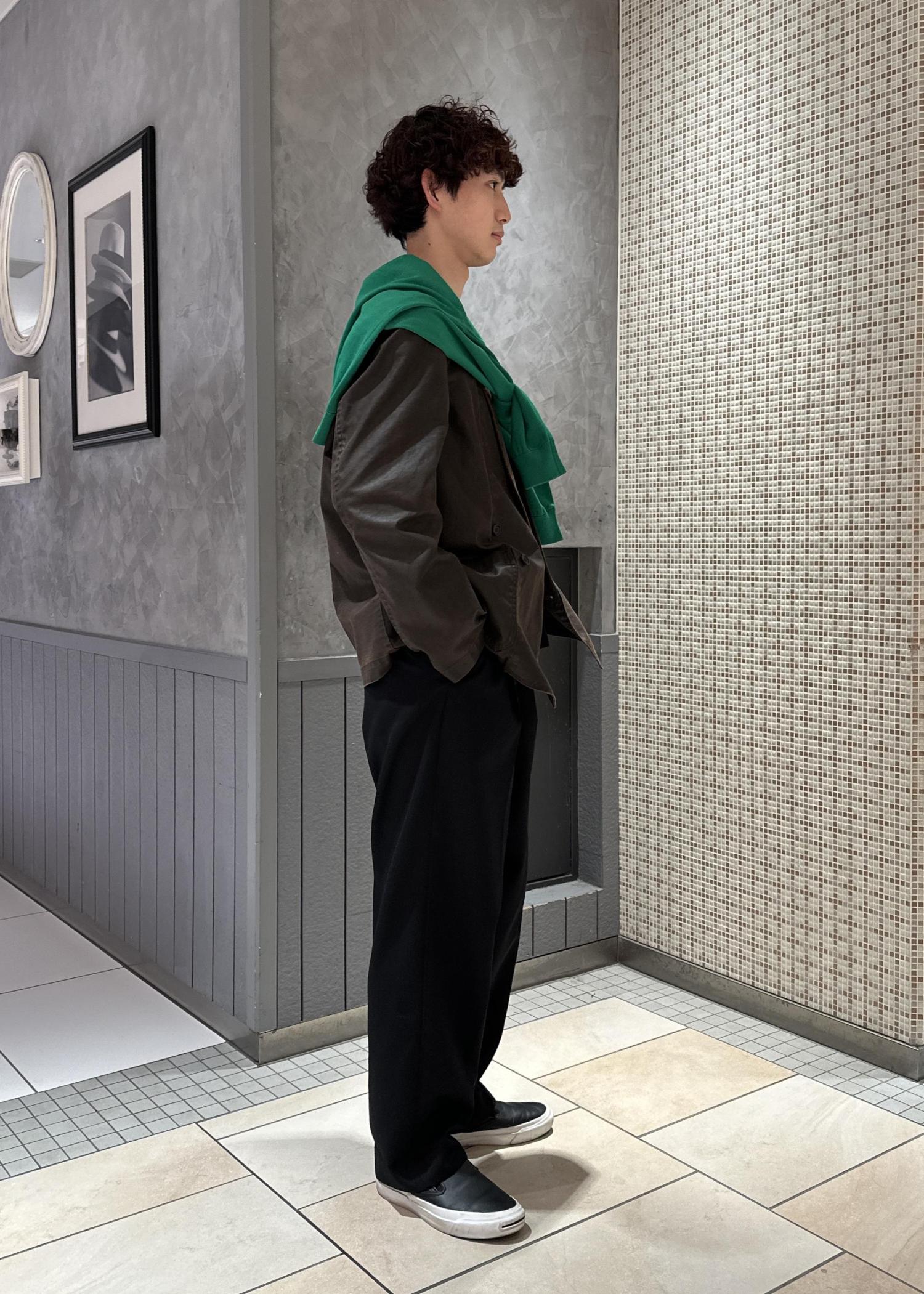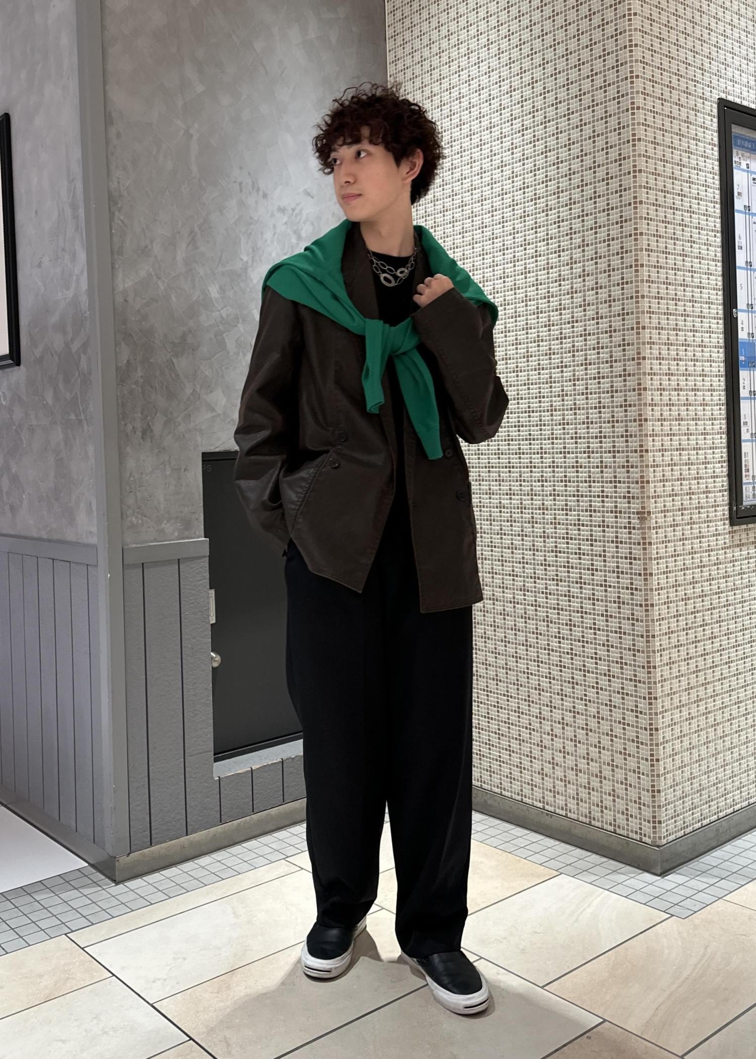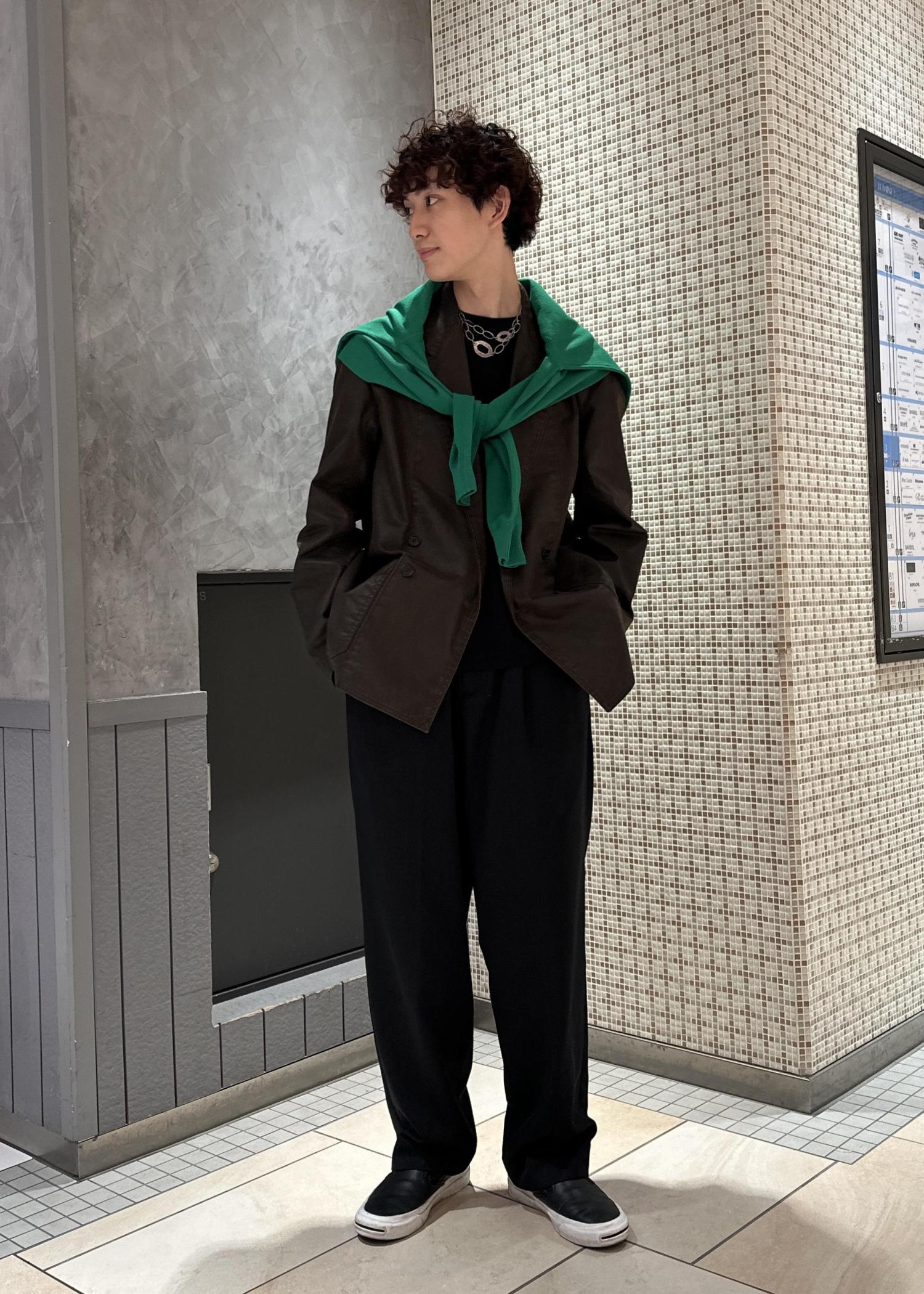 ブラウンのジャケットにグリーンのニットを肩掛けしたアースカラーの配色。暗めのコーデの上から鮮やかな色味を差し色にしたコーデです。肩掛けは差し色にもなり、着脱で気温調節もできるので、おすすめです。