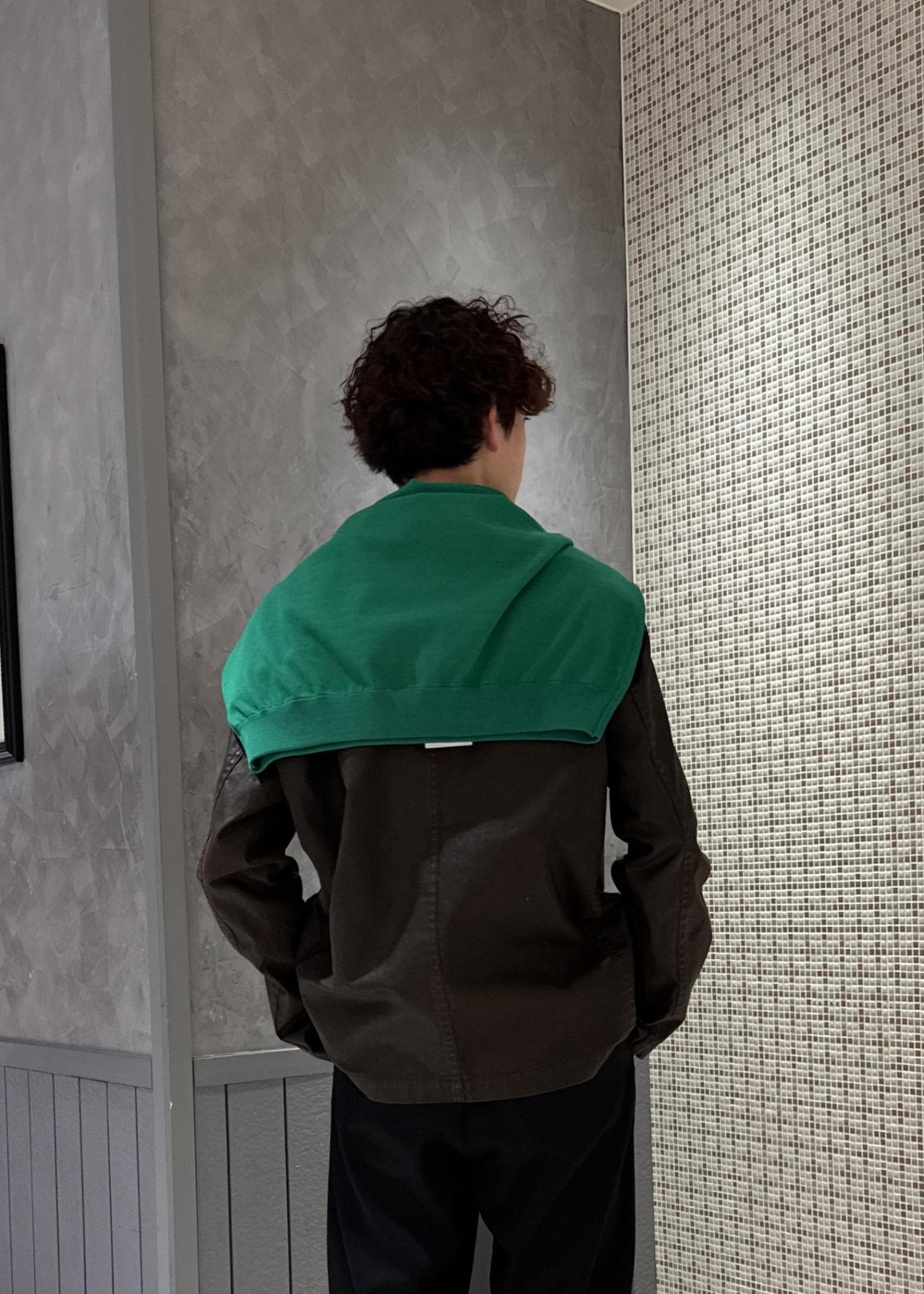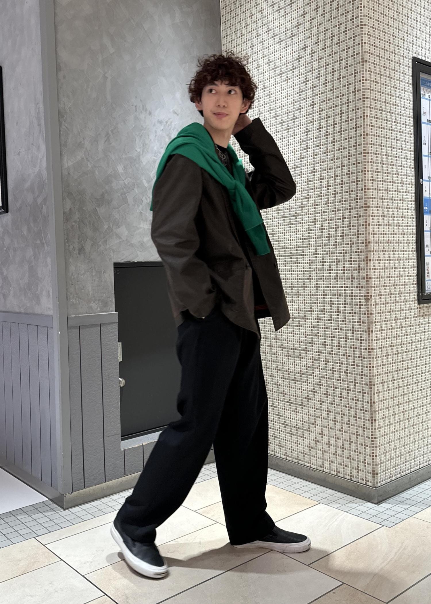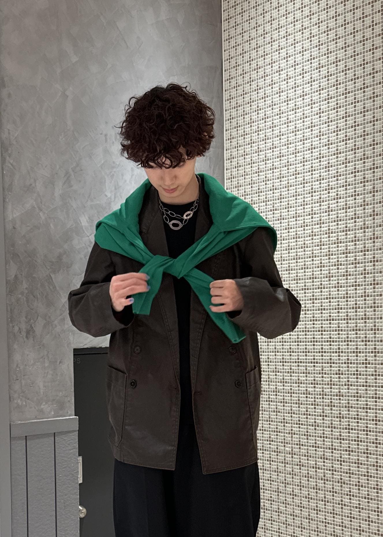 ブラウンのジャケットにグリーンのニットを肩掛けしたアースカラーの配色。暗めのコーデの上から鮮やかな色味を差し色にしたコーデです。肩掛けは差し色にもなり、着脱で気温調節もできるので、おすすめです。