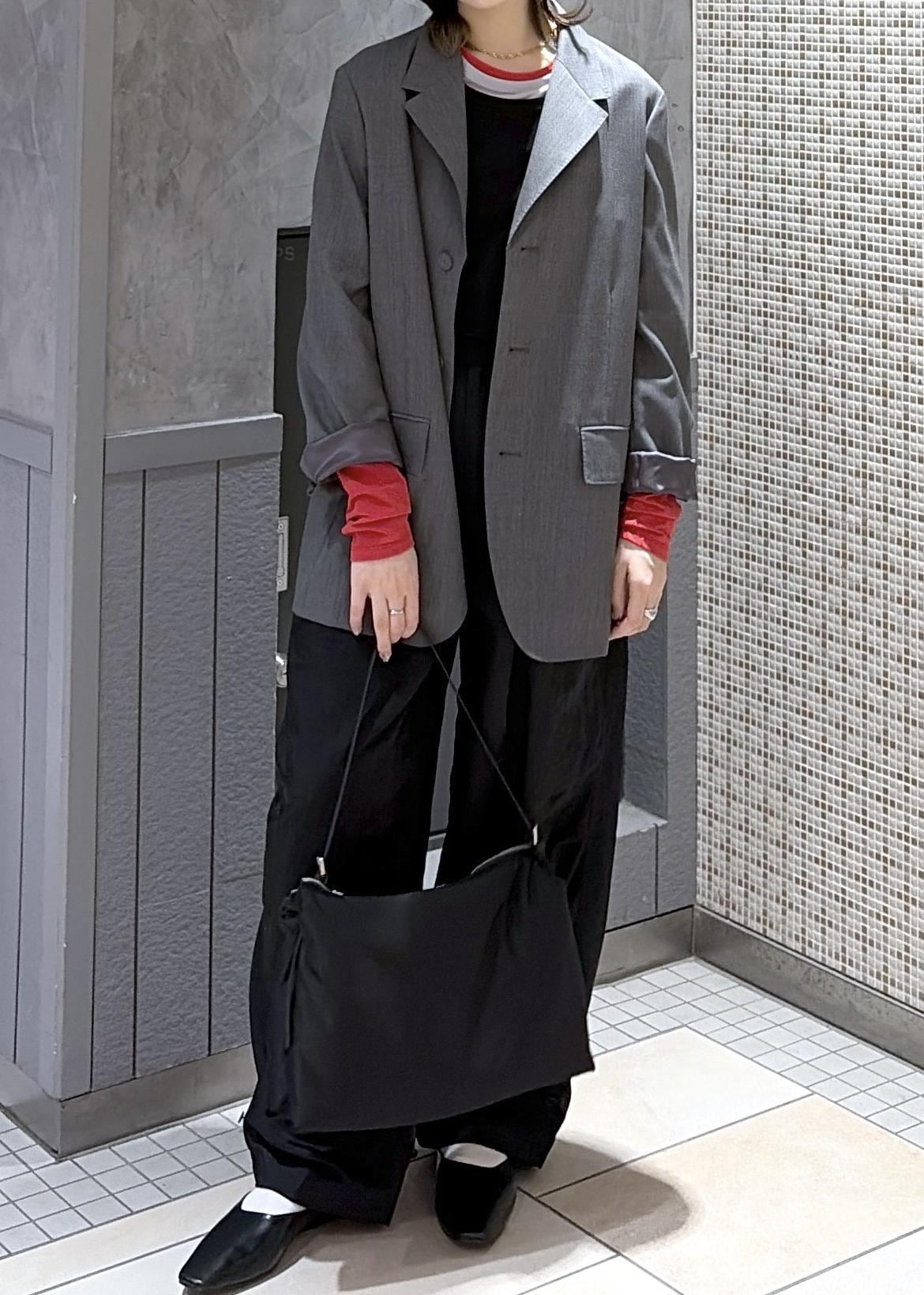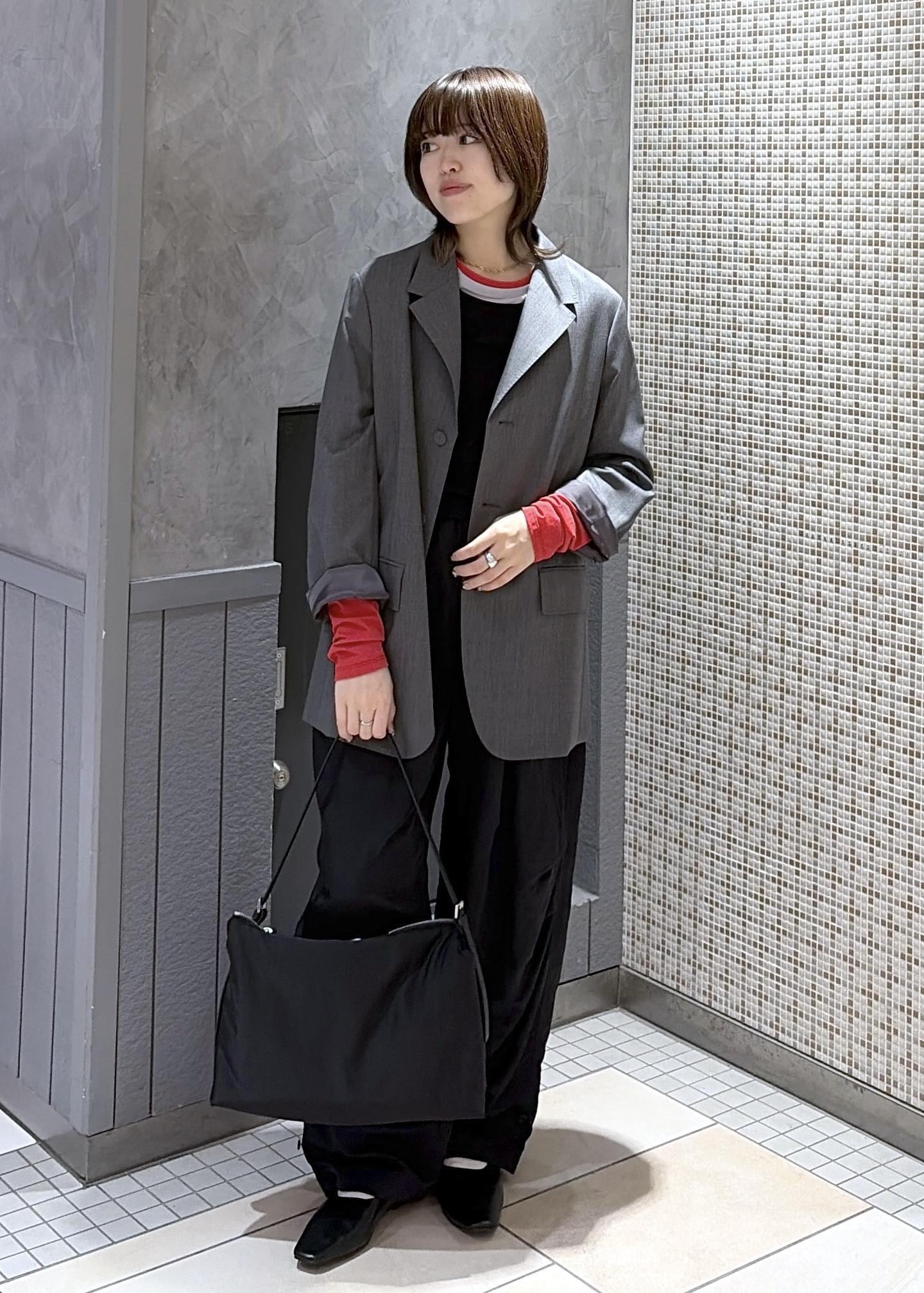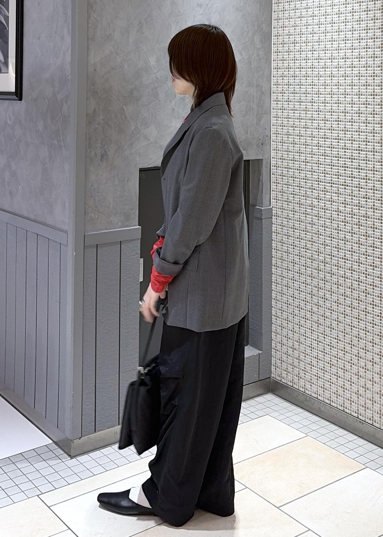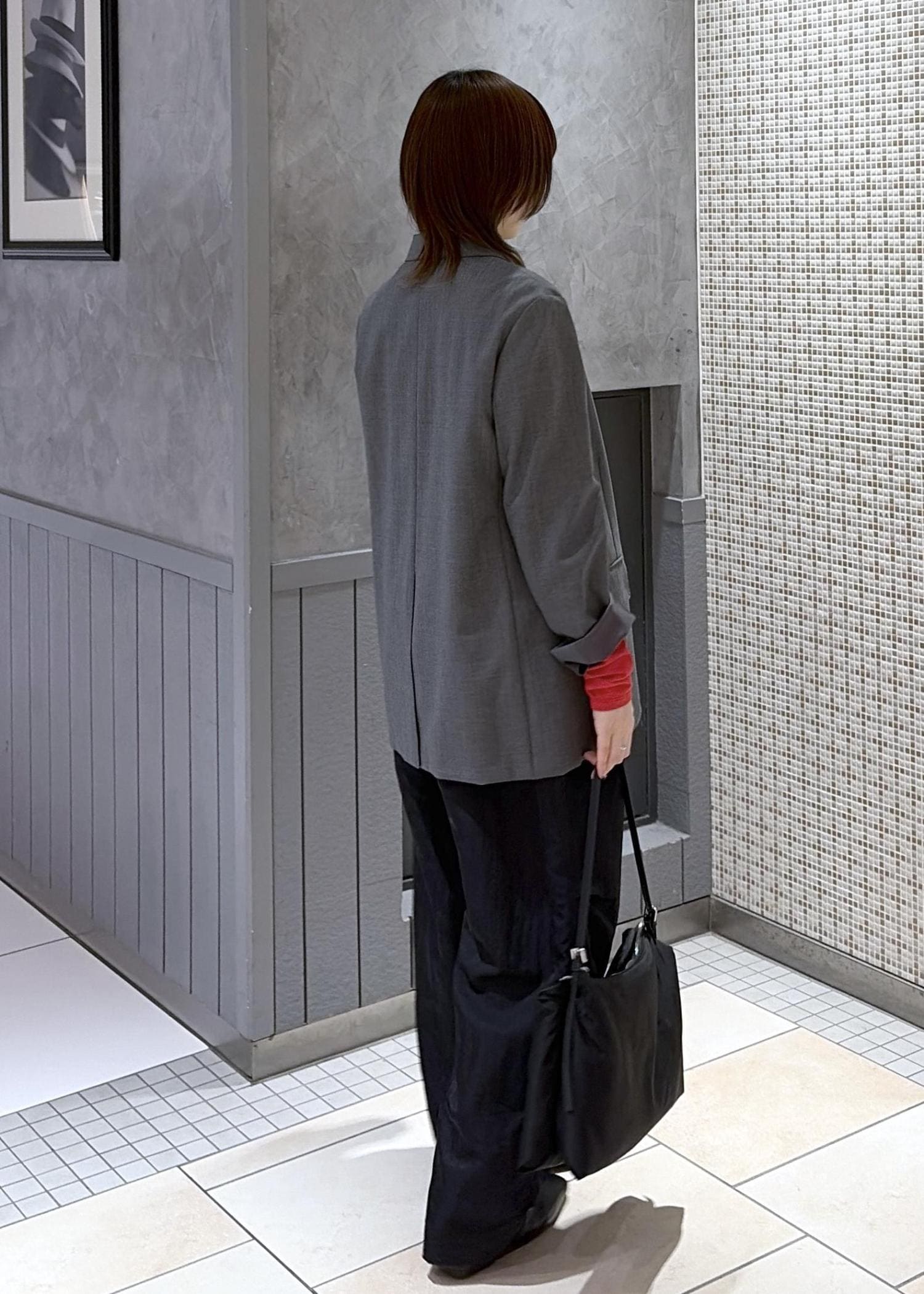 今回は3レイヤードジャージートップスにジャケットを羽織って、大人カジュアルな雰囲気にしてみました。ジャケットでも少しカジュアルにするだけで、普段使いしていただきやすいです◎