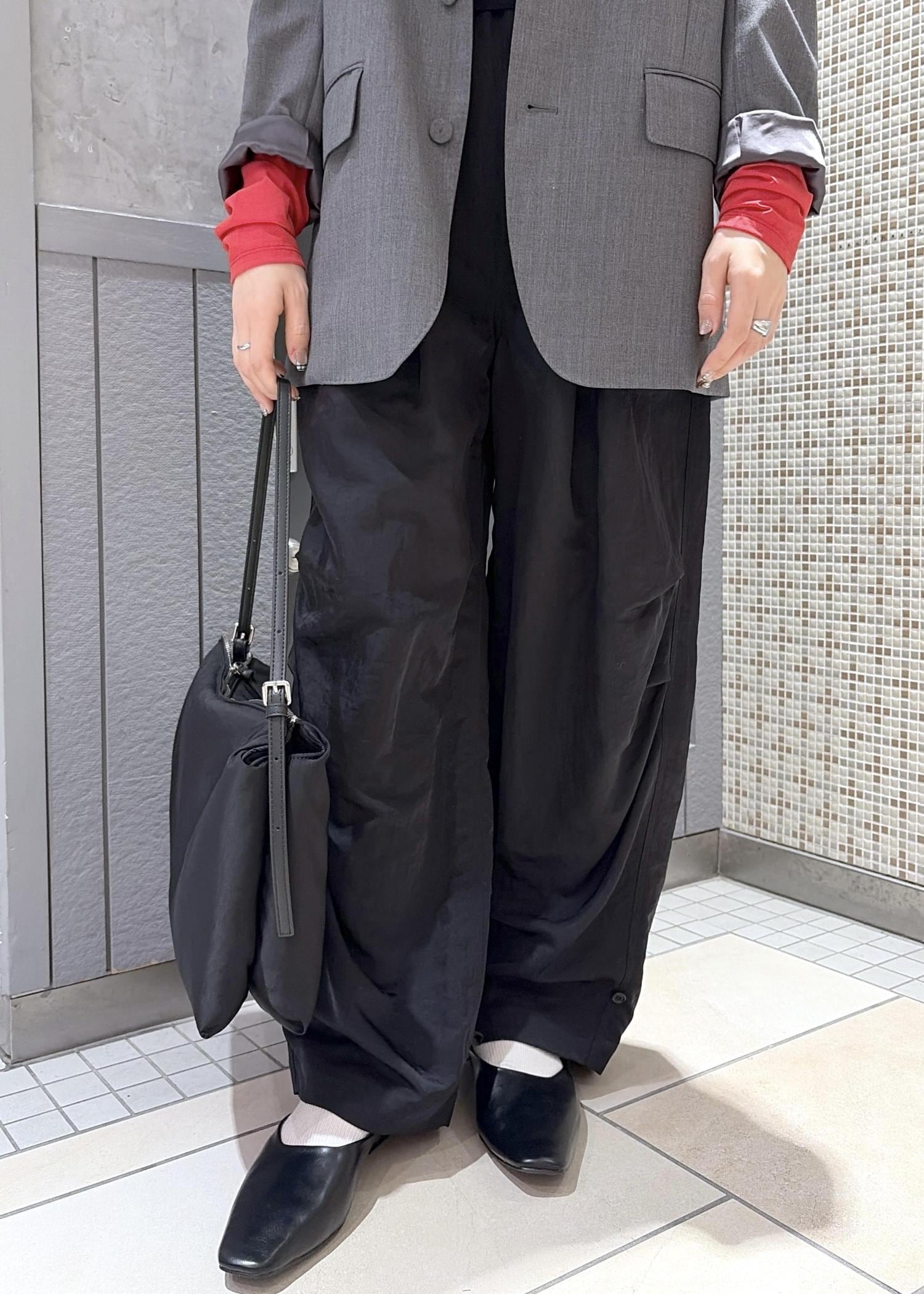ADAM ET ROPÉ FEMME2WAYヘムパラシュートパンツブラック / 36¥24,200レビュー158cmの私はヒール合わせでもゆったりと着用できる丈感でした。今回は足首のボタンを留めずワイドシルエットで合わせてます!