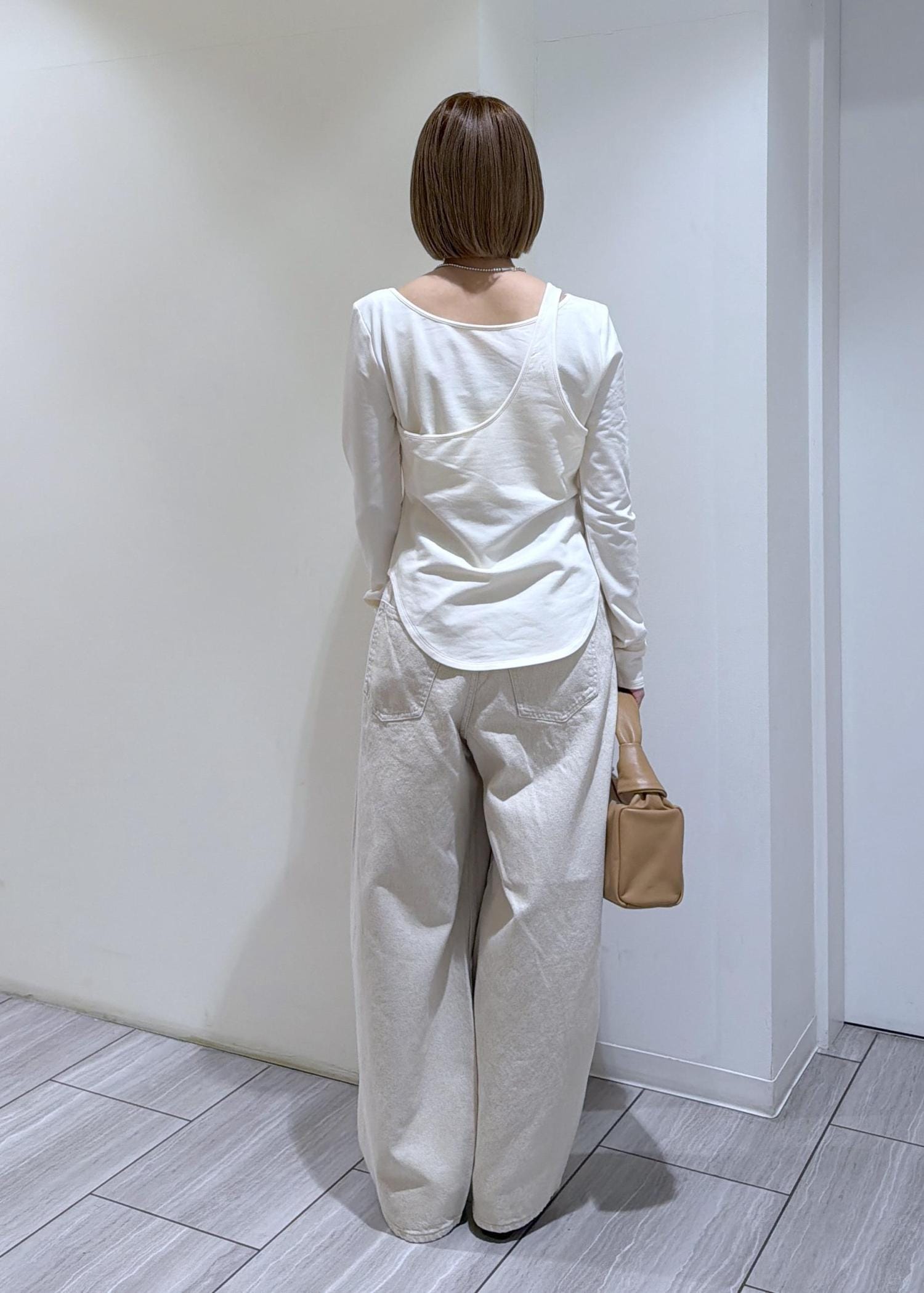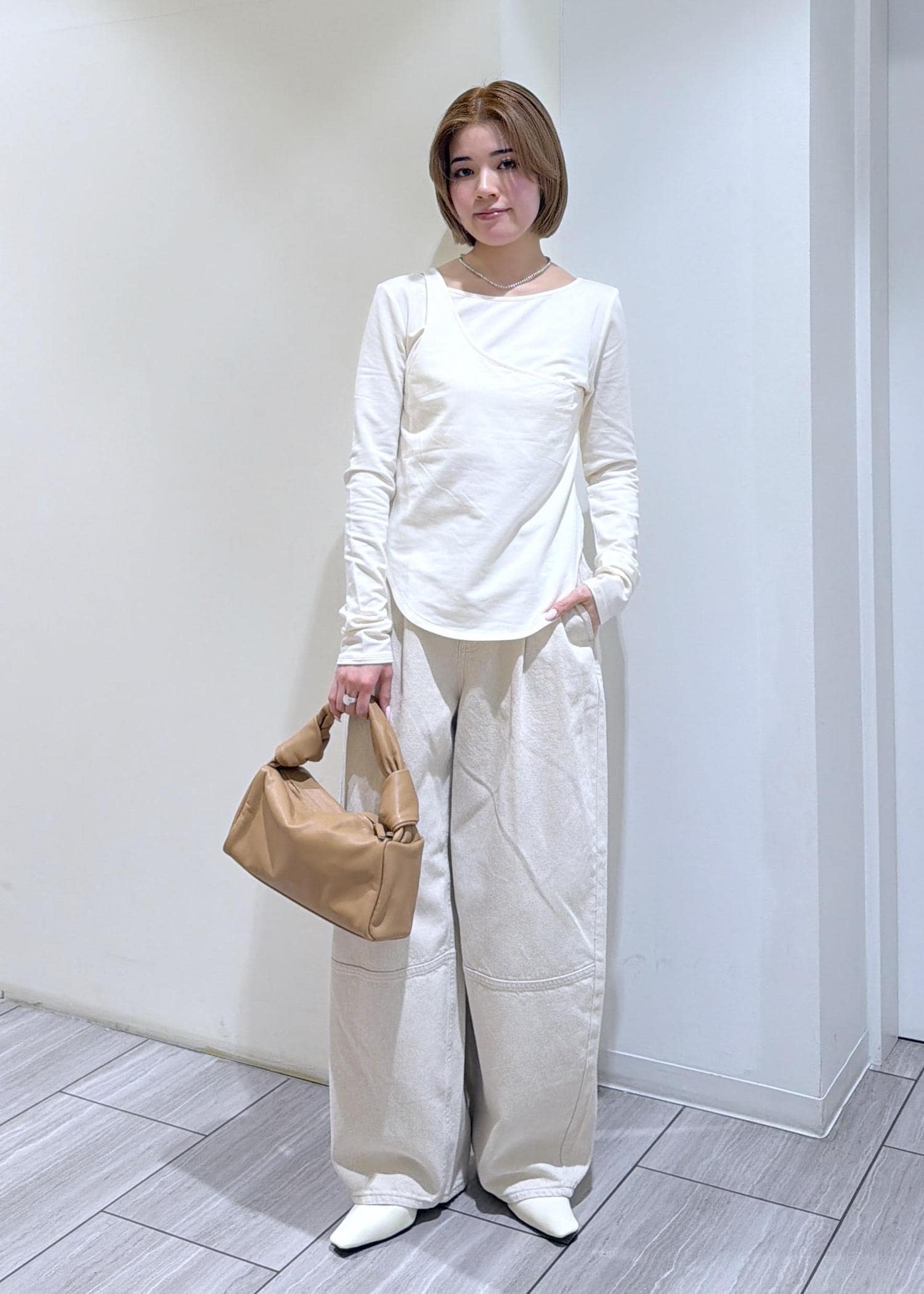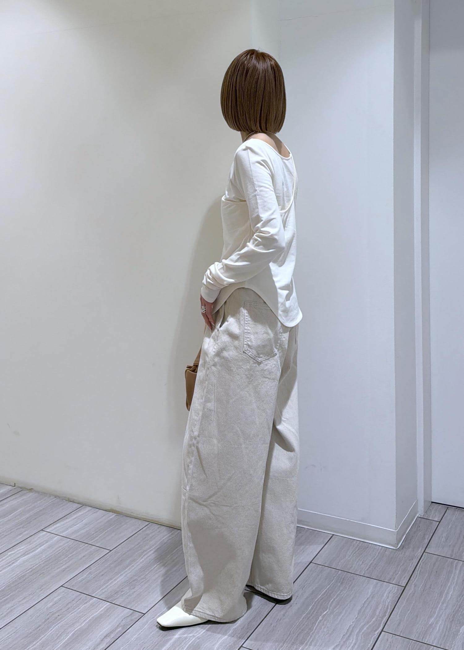 シンプルですが、アシメデザインのトップスとシルエット太めなコクーンデザインのデニムパンツを合わせることで、モードな雰囲気に◯