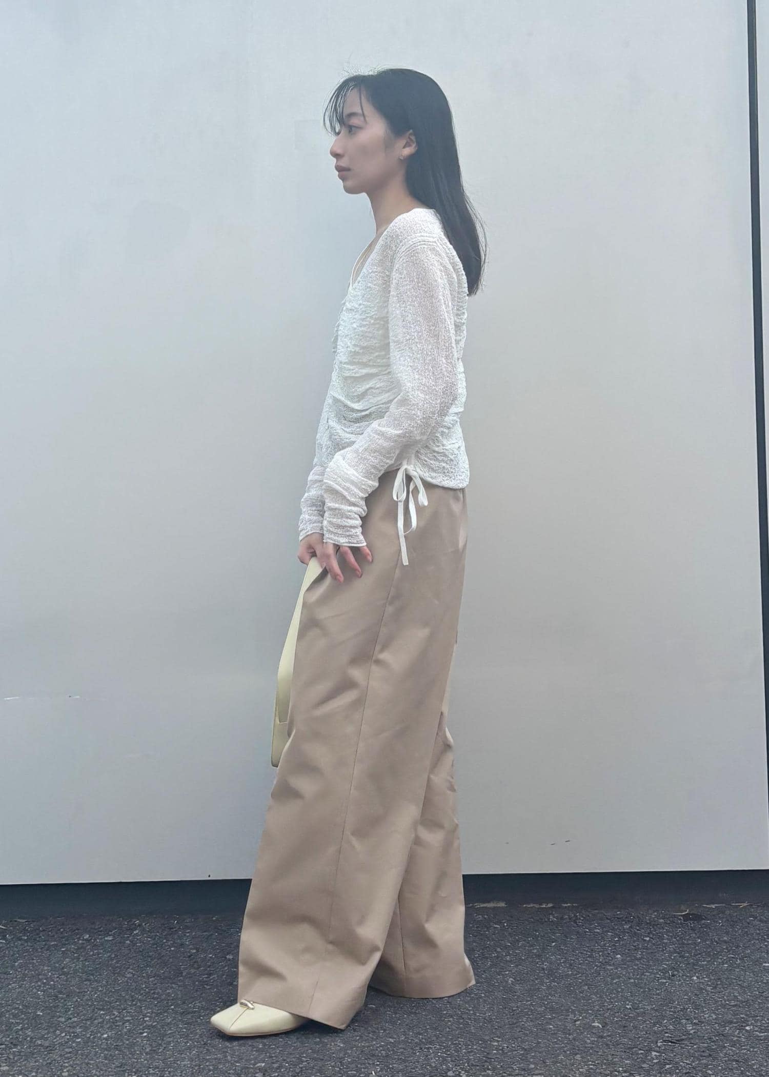 パンツにはベージュを合わせることで