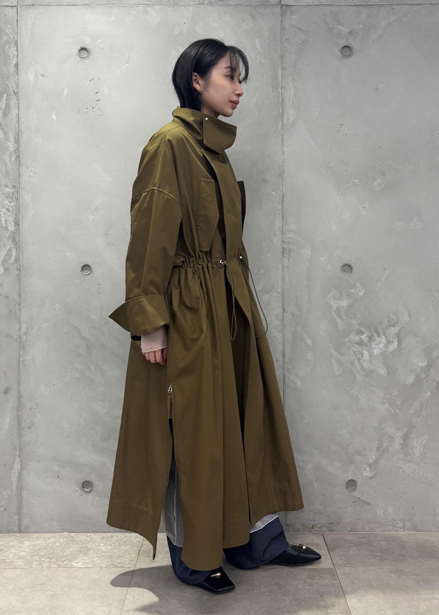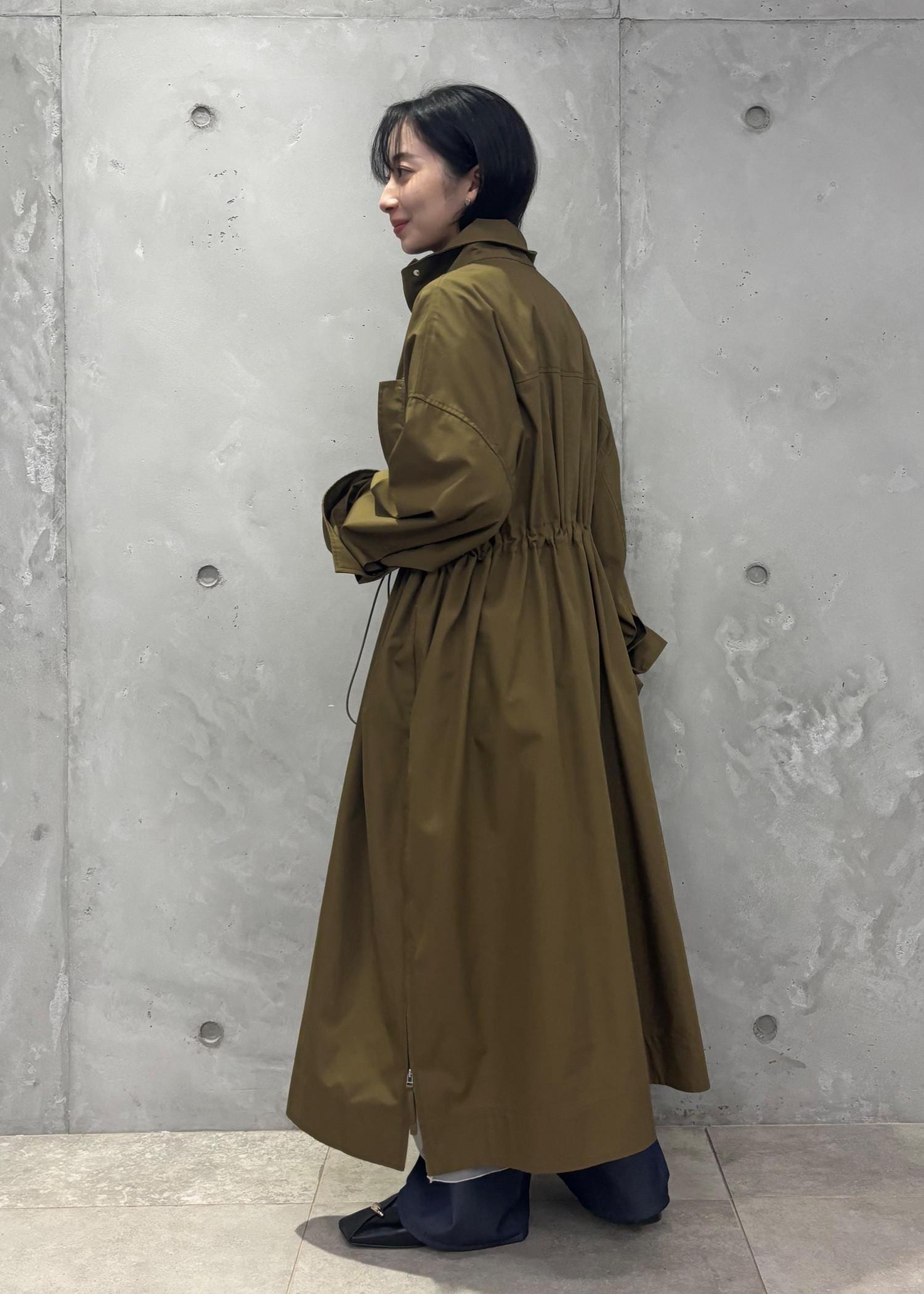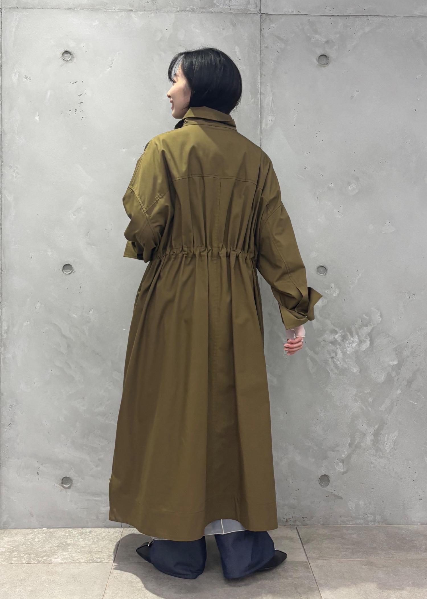 ADAM ET ROPÉ FEMME【WEB限定】・【サステナブル】スタンドカラーロングモッズコートブラウン系 / F¥20,900レビュー余裕のある身幅ですがぶかぶかに見えず、ドロストで調整も可能なので、自分好みの様々なシルエットで楽しんでいただけます!丈感もしっかりあるので、体型カバーにもなります!