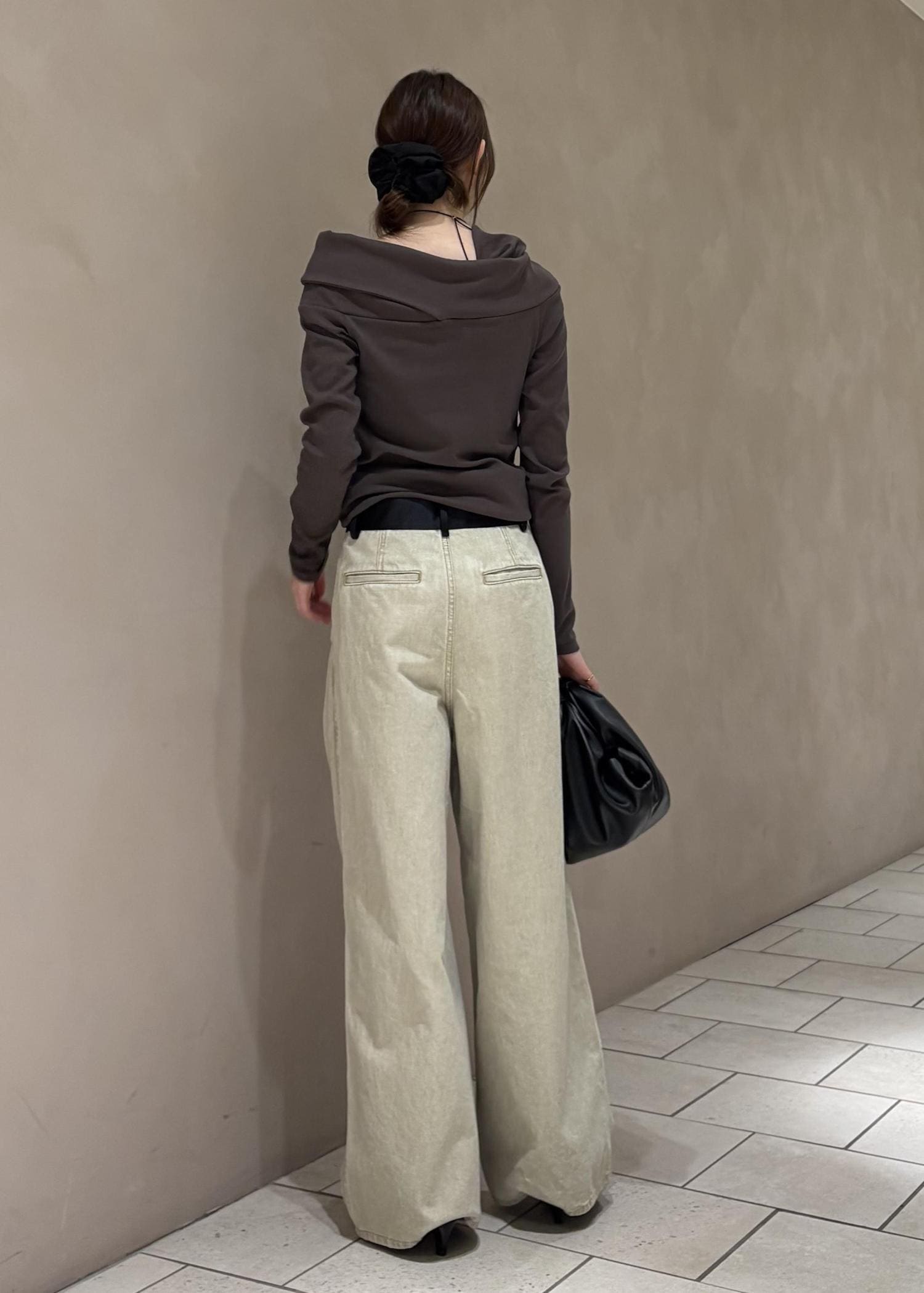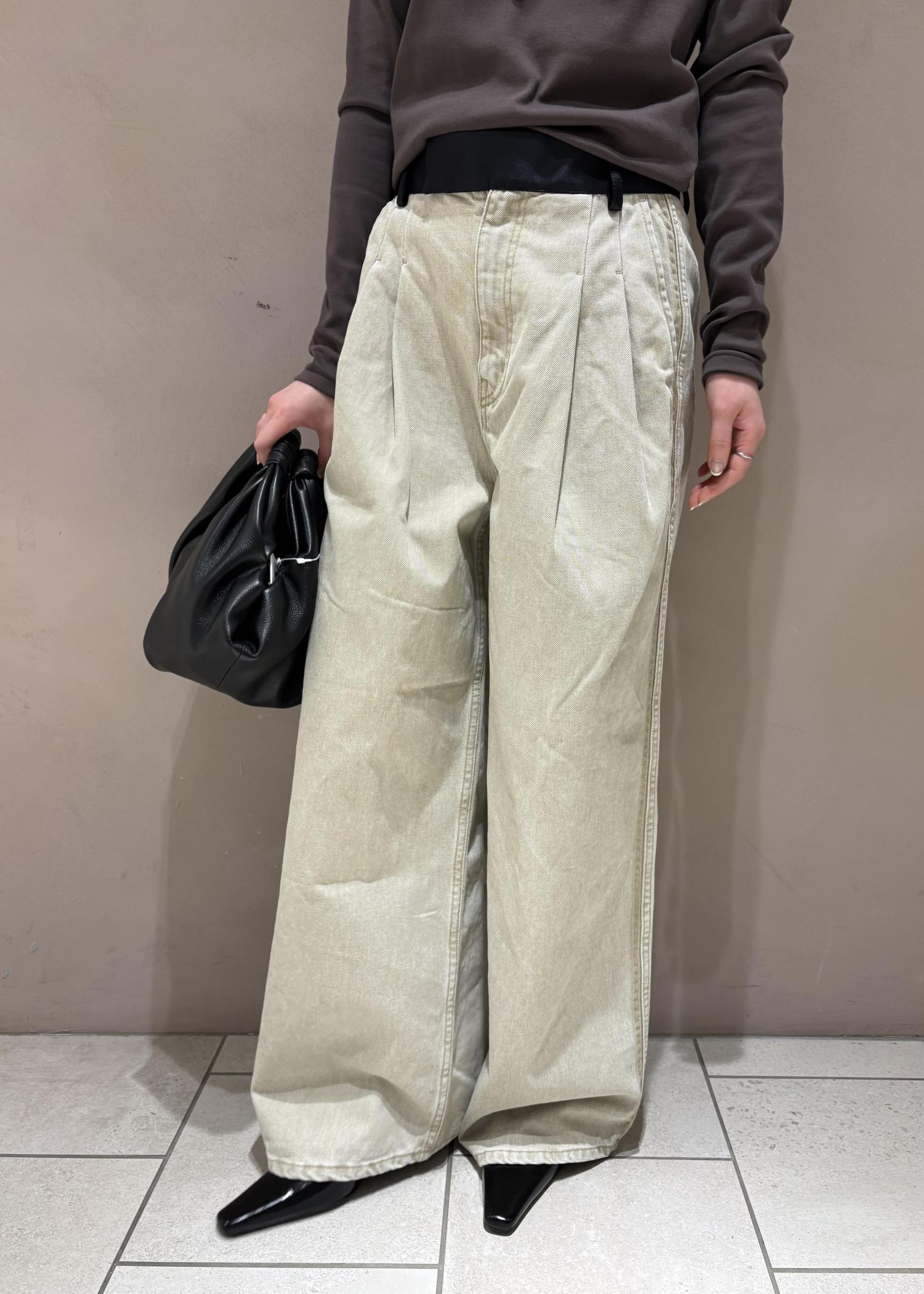 NEW!EMOELLE【EMOELLE】ドレスデニムパンツ(バイオ加工)ベージュ系 / 36¥24,200レビューワイドシルエットですがウエストの黒の色味で引き締まった印象に。カジュアルすぎずに履けるデニムです!