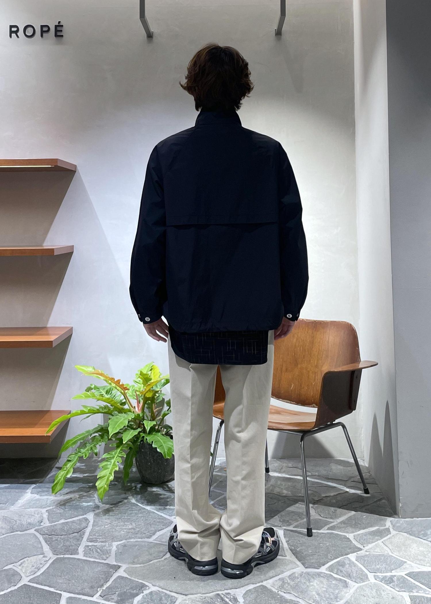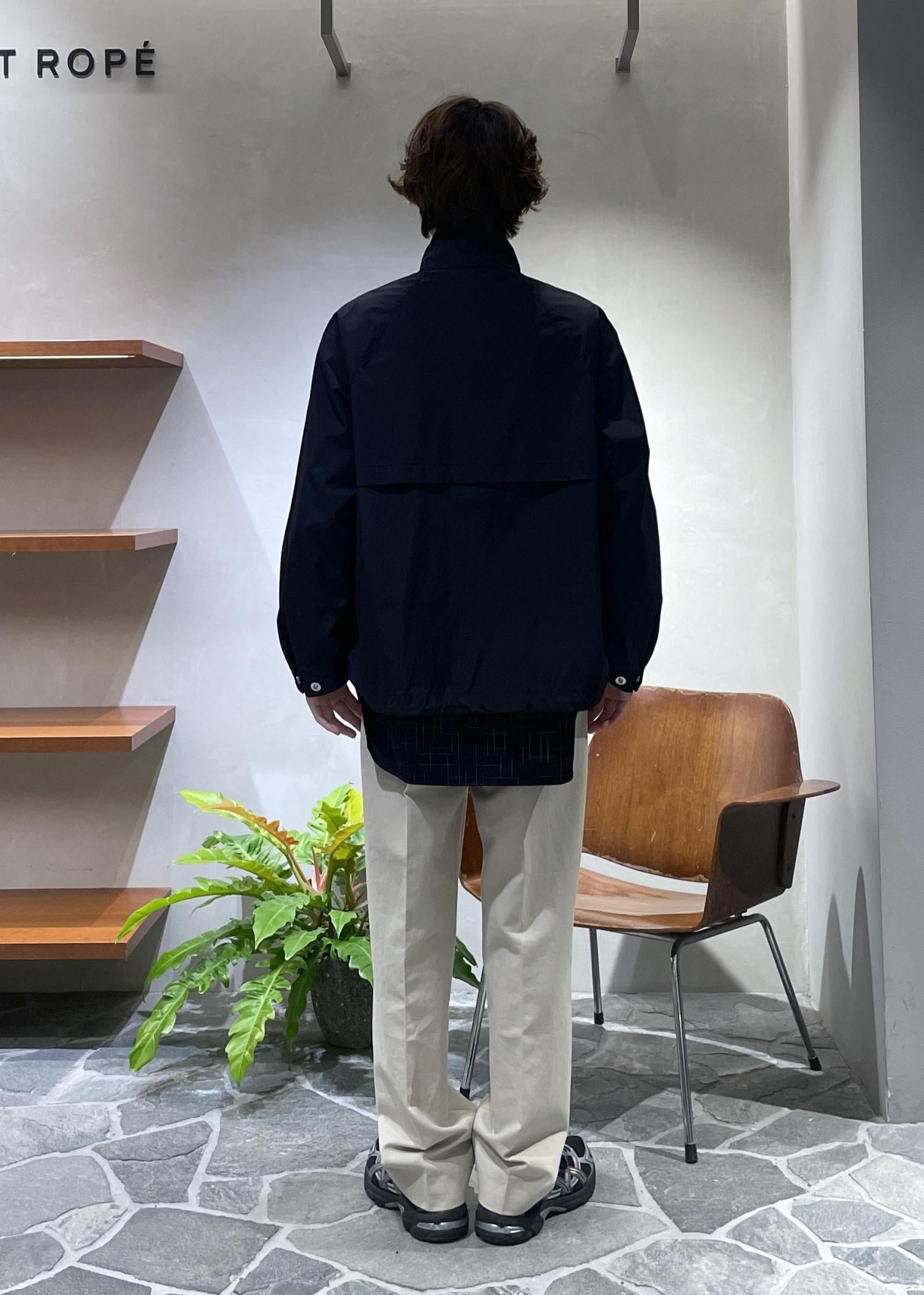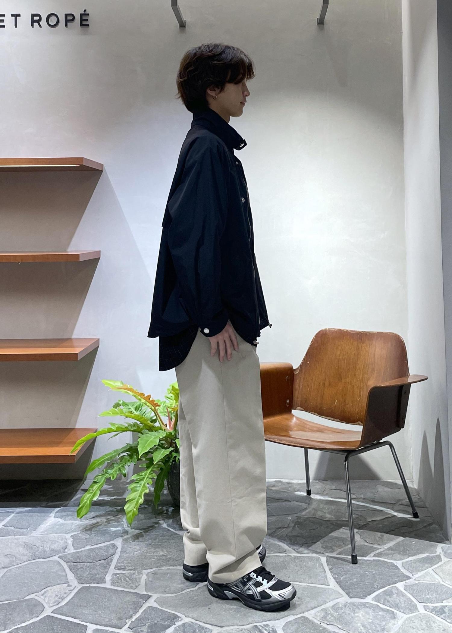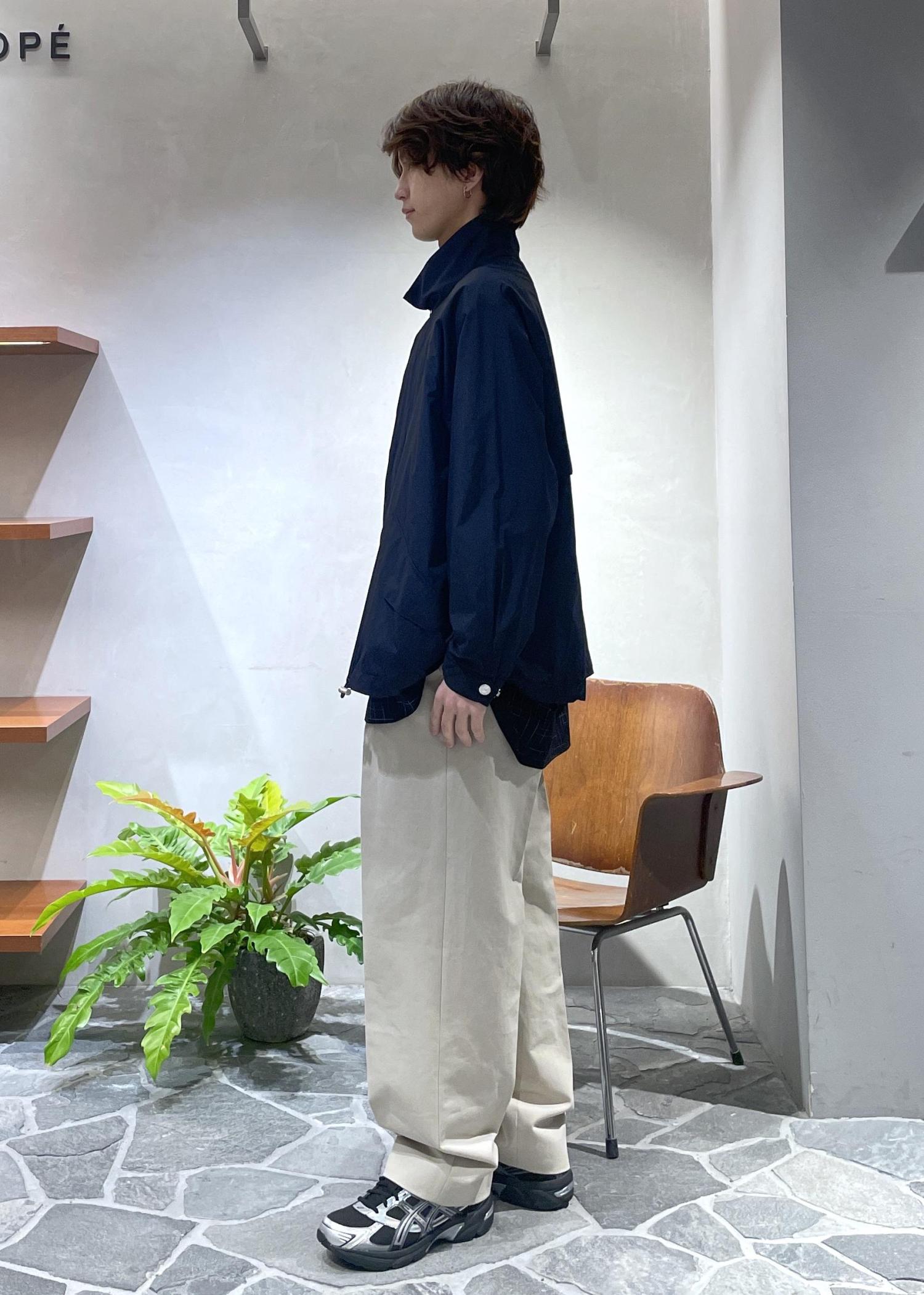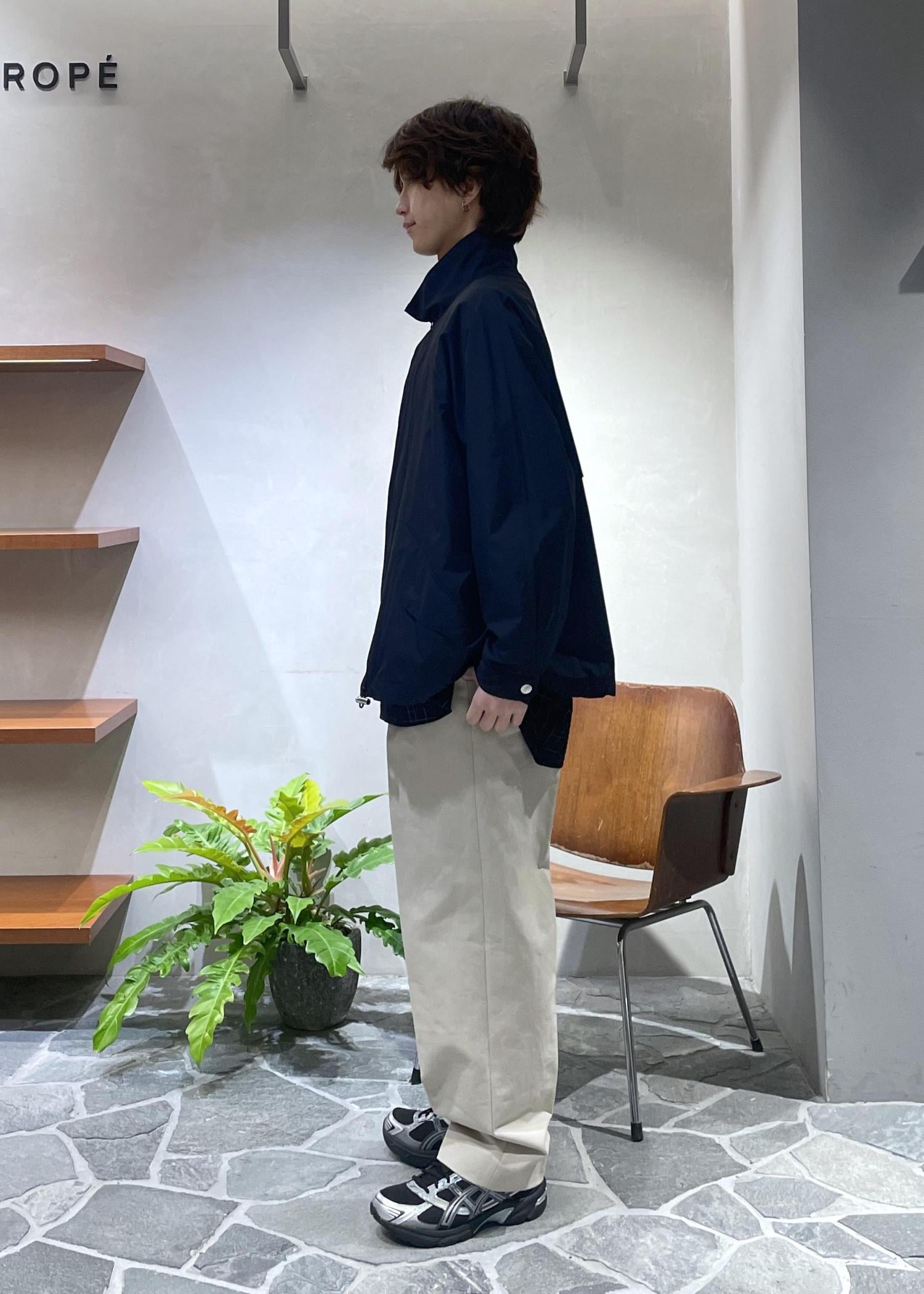 MACKINTOSHの別注アイテムを使ったコーデです。ミリタリー要素もありつつ、モダンで上品な印象で、デニム、スラックス、スウェットパンツと、どんなボトムスとも合います◎