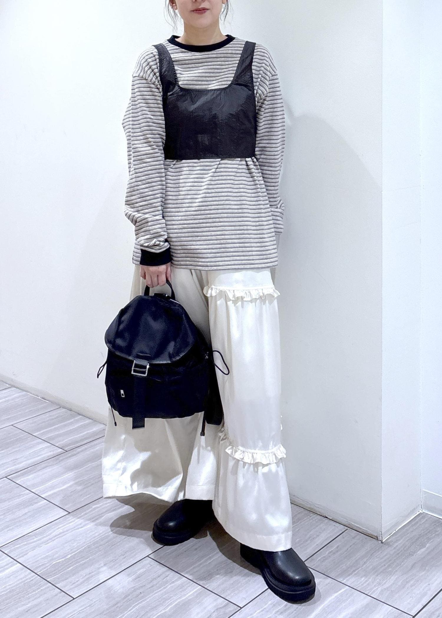 前後ろで着用可能なビスチェとのセットで、手持ちのアイテムとの合わせも◎