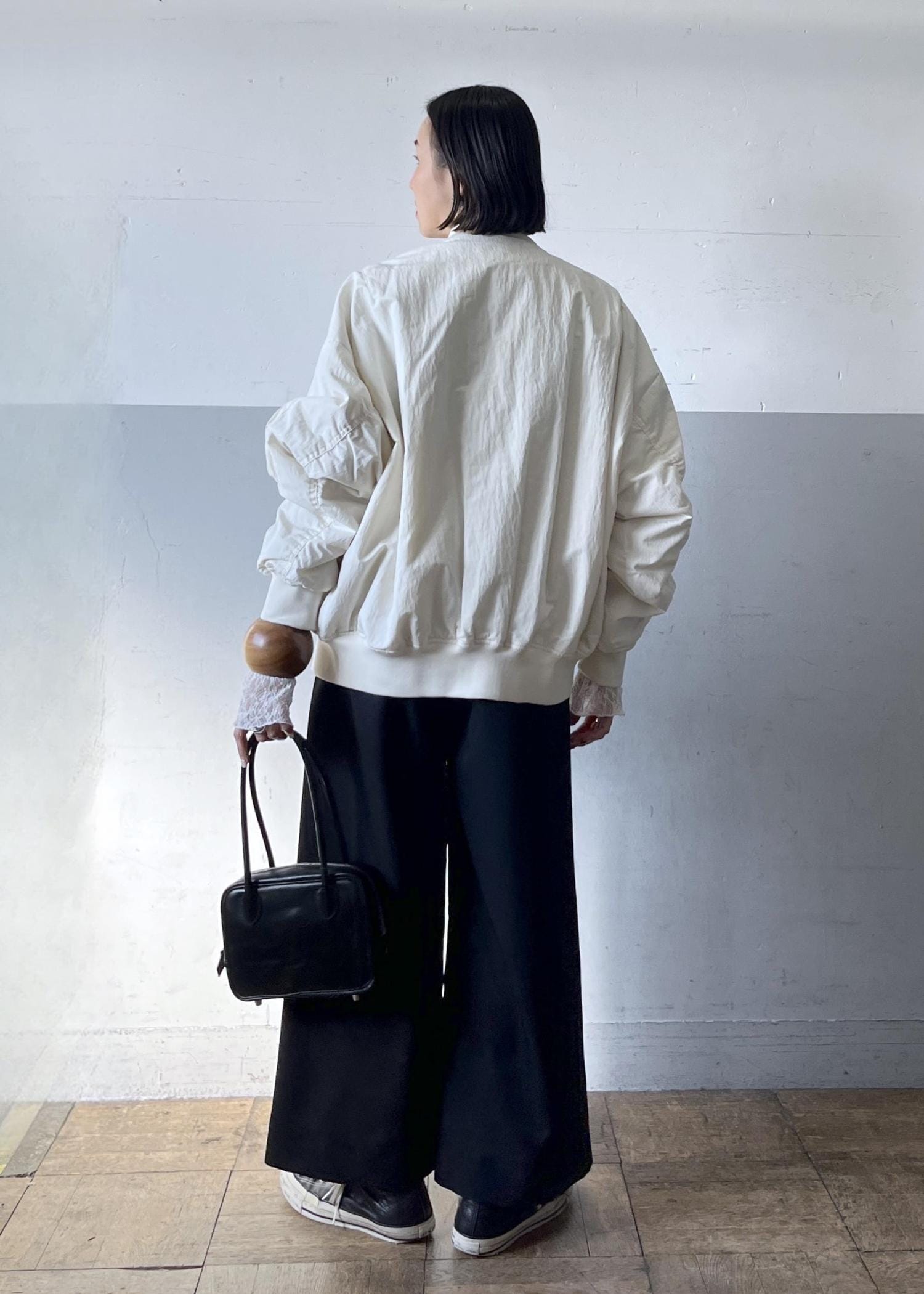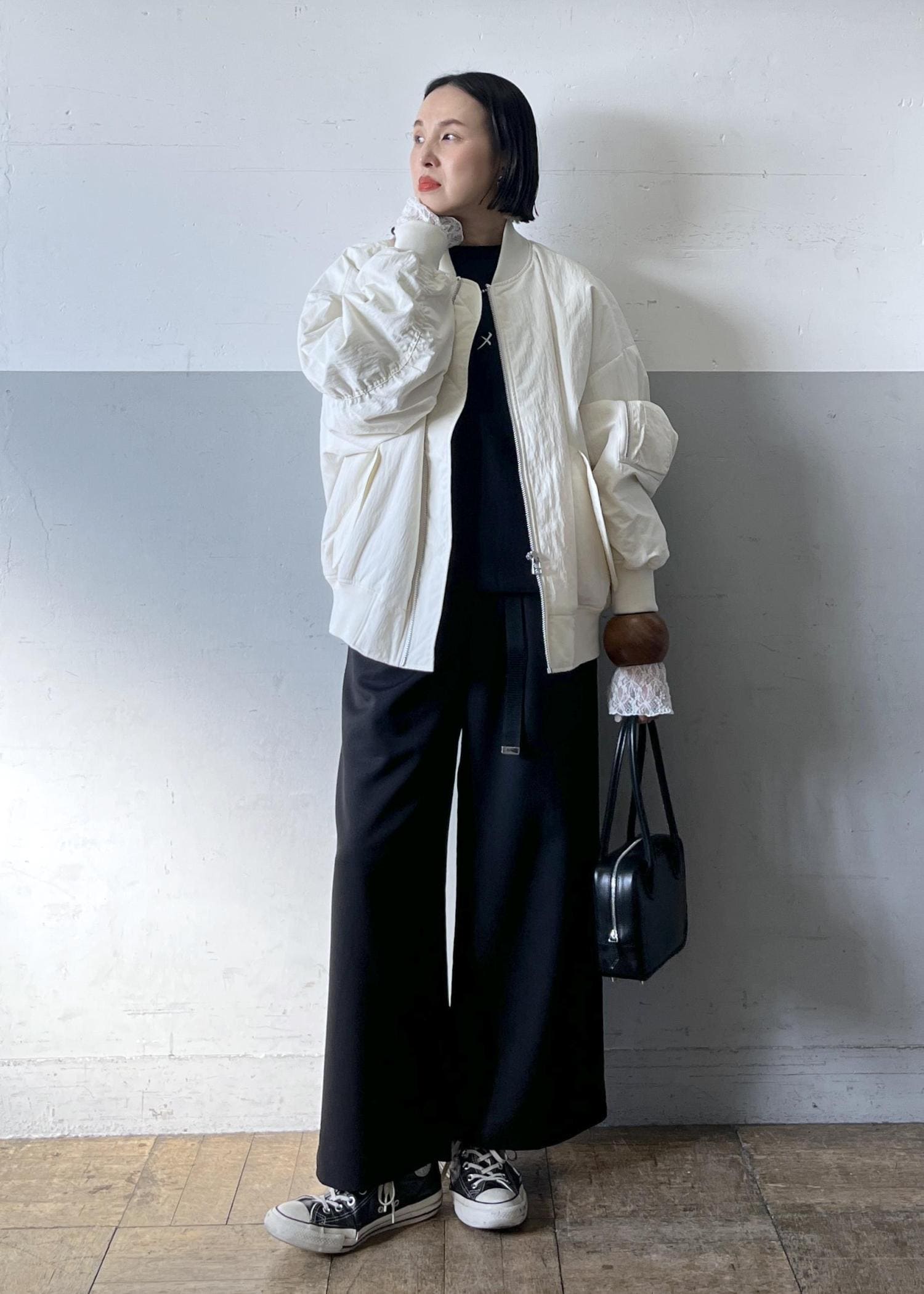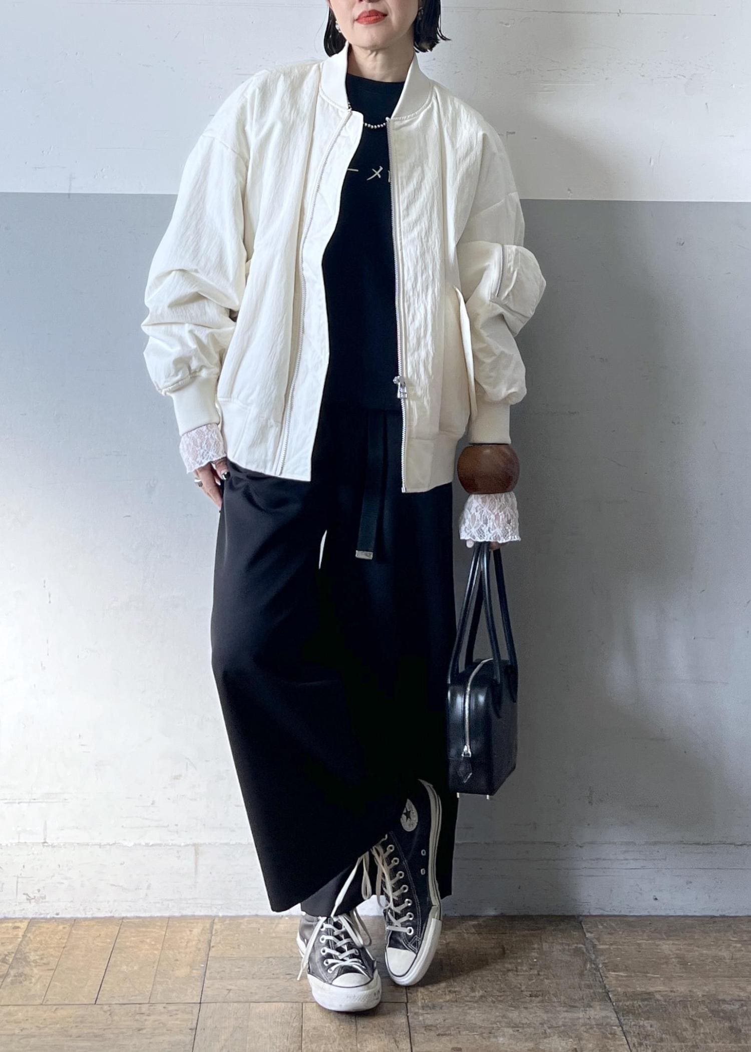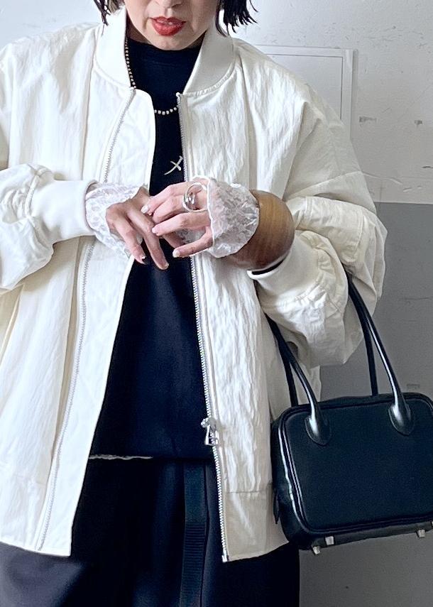 別注のprovokeのMA-1を主役に、ブラックでまとめたシンプルなモノトーンスタイルに、袖口からレースを覗かせて女性らしさをプラスした、大人の抜け感レイヤードです。
