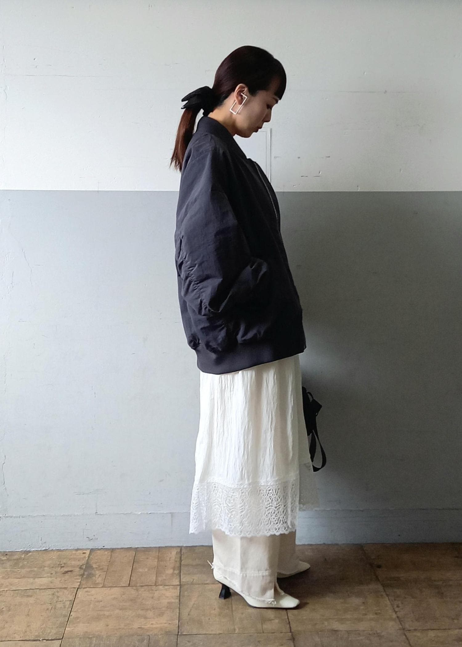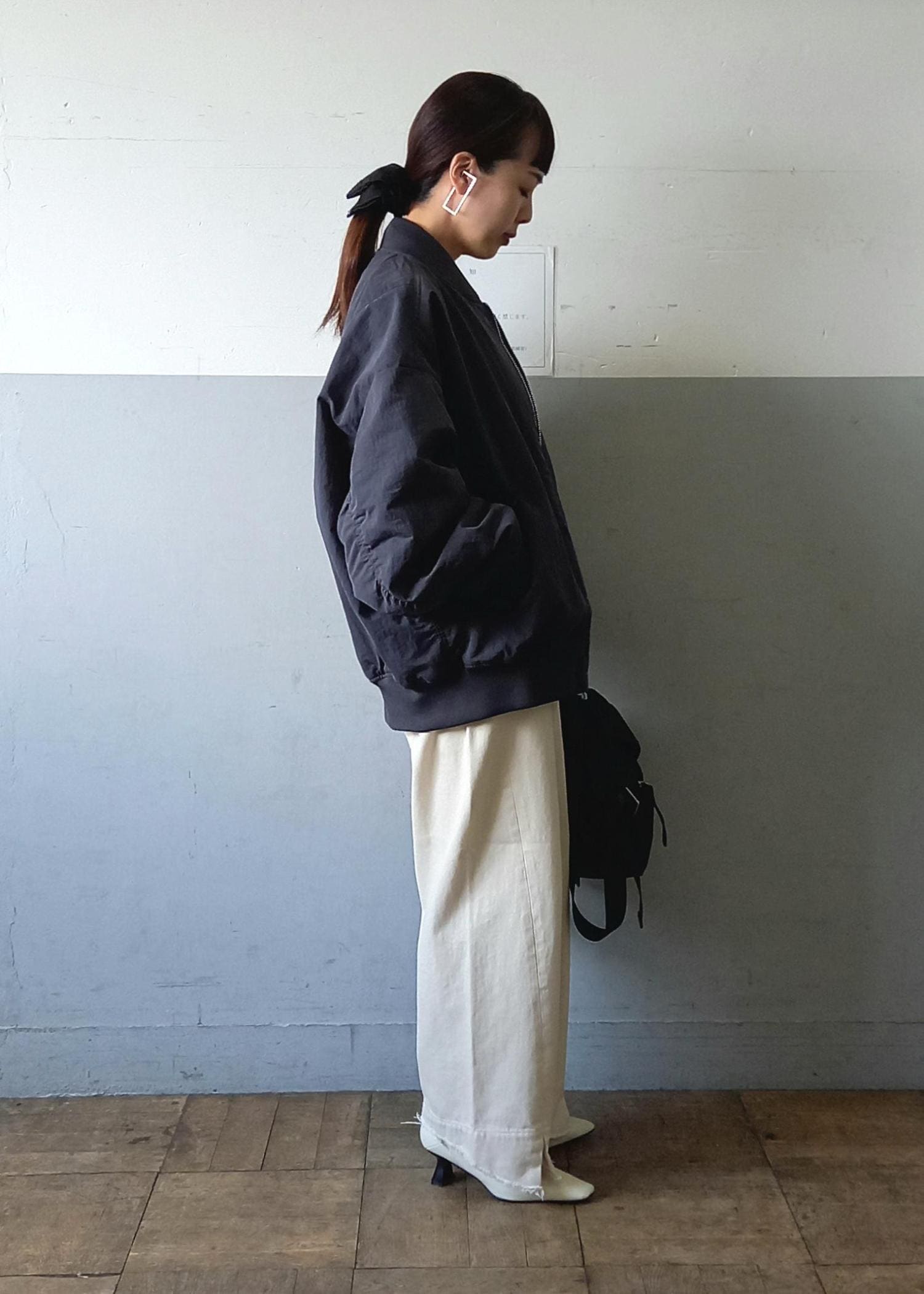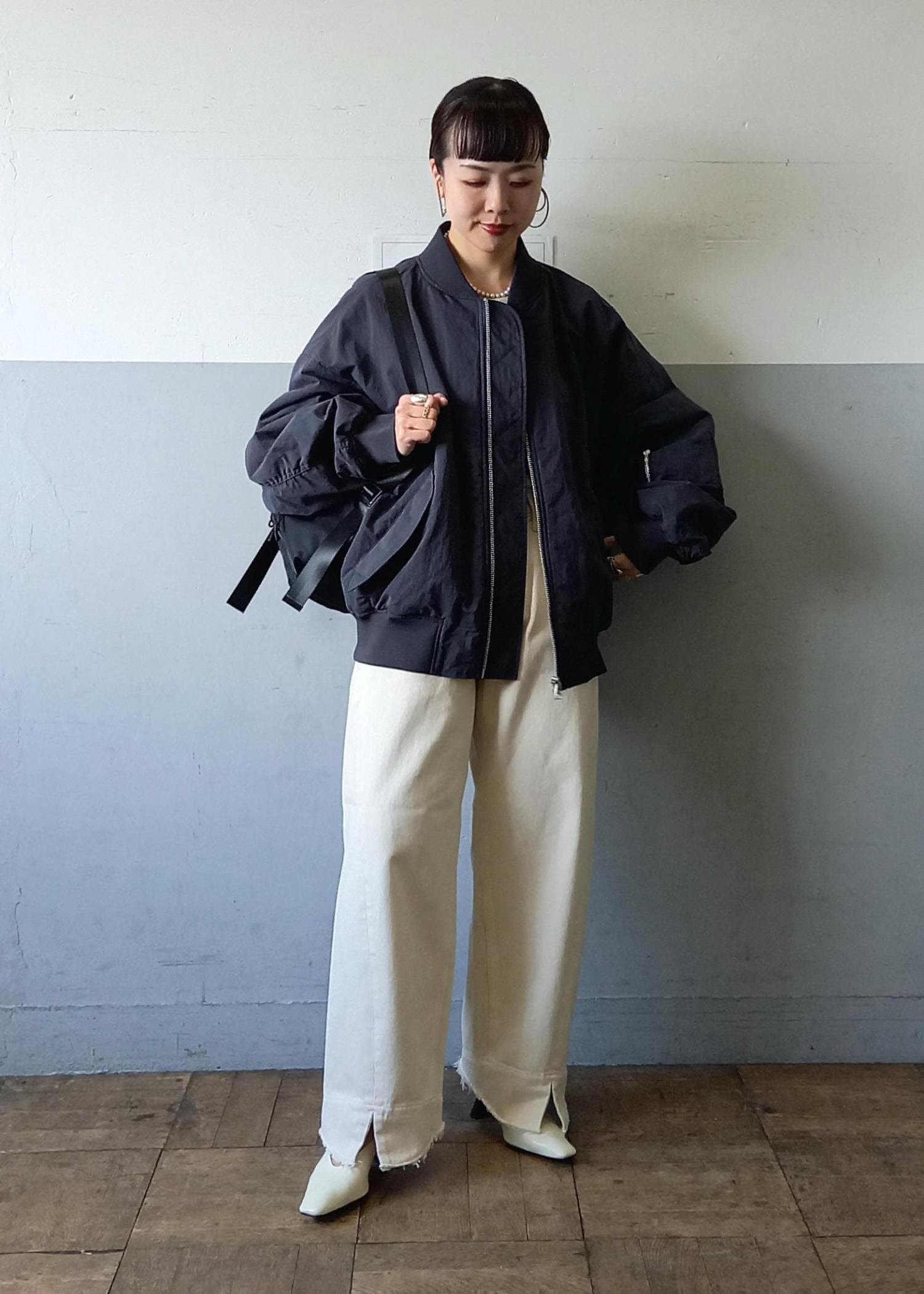 オーバーサイズのMA-1なので、レディライクなアイテムと合わせるのもオススメです◎