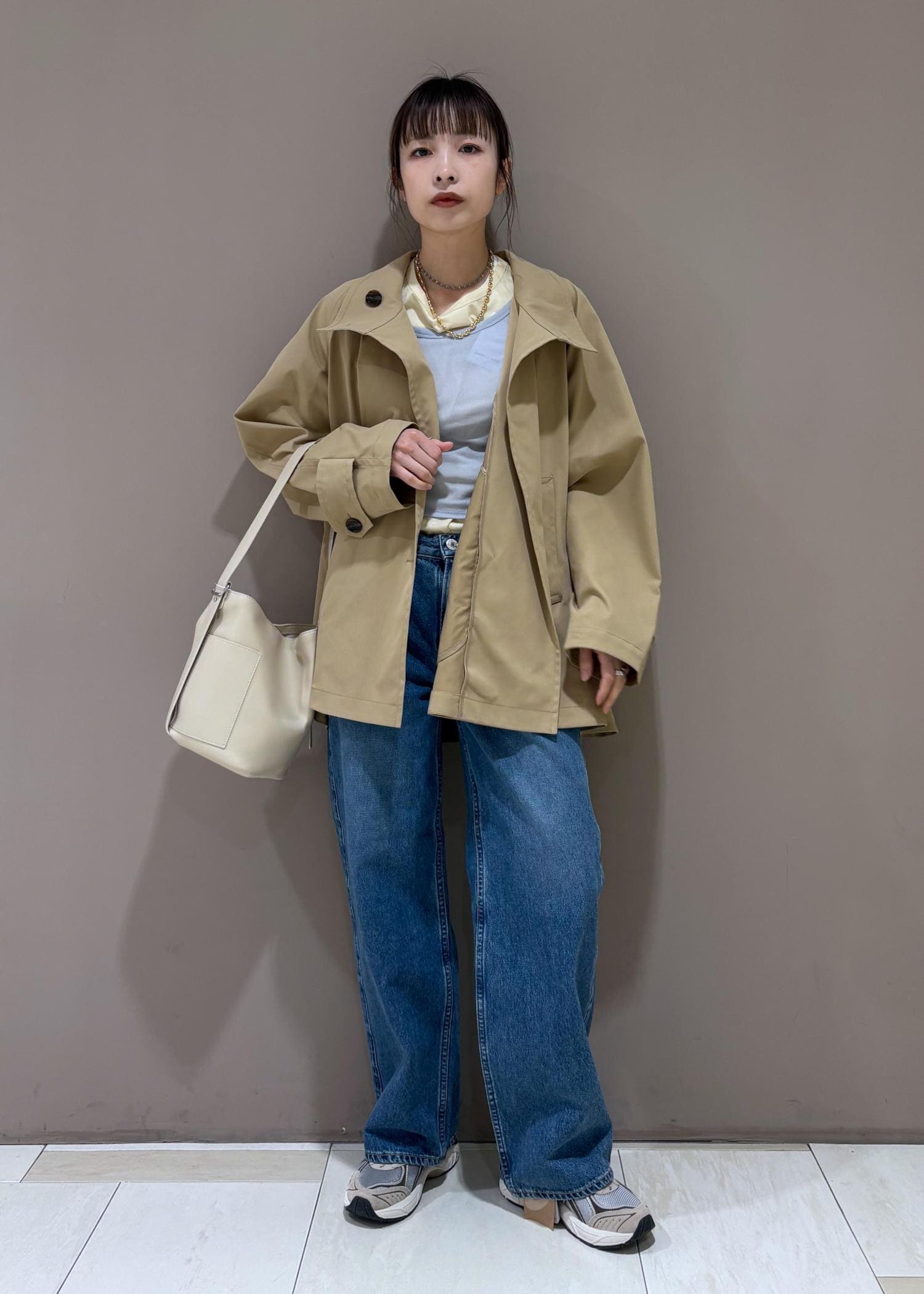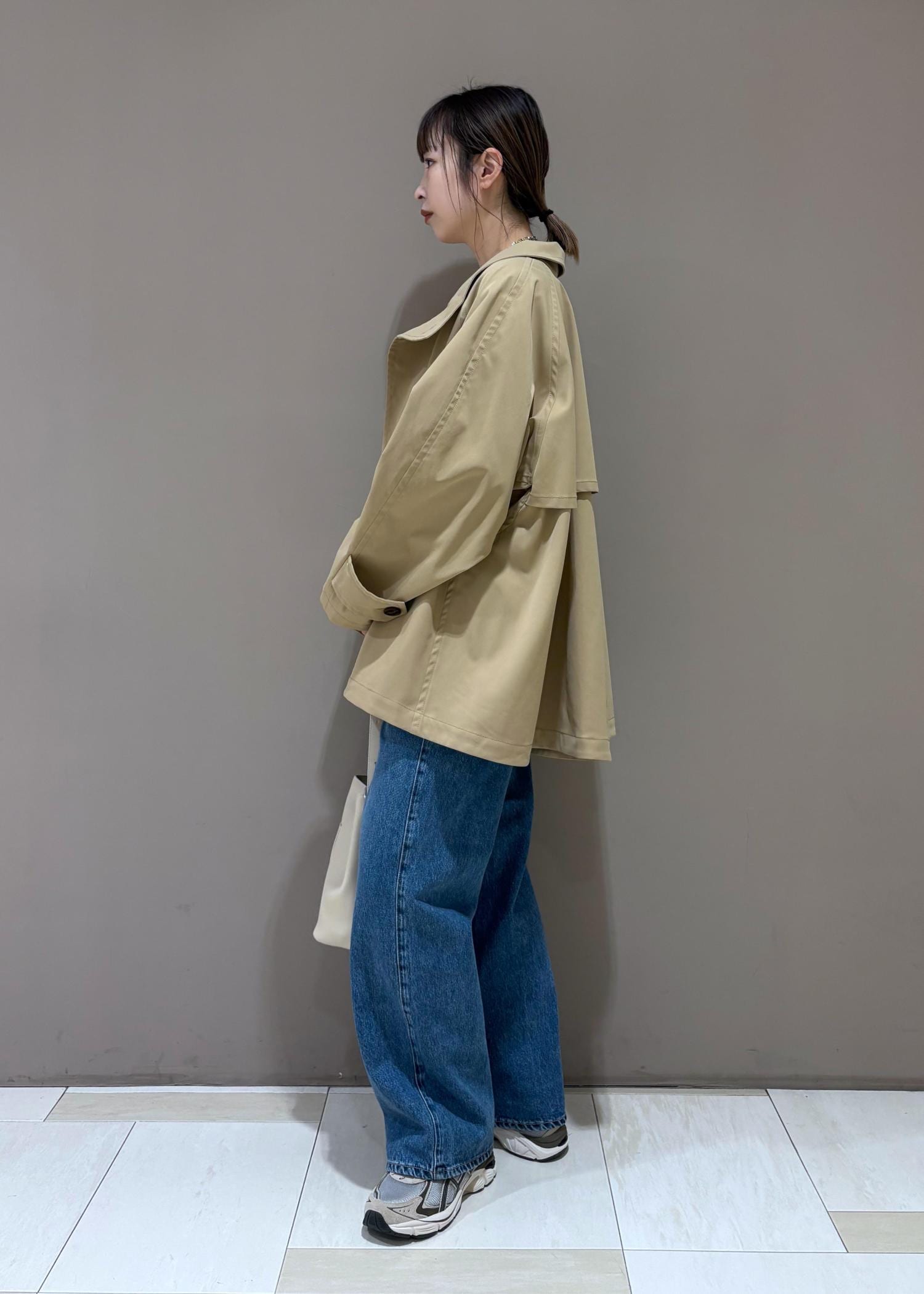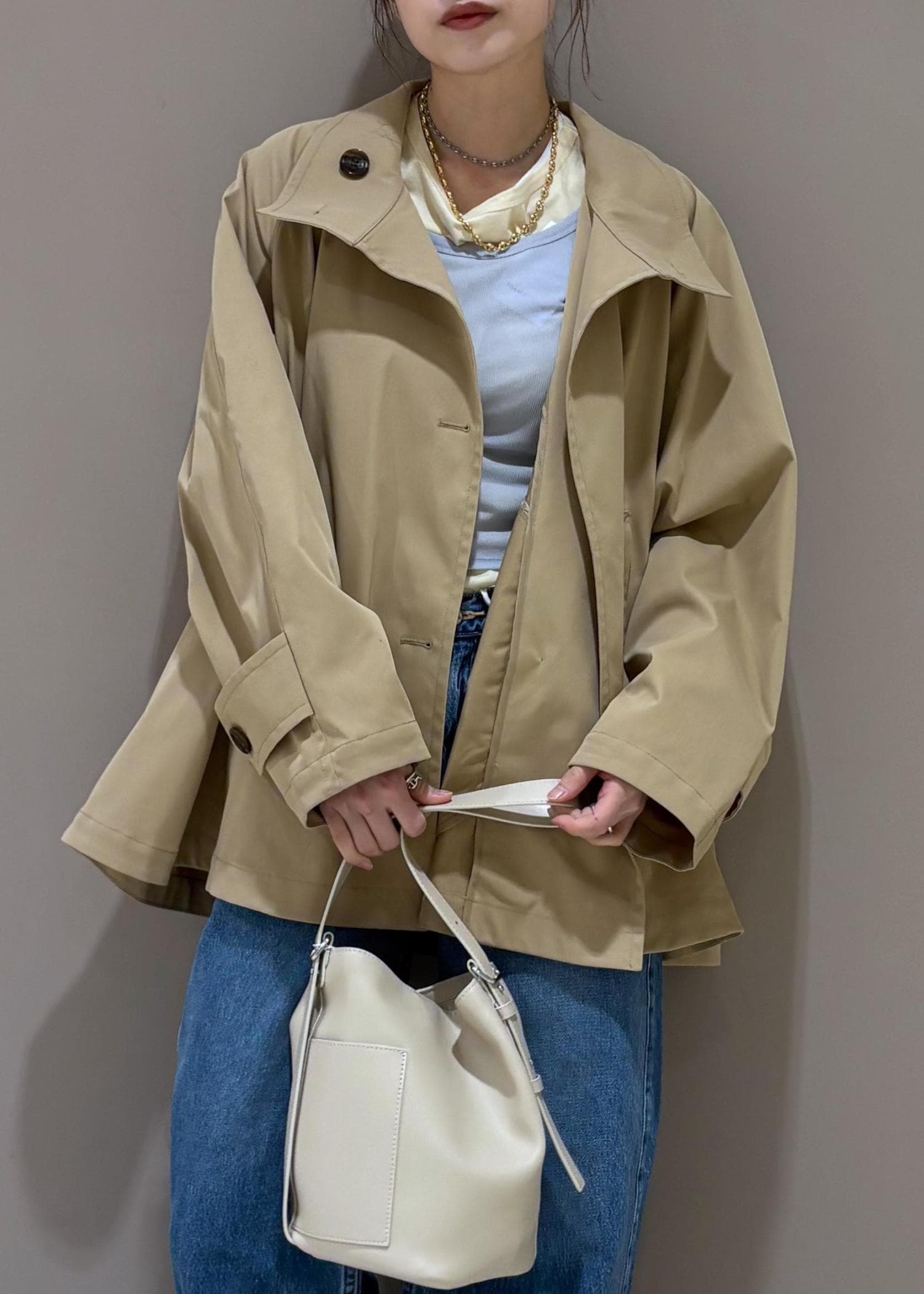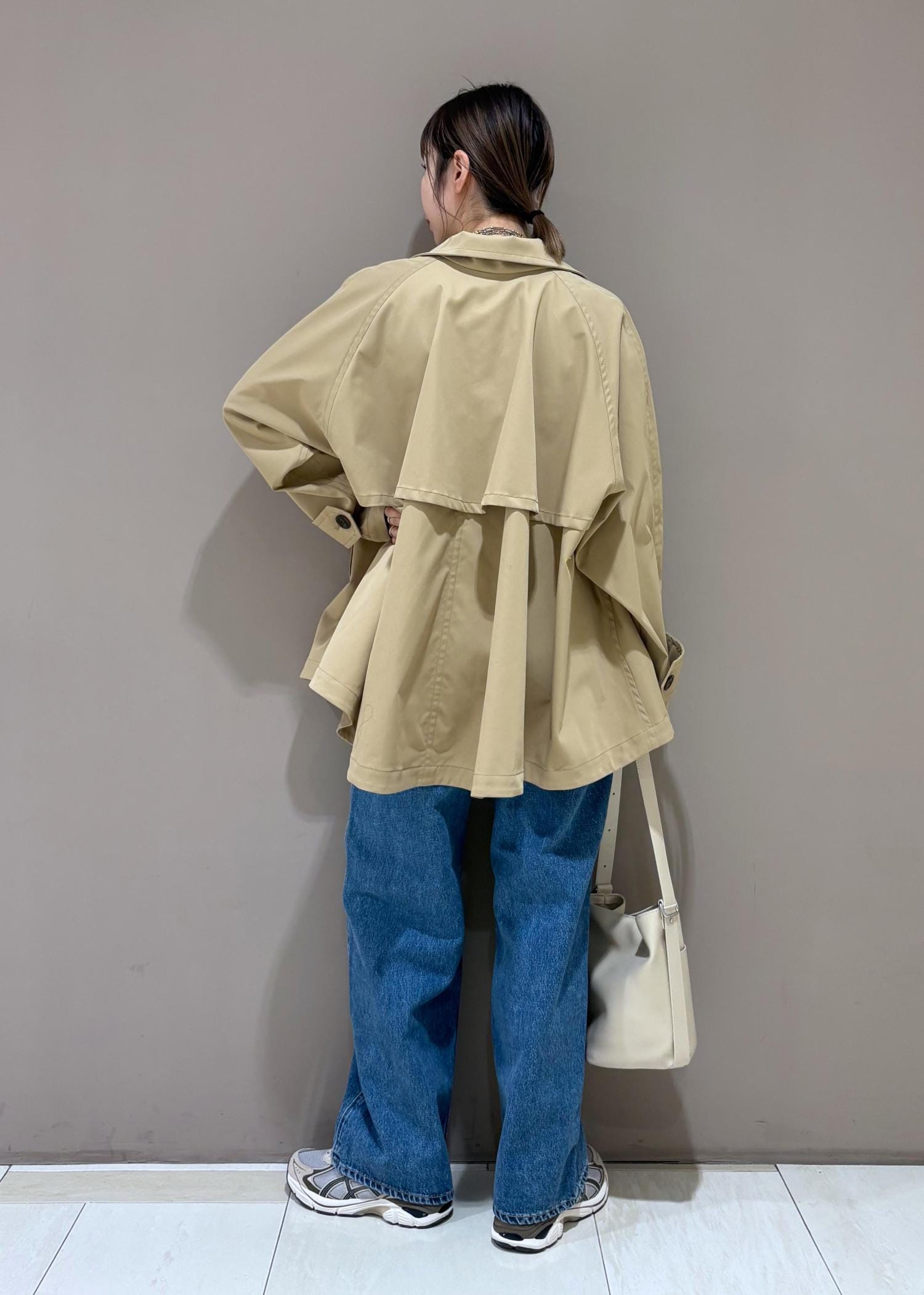 裾が広がったトレンチコート。