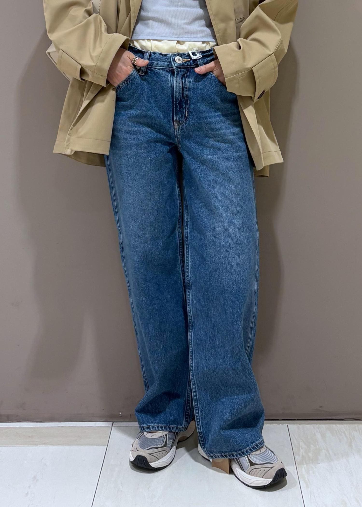 ウエストはやや大きめ、ロング丈のストレートデニム。