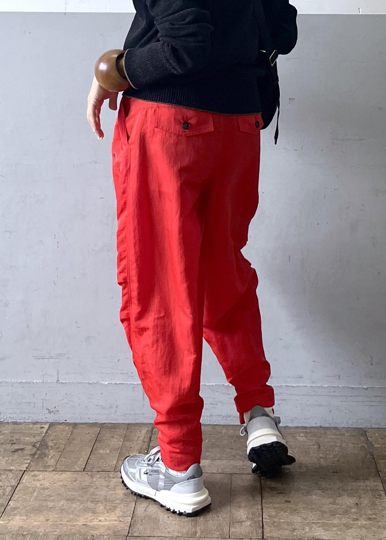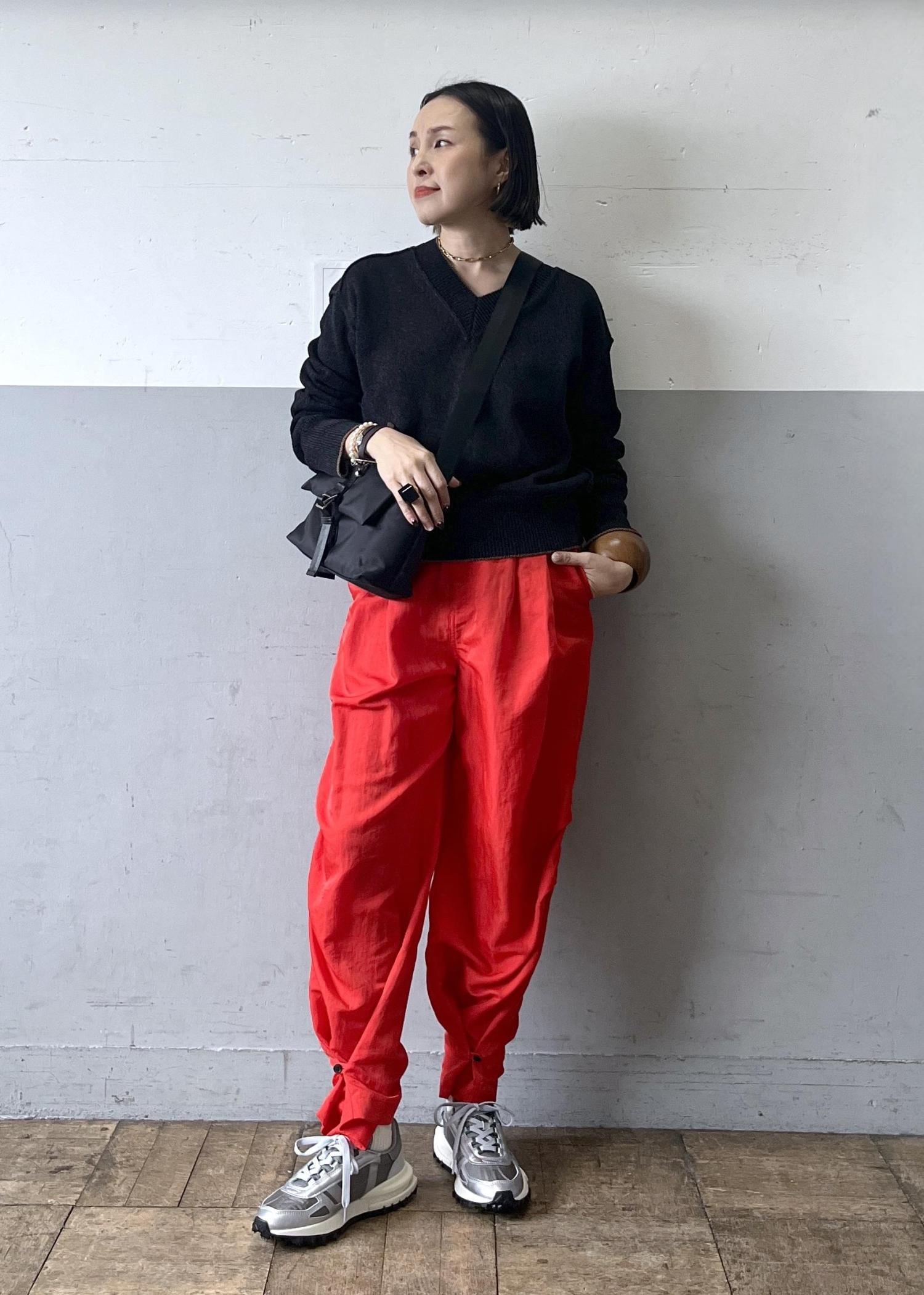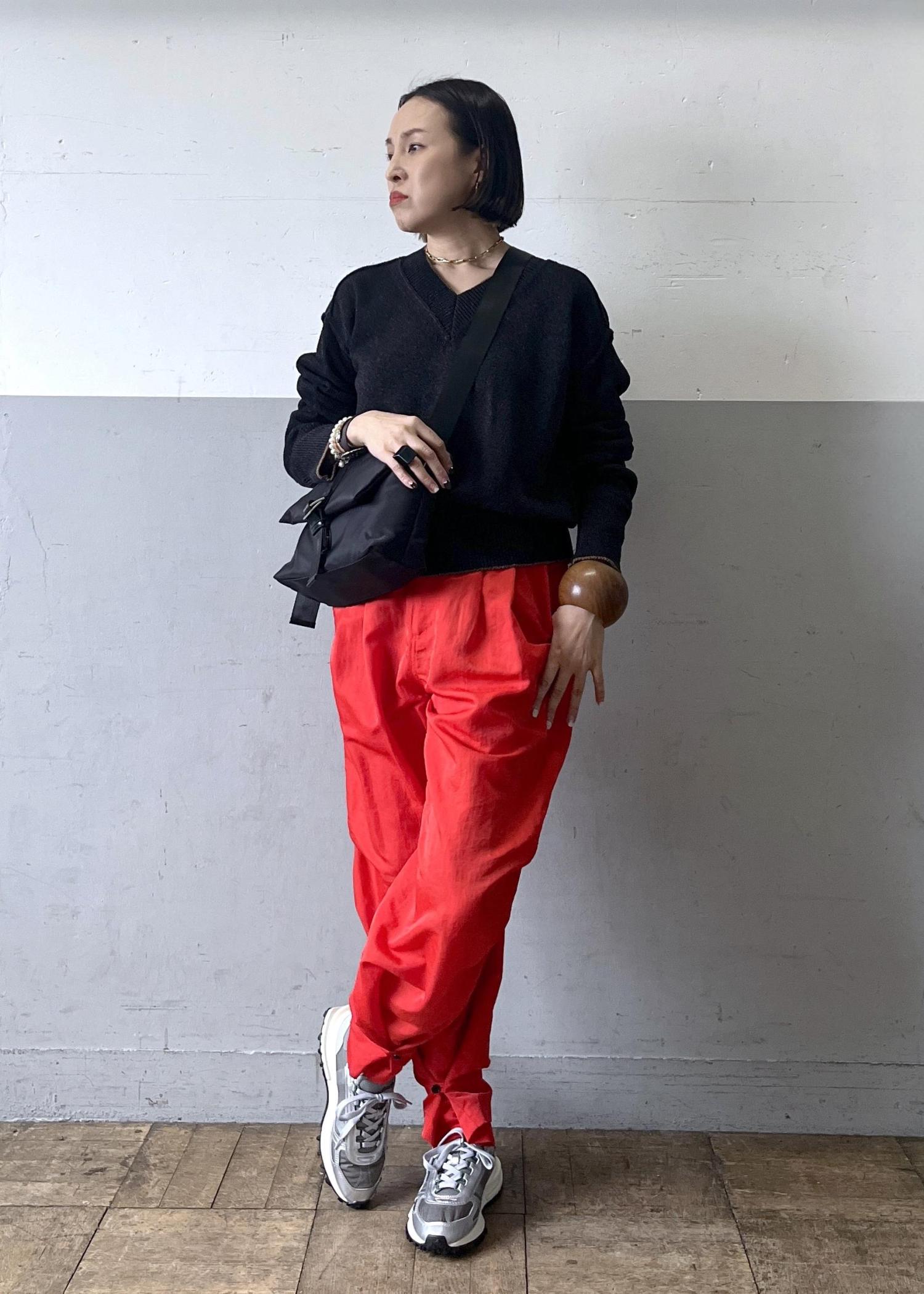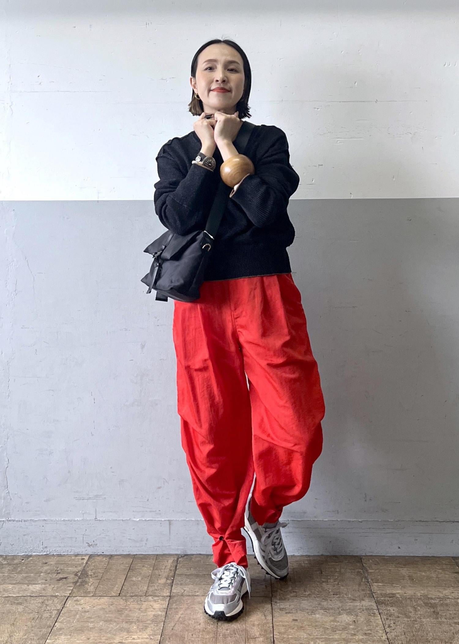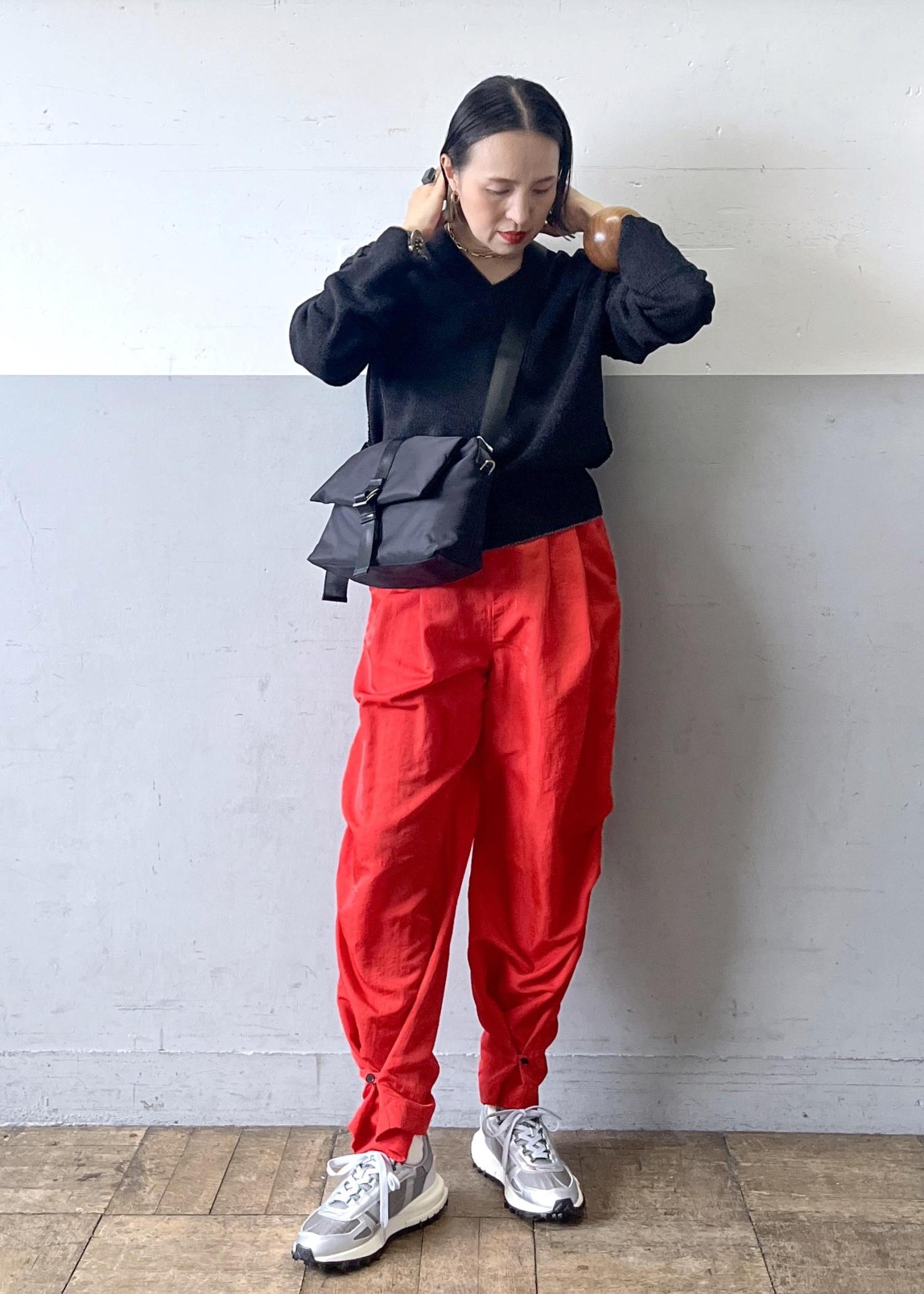 ドライタッチなペーパーヤーン素材のトップスを主役に、鮮やかな赤パンツを合わせたメリハリスタイル。