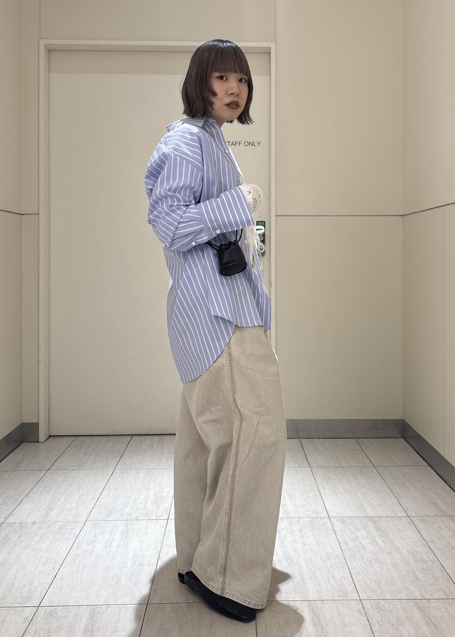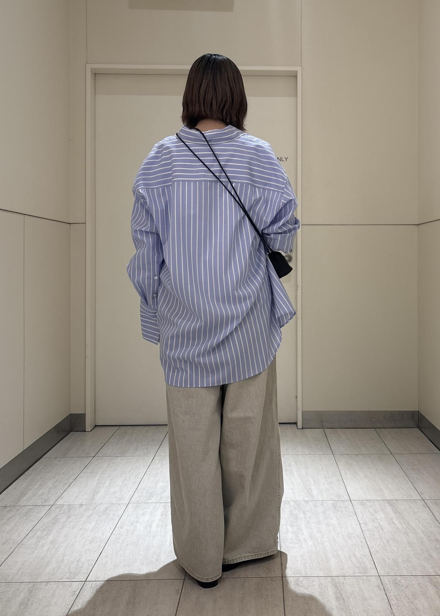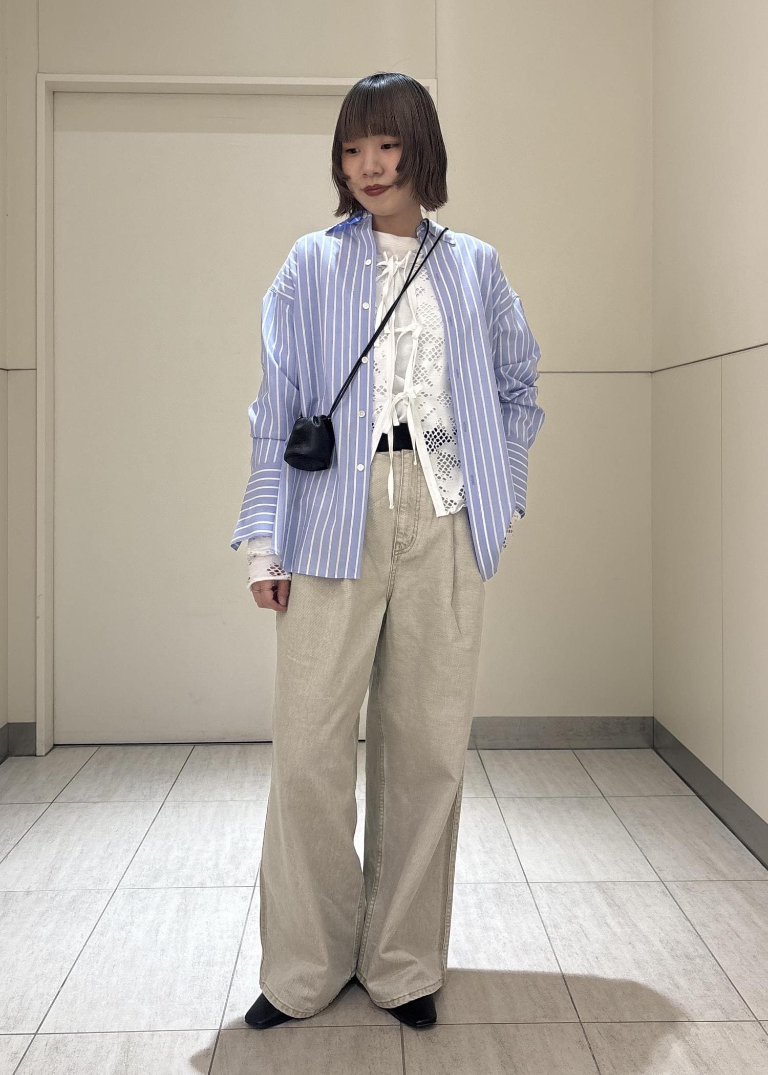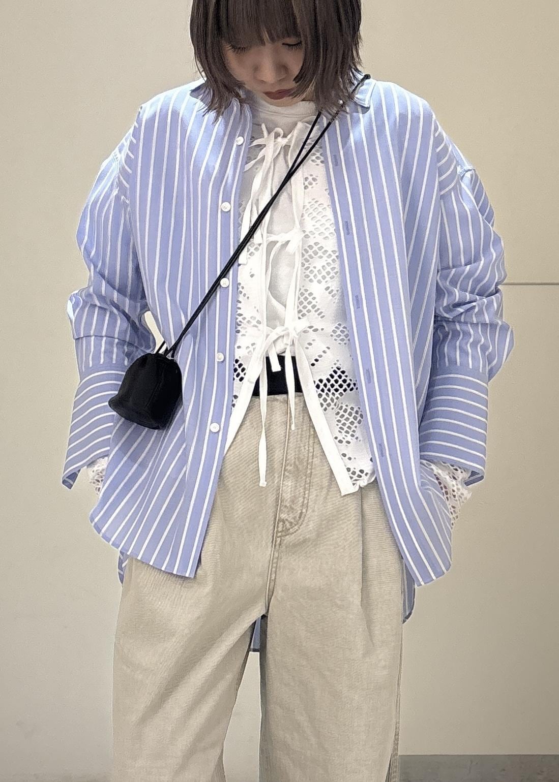 爽やかなストライプシャツにレースの透け感を重ねた、EMOELLEらしいミックススタイル。