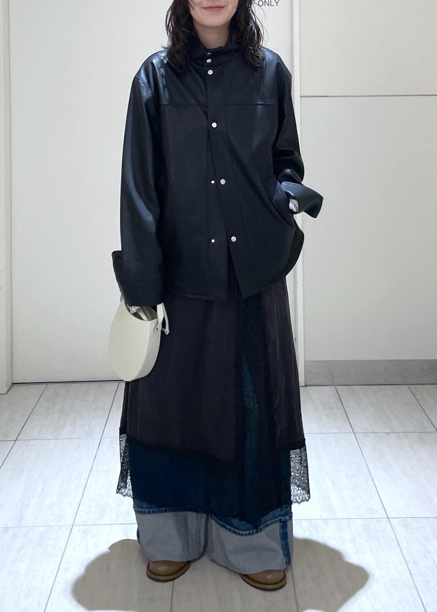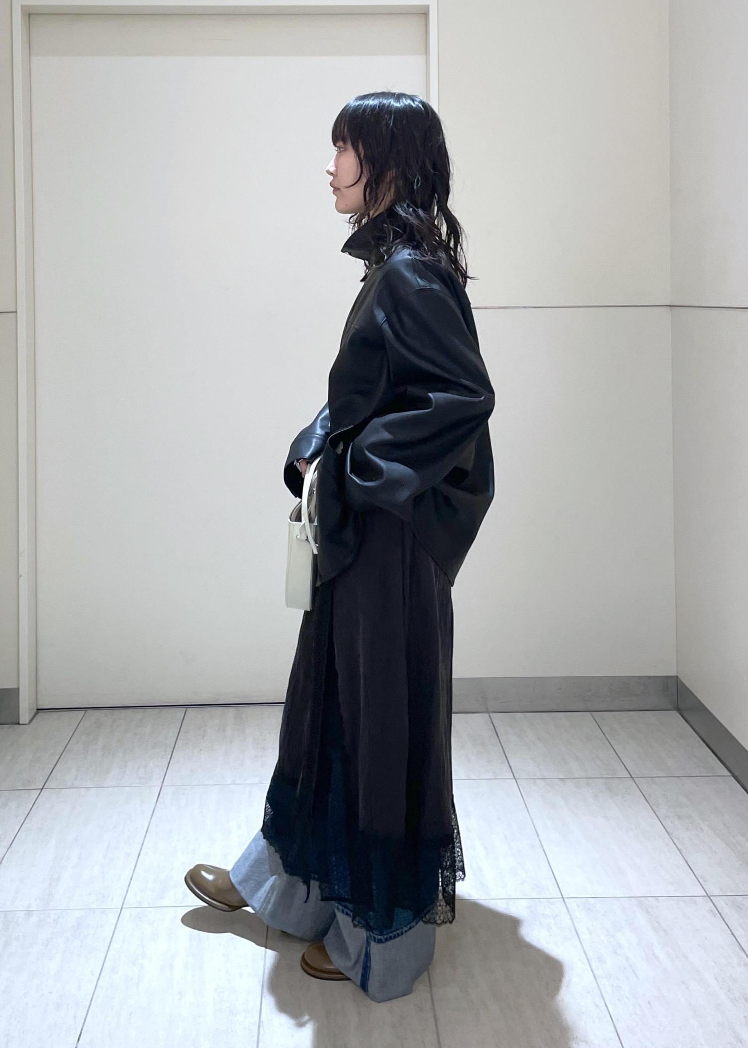 柔らかい生地でシャツ感覚で羽織れるのが特徴のレザーブルゾンです。スタンドネックにして少しモードな感じにさせたかったので黒をメインにコーデを組んでみました〜!